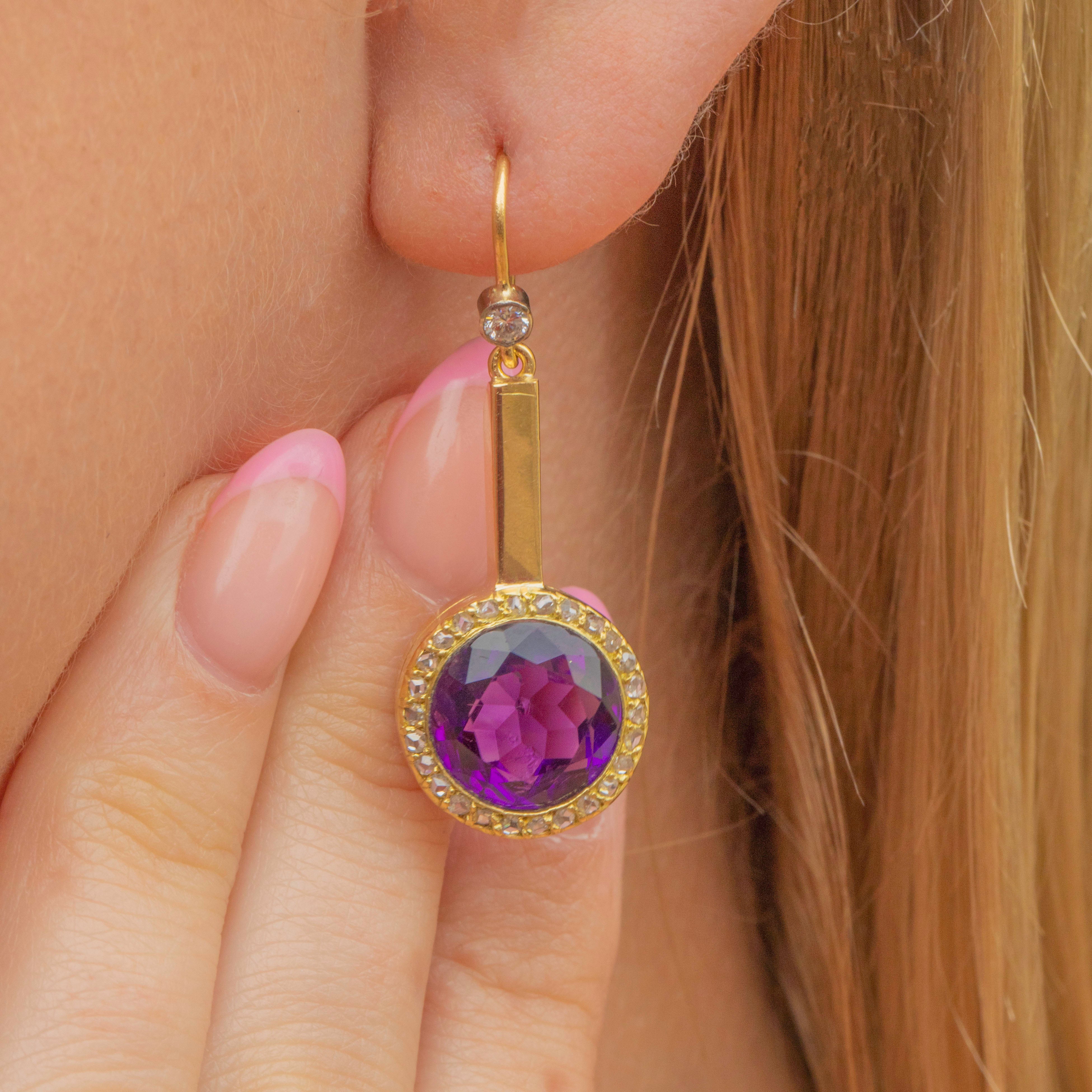 Each earring features a vivid Siberian Amethyst centre with the most intense rich and noble purple hue, in a halo of twinkling Rose-cut-Diamonds. They nestle into buttery 18ct Gold settings and fall pendulously with just the right amount of swing and movement to feel (and look) amazing!