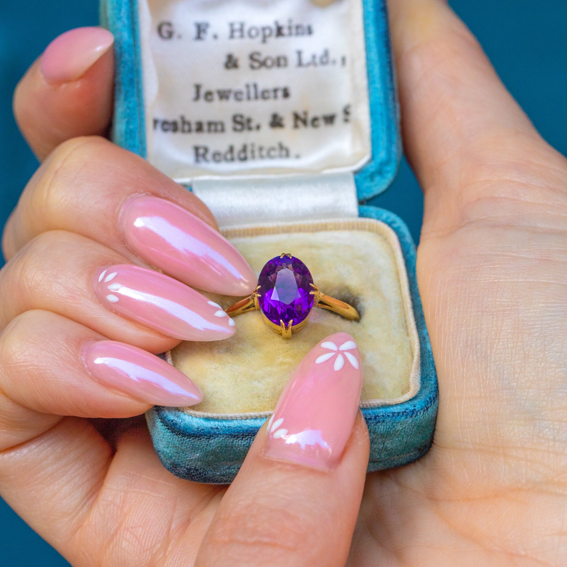 Bring a touch of regal allure to your repertoire with this striking antique 18ct Gold Amethyst ring! Displayed within split claw settings, the deep purple Amethyst takes centre stage glimmering with crisp facets as it catches the light.
