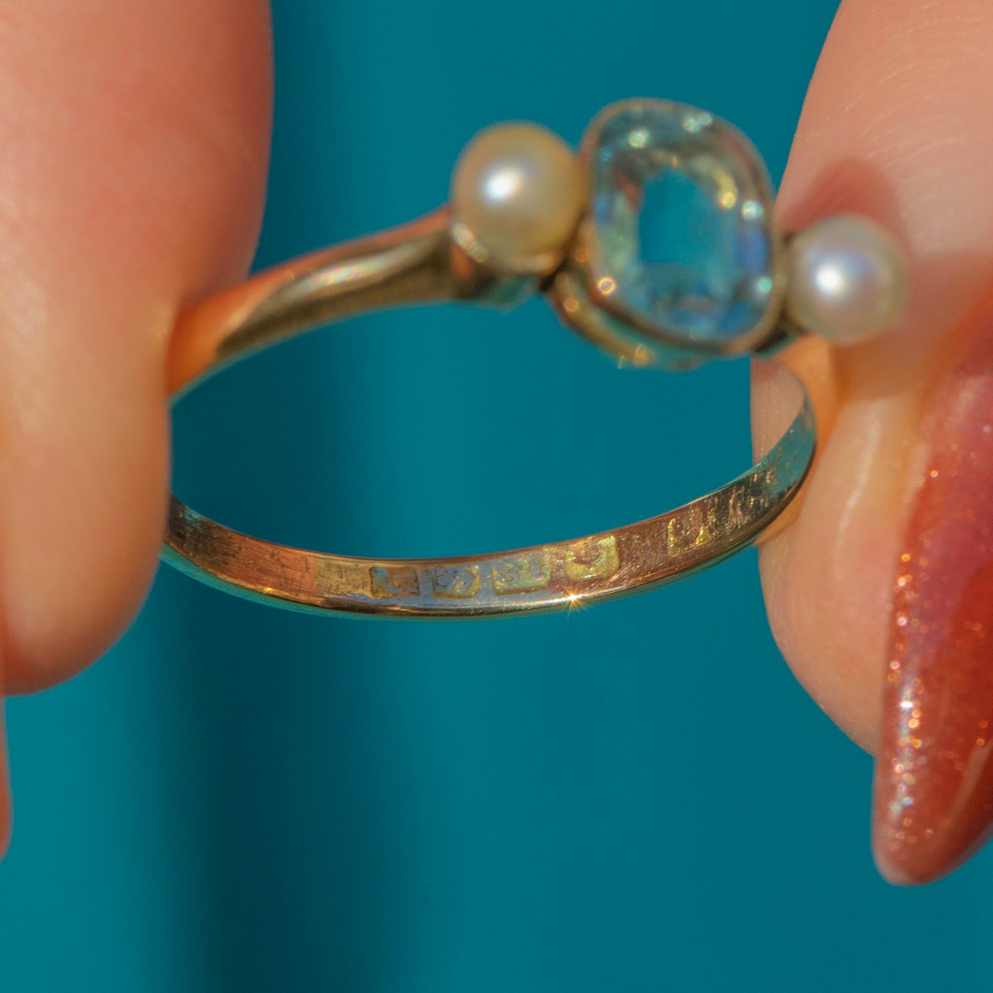 VERY GOOD. This antique 18ct Gold Aquamarine and Pearl three stone ring is in very good condition. Each gemstone is beautiful and sits securely within its setting. One Pearl is slightly duller than the other, commensurate with age. There are some signs of wear on the inside of the band, but there is no evidence of resizing. Considering her age, she is in lovely condition and would make a superb addition to your collection!