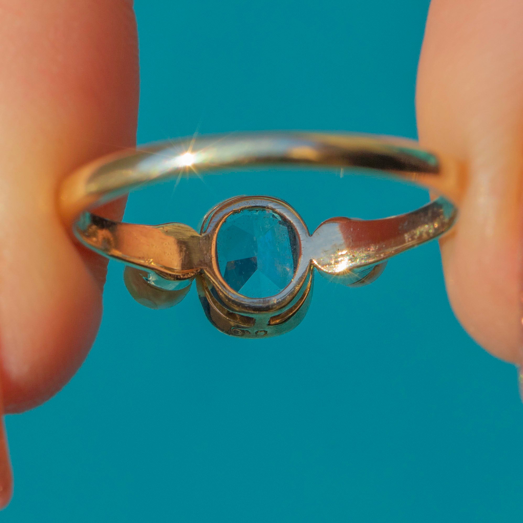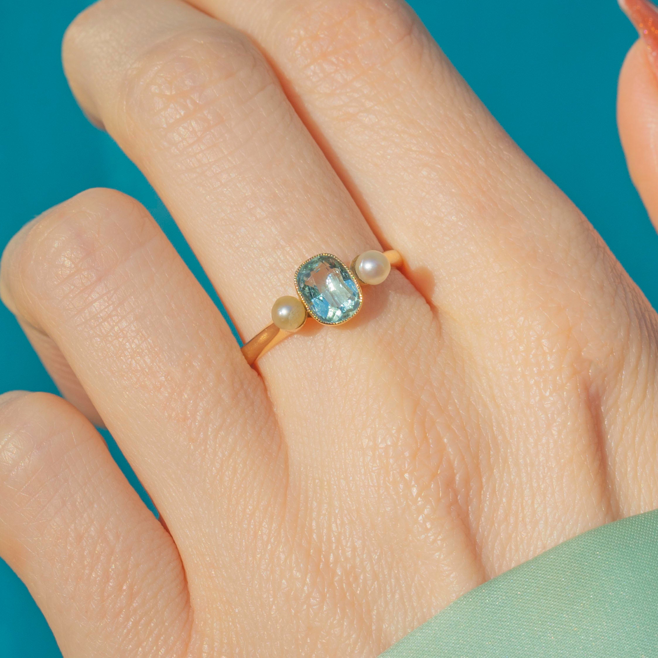 In her centre sits a 1.90ct icy blue Aquamarine, with soft hues akin to a spring morning sky. She is flanked by two iridescent Pearls, their creamy tones effortlessly complementing the Aquamarine. Each antique gemstone is married by the warmth of their buttery 18ct Gold bezels and shank, together forming an elegant and sophisticated piece.