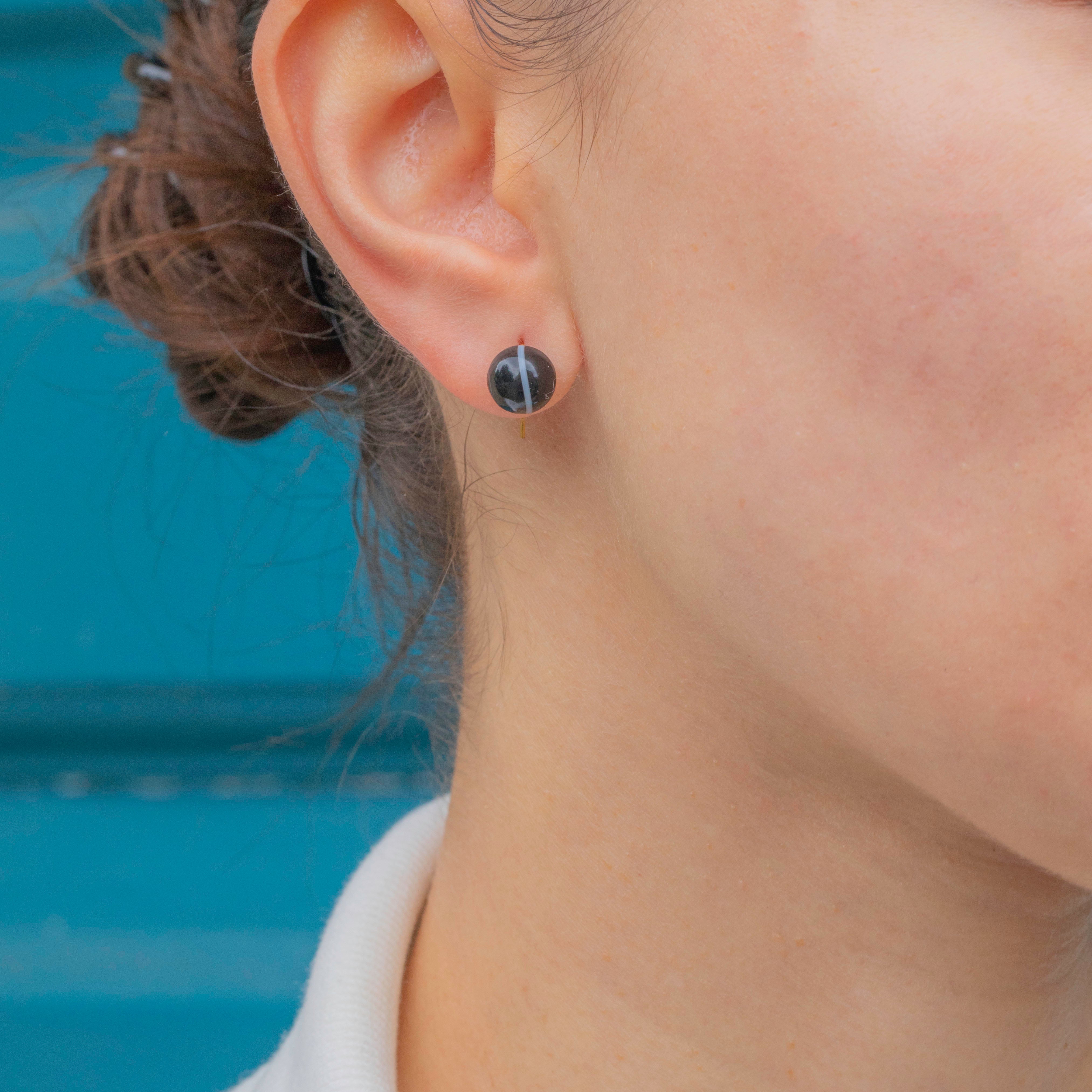 Suspending a jet black Agate cabochon, each adorned with a striking creamy white band across its surface, these dainty earrings suspend from your lobes like little planets full of celestial charm!