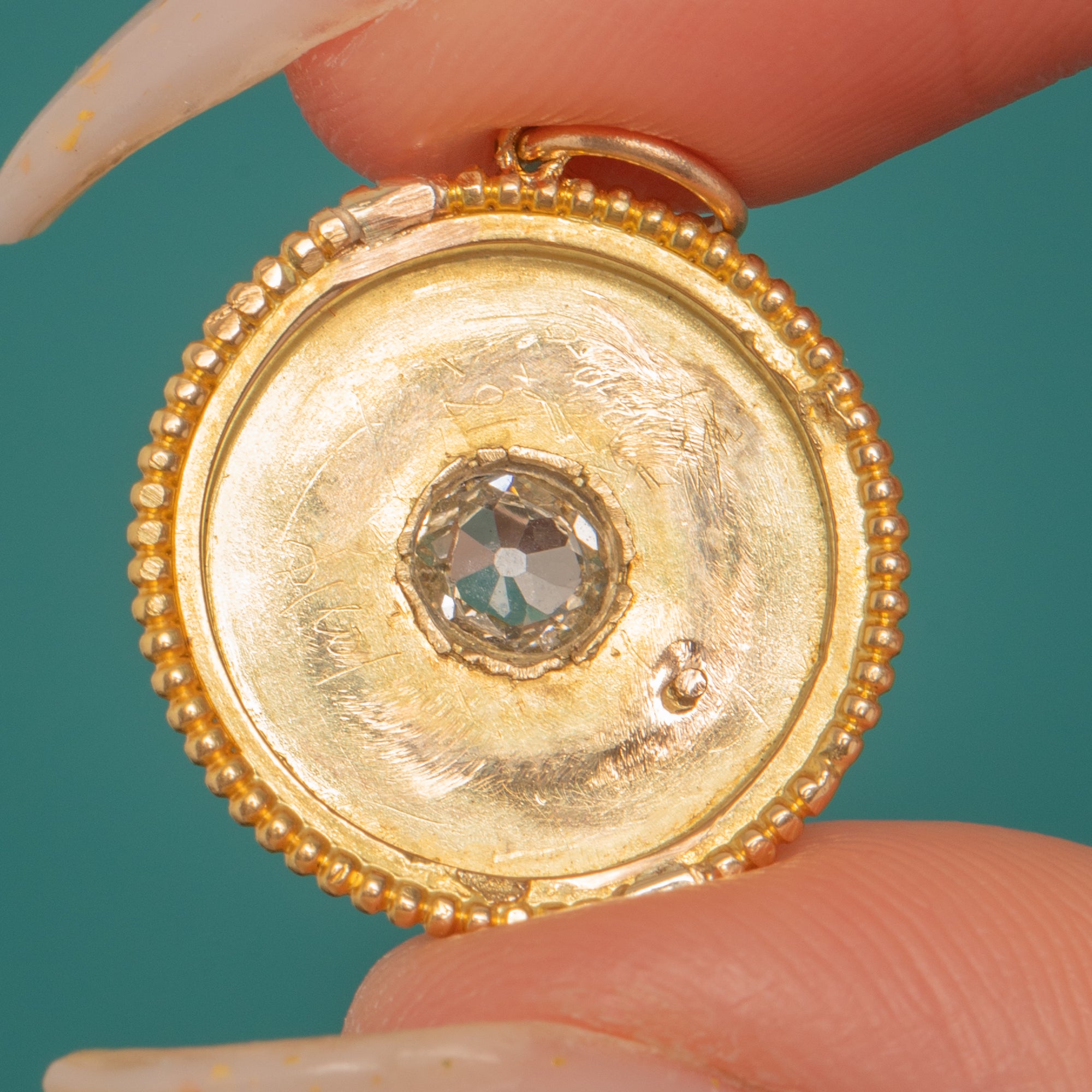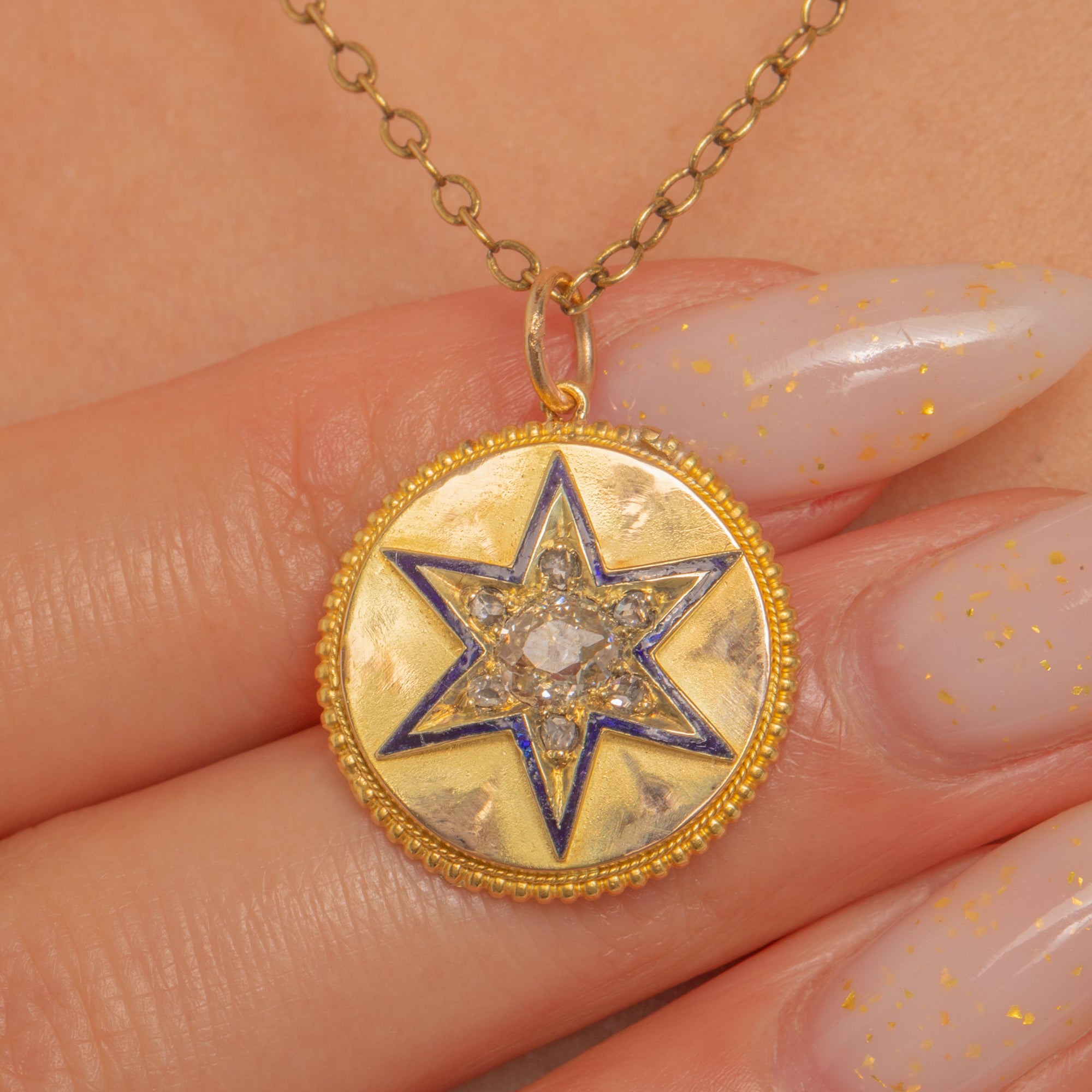 A luminous Victorian 18ct Gold disc pendant, its celestial starburst traced in rich Blue Enamel and framed by a refined beaded rim. At the heart glows a 3.5mm old mine cut Diamond of approximately 0.17ct, with glinting rose-cut Diamonds forming the radiant “arms” of the star.