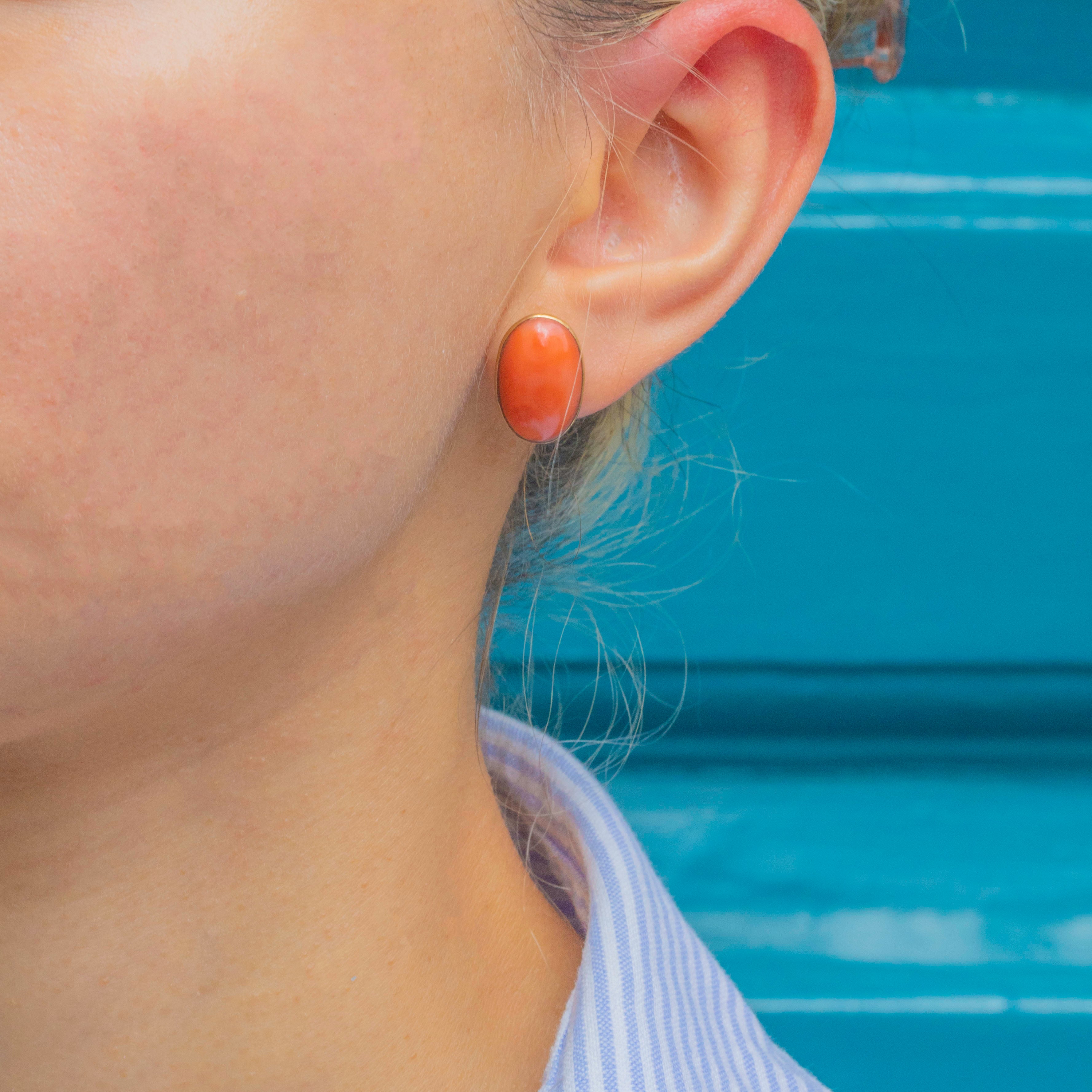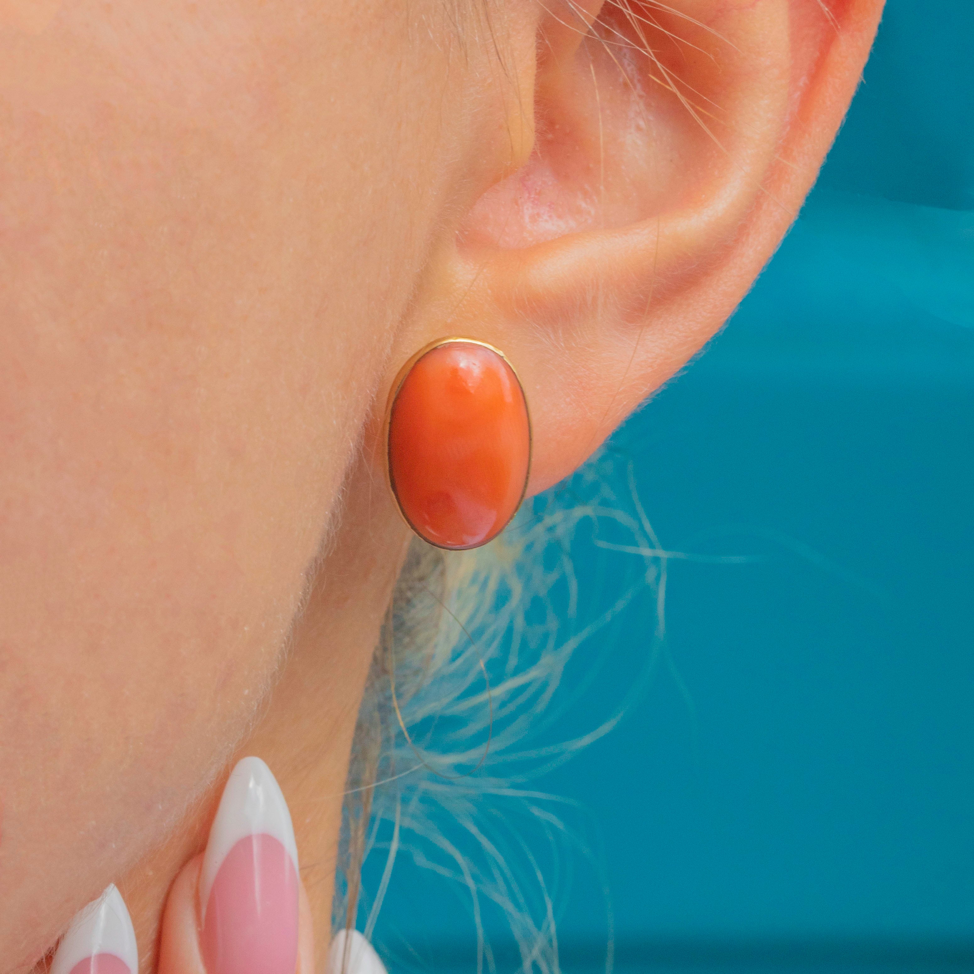 EXCELLENT: The rich orange Coral cabochons are smooth, polished, and free from chips or cracks. The bezel settings securely hold the stones and exhibit a warm, well-preserved yellow gold tone with minimal surface wear. The earrings maintain their classic shape and show no signs of repair or damage.