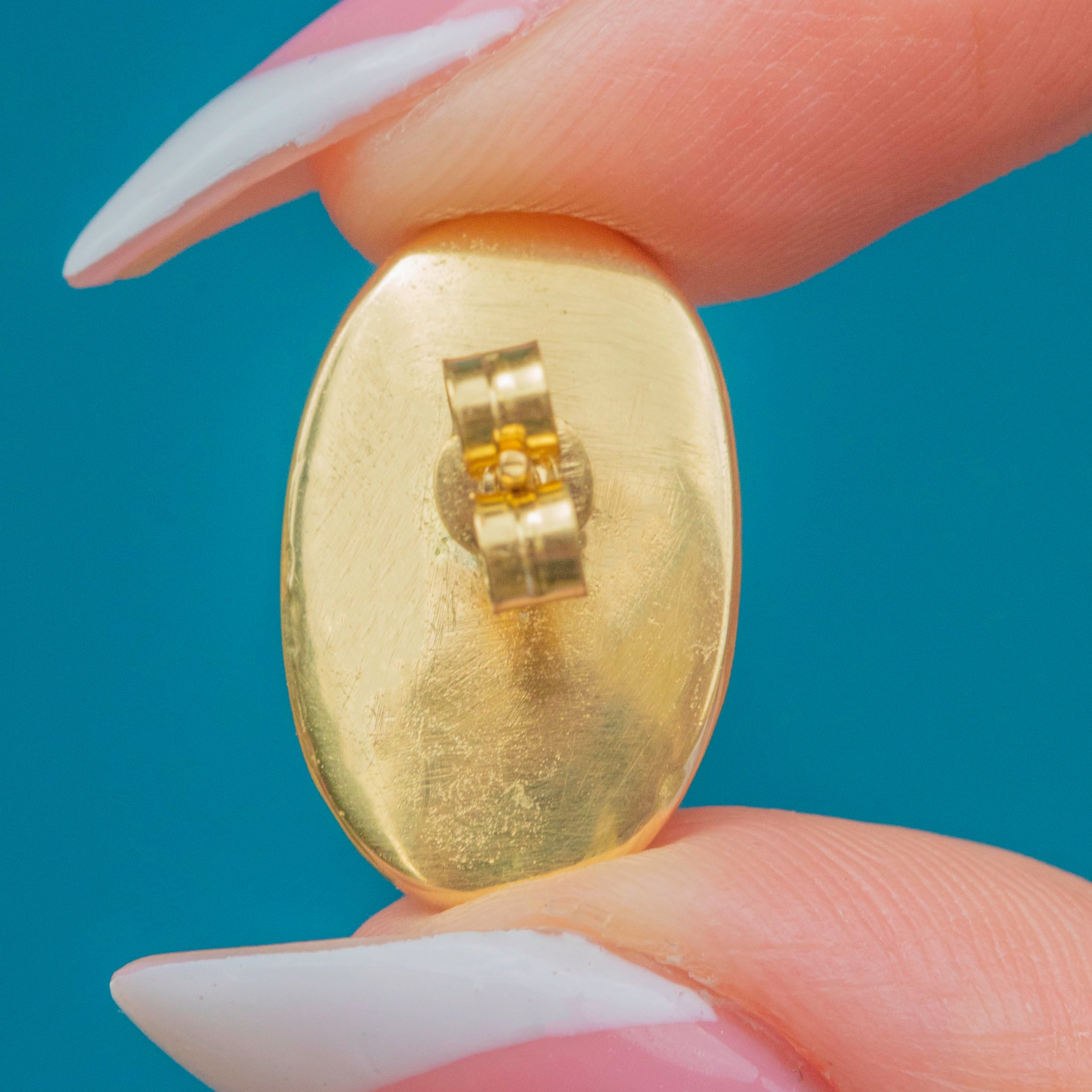 These Antique Victorian stud earrings feature rich orange Coral cabochons with smooth, polished oval cuts. The Corals are bezel-set in 18ct Gold, their warm tones beautifully complemented by the rich yellow hue of the setting. Simple yet striking, these studs showcase the natural beauty of Coral and the refined elegance of 19th-century craftsmanship.