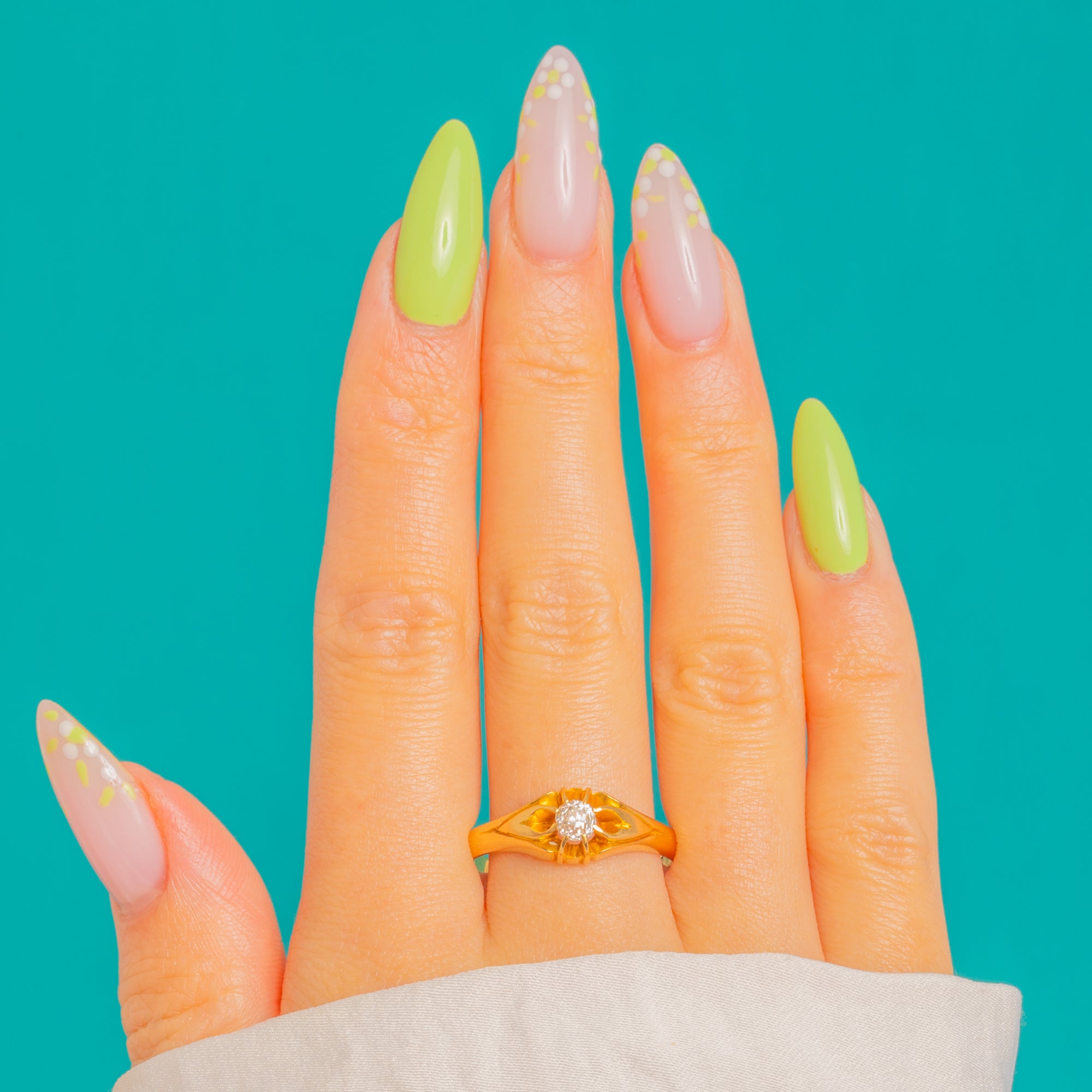 MATERIALS: Tests as 18ct Gold, Old mine Diamond (0.25ct).