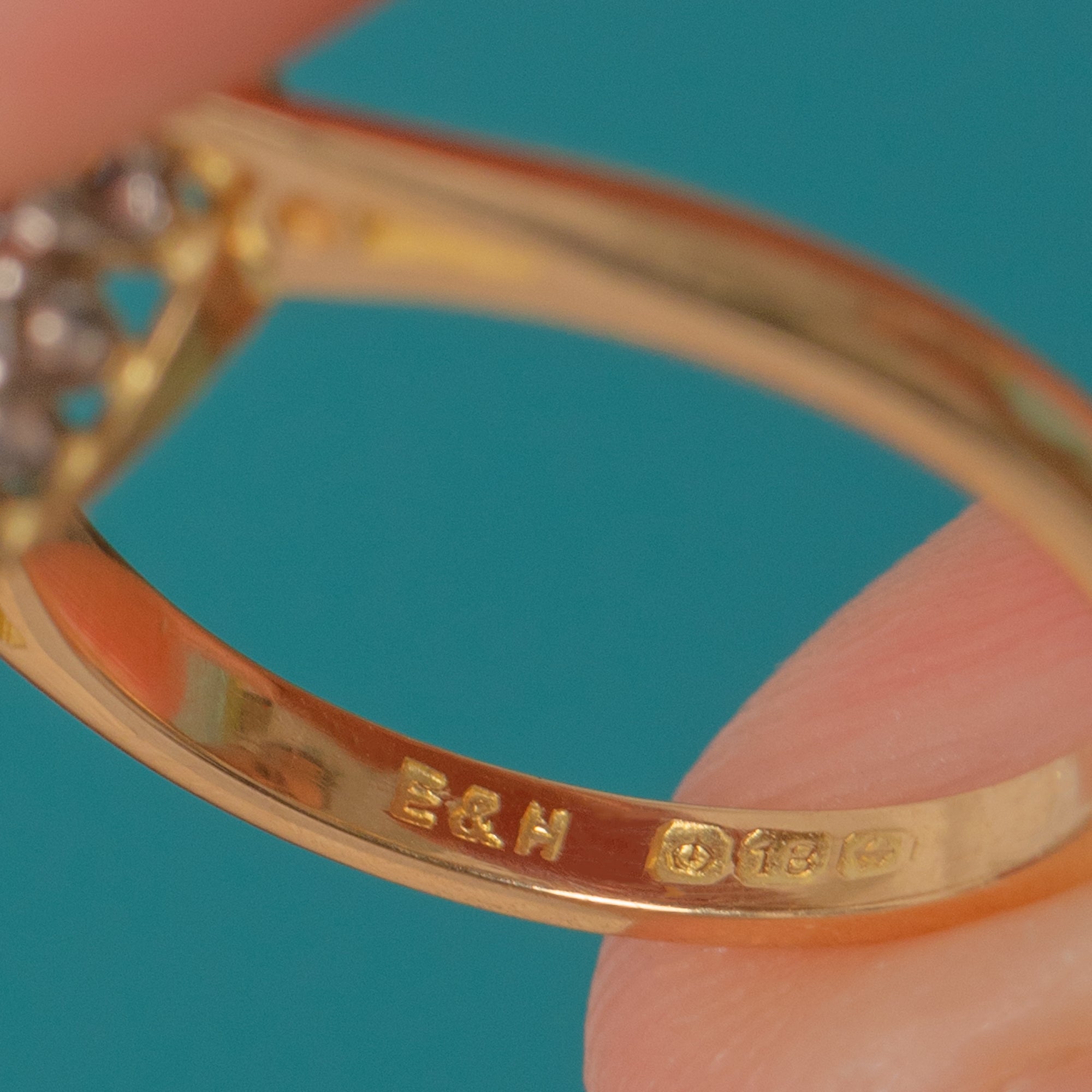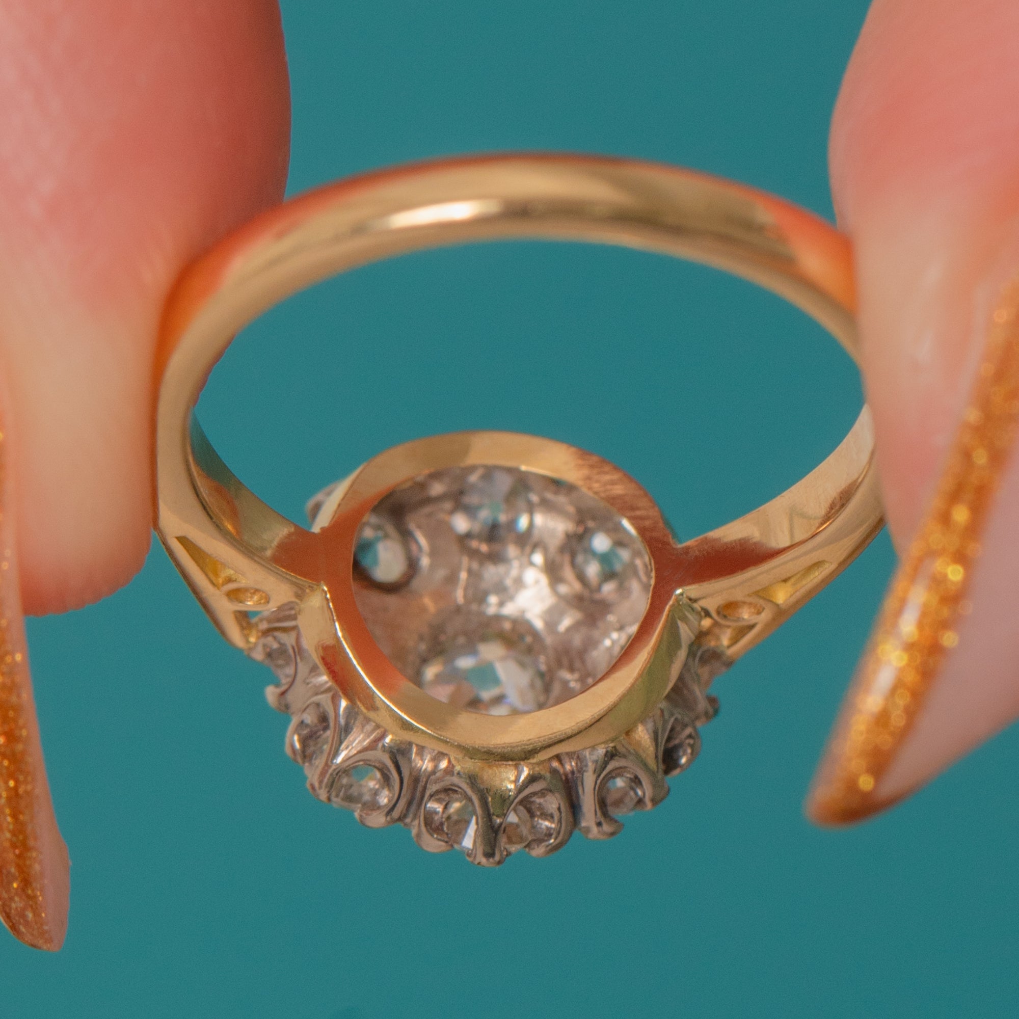 VERY GOOD: Diamonds are bright with antique facet charm; settings secure with crisp detail and age-appropriate surface wear only. The slim shank shows light wear consistent with age and careful use.