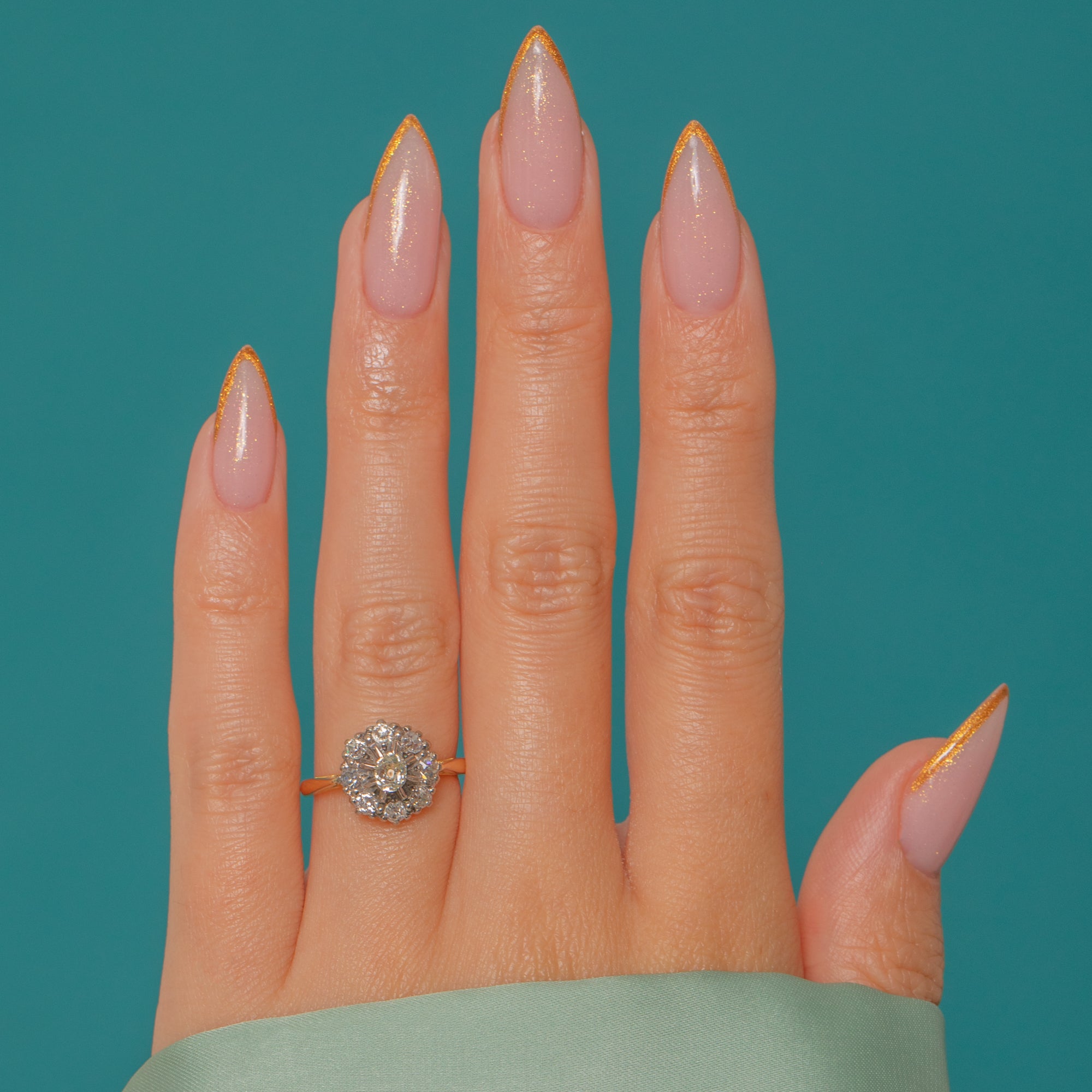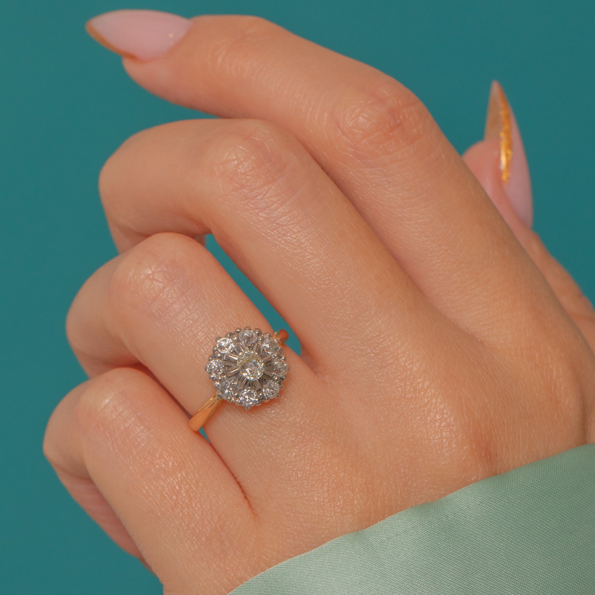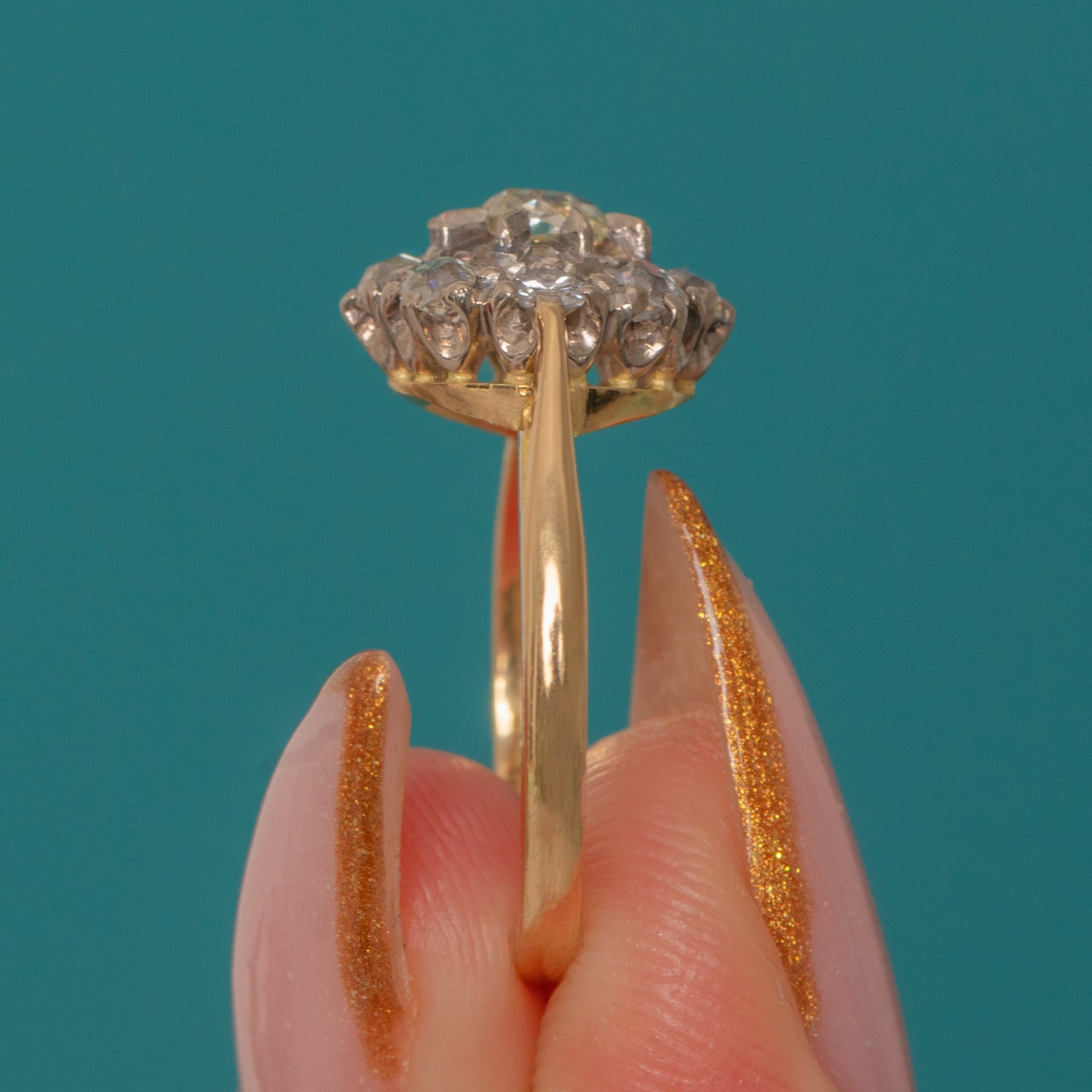 A sparkling antique cluster with wonderful early cuts: a bright Old Mine-cut Diamond at the centre within a halo of lively Old European-cut Diamonds. The Platinum -topped head contrasts beautifully with the warm 18ct Gold shank, giving that refined early-20th-century look collectors love.