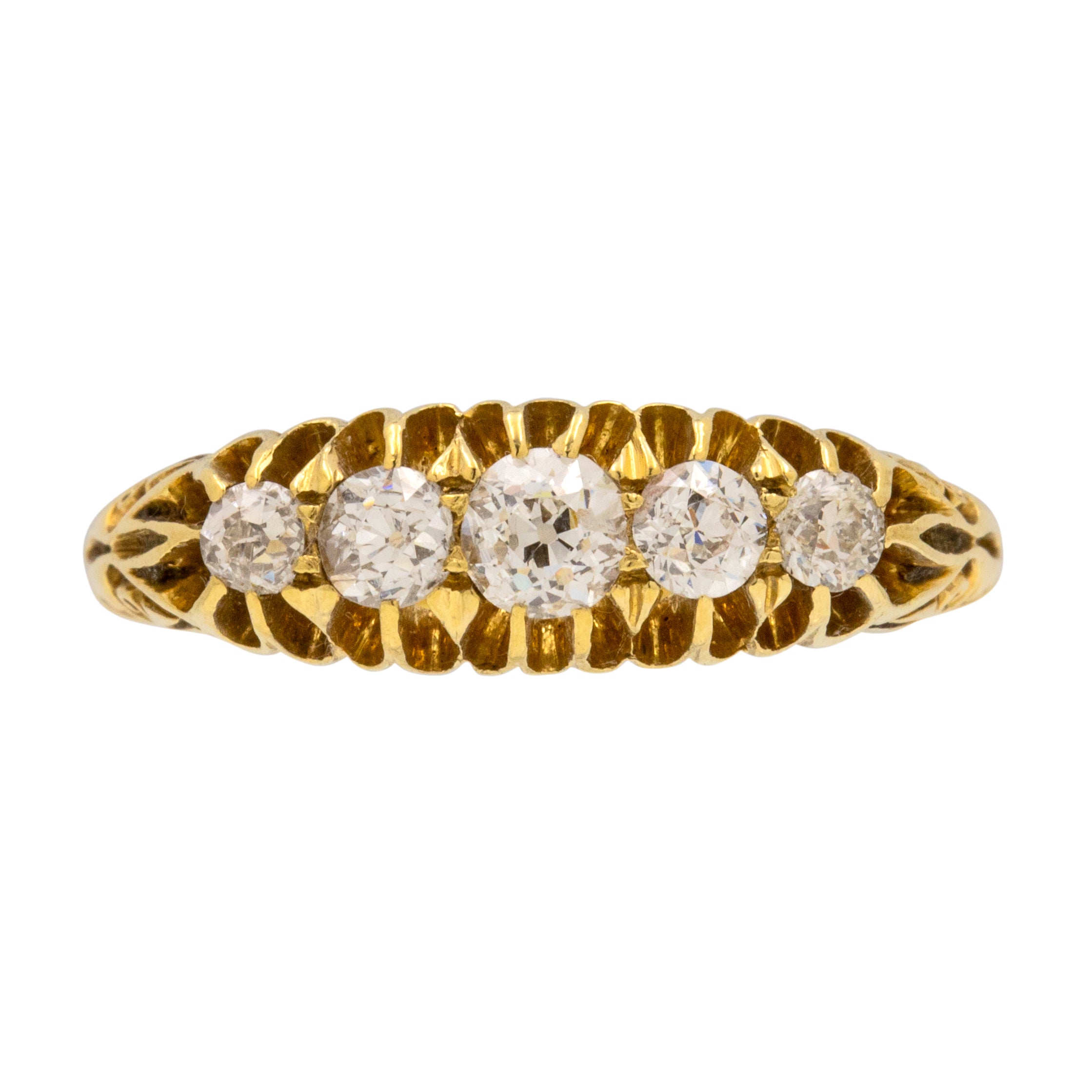 A sparkling sensation, this antique 18ct Gold Diamond five stone ring will satisfy your every jewellery craving. Boasting five twinkling Diamonds with a total weight of 0.50ct, this Victorian 18ct Gold ring is a timeless classic that packs a punch!