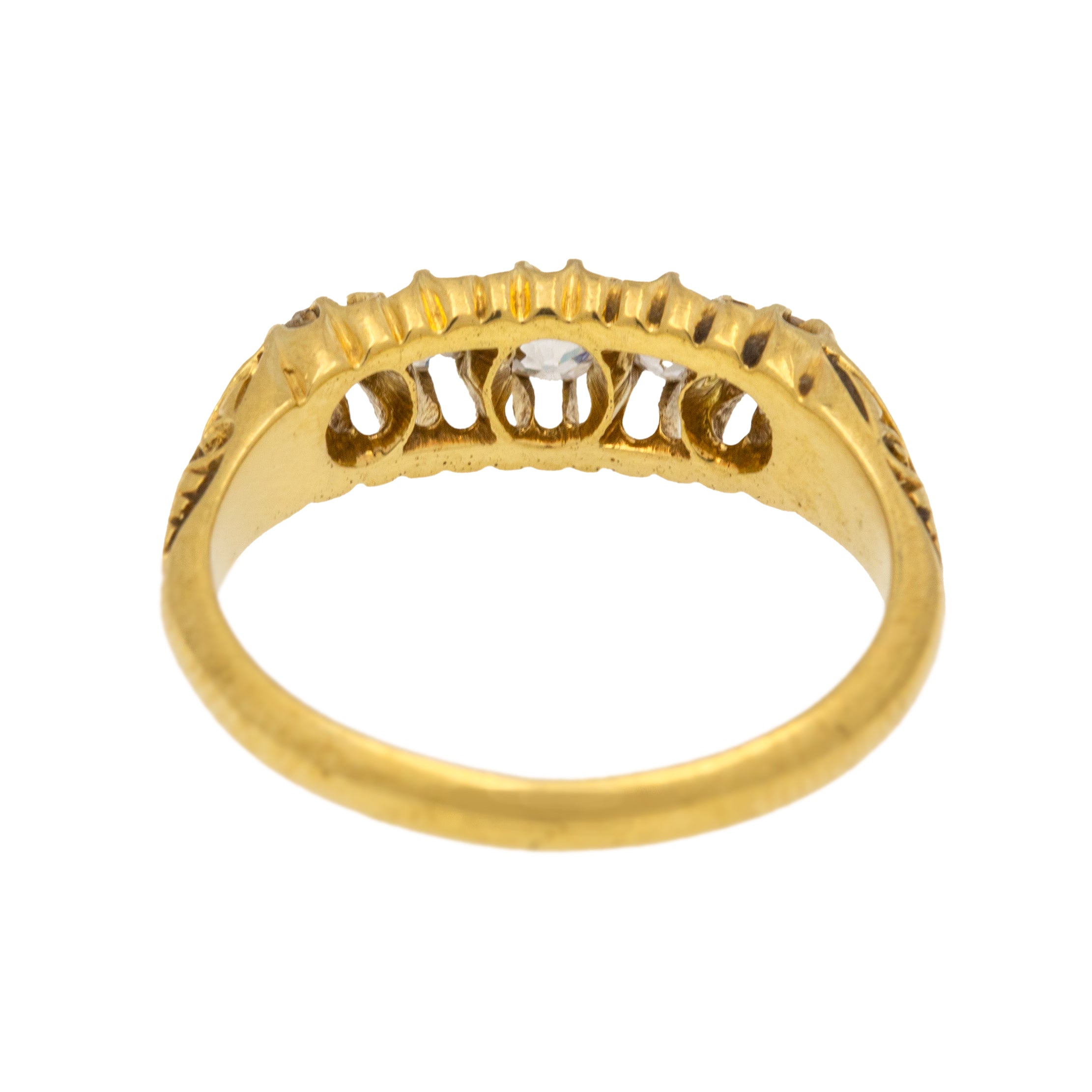 VERY GOOD TO EXCELLENT. This antique 18ct Gold Diamond five stone ring is offered in excellent condition. The Diamonds are all sparkly and securely set, with only the central Diamond having an abrasion tucked away on one side. The 18ct Gold is free from dings and dents, maintaining its original shine. With proper care and maintenance, this ring will last for generations to come!