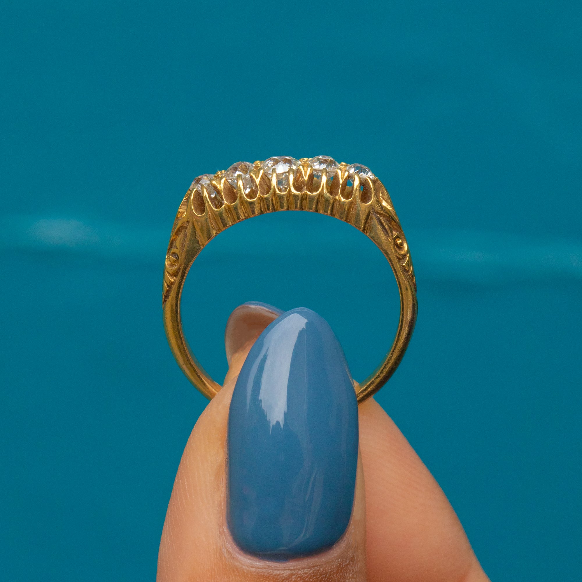 Classically beautiful and elegantly proportioned, this Victorian ring does the job it is designed to do - to enthrall and enchant the wearer with its five Old-Mine Cut Diamonds! Whether you are treating yourself or treating your partner, this ring will stay with you through life's adventures!