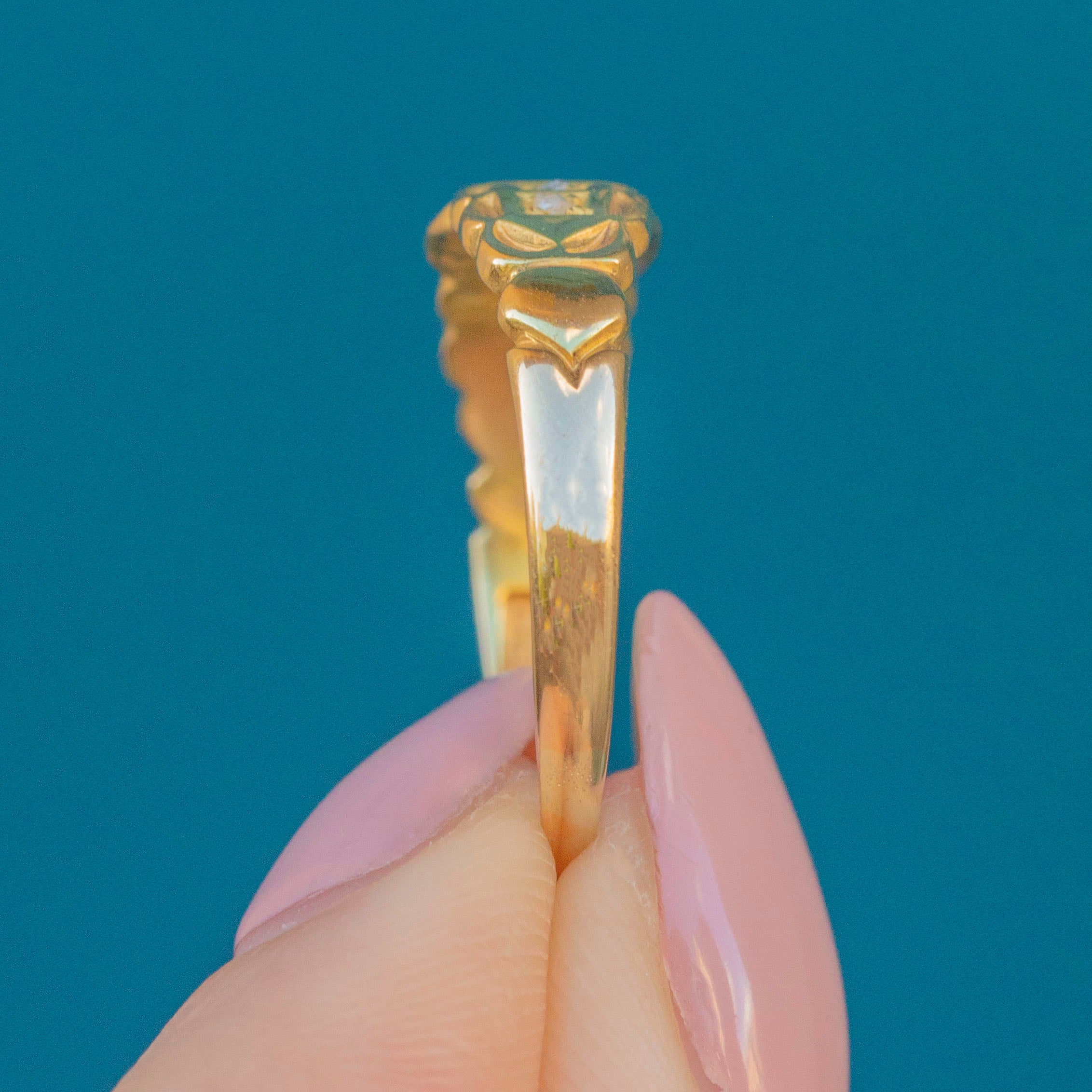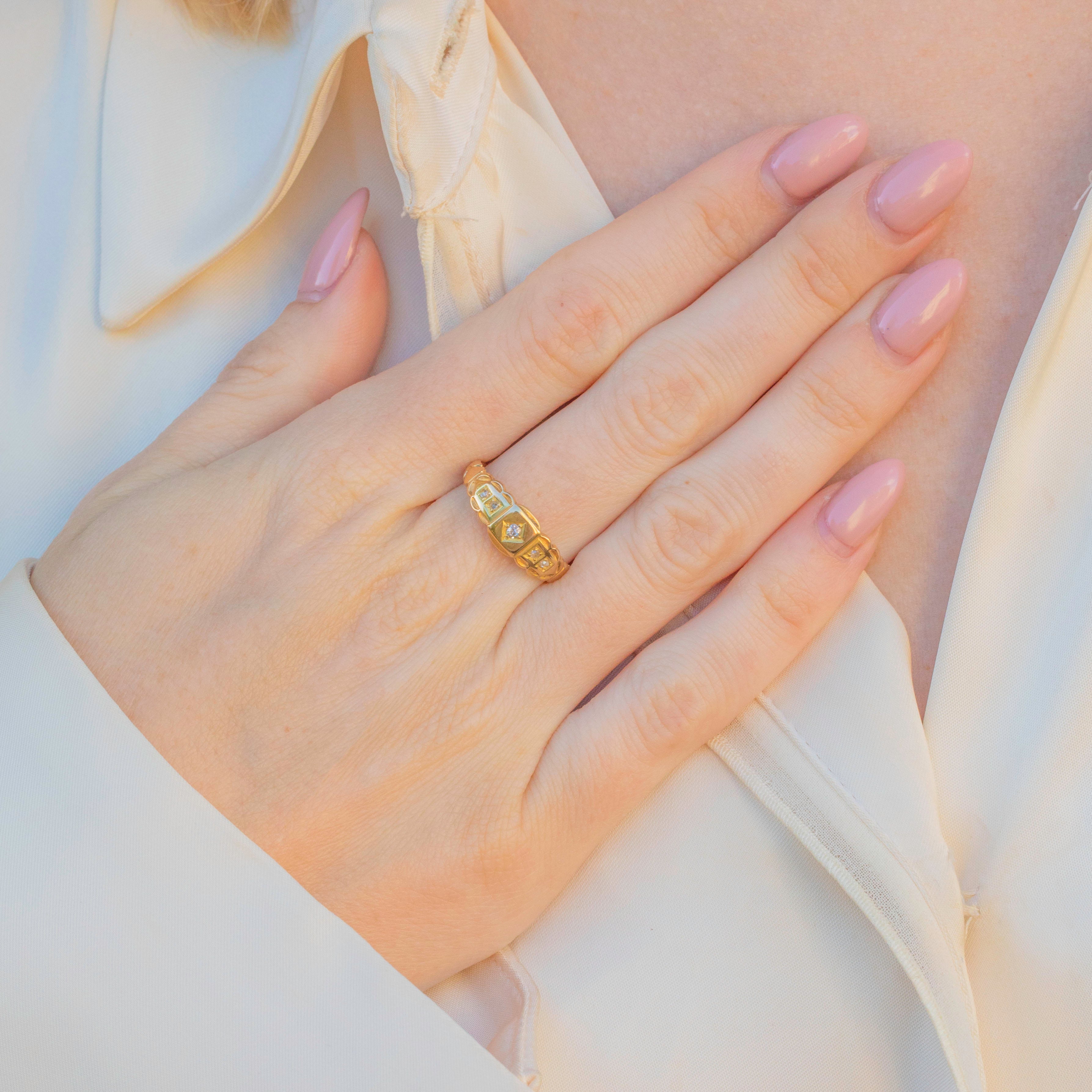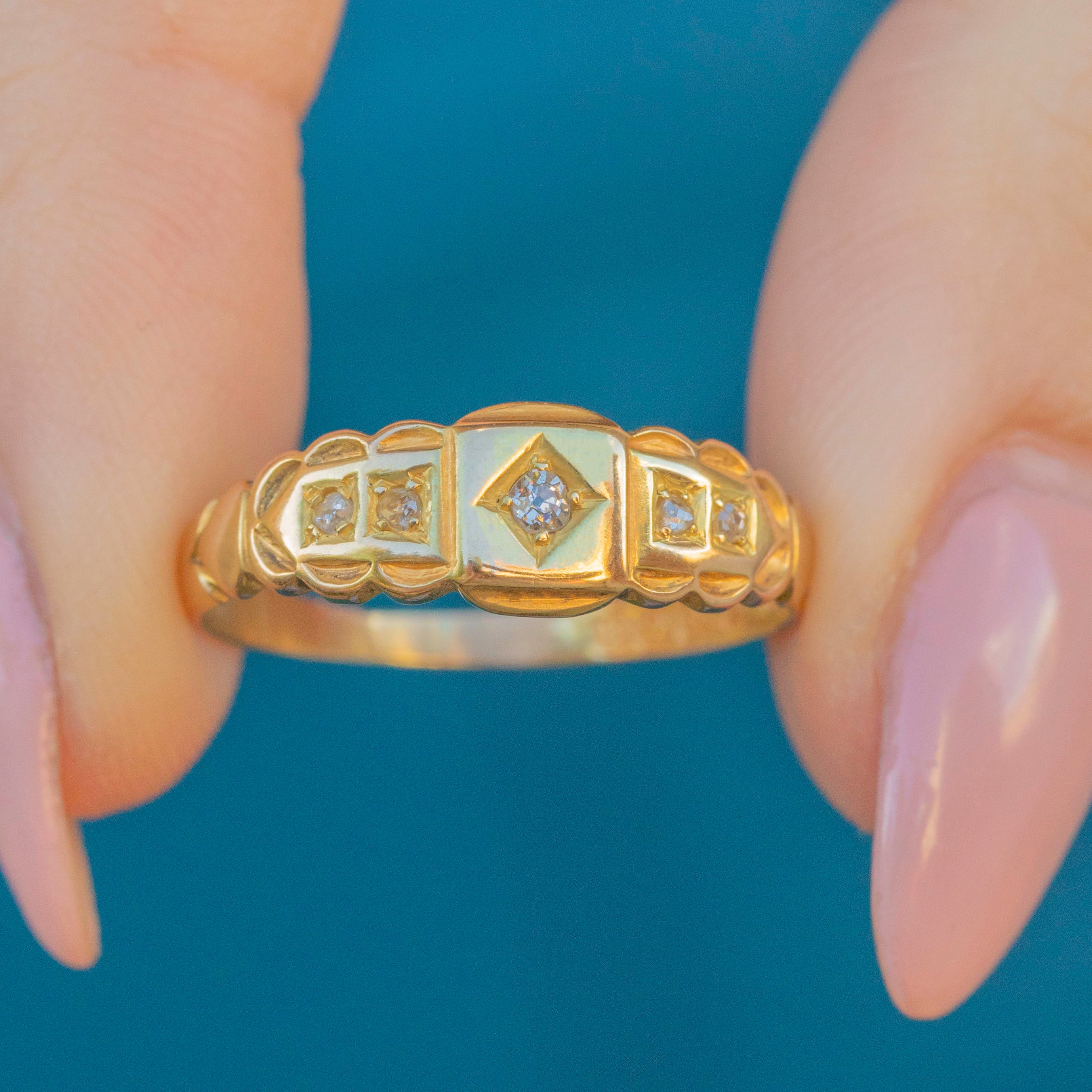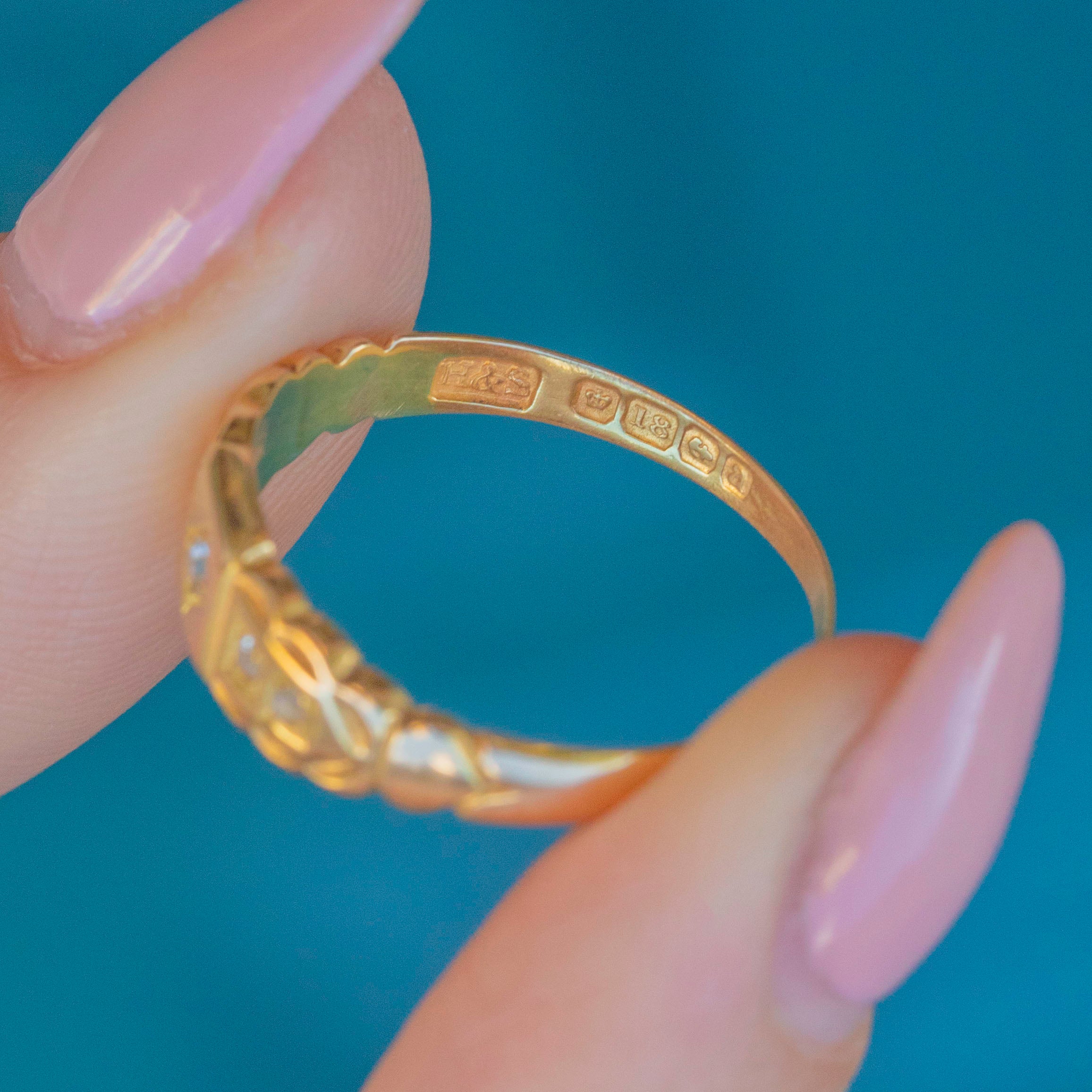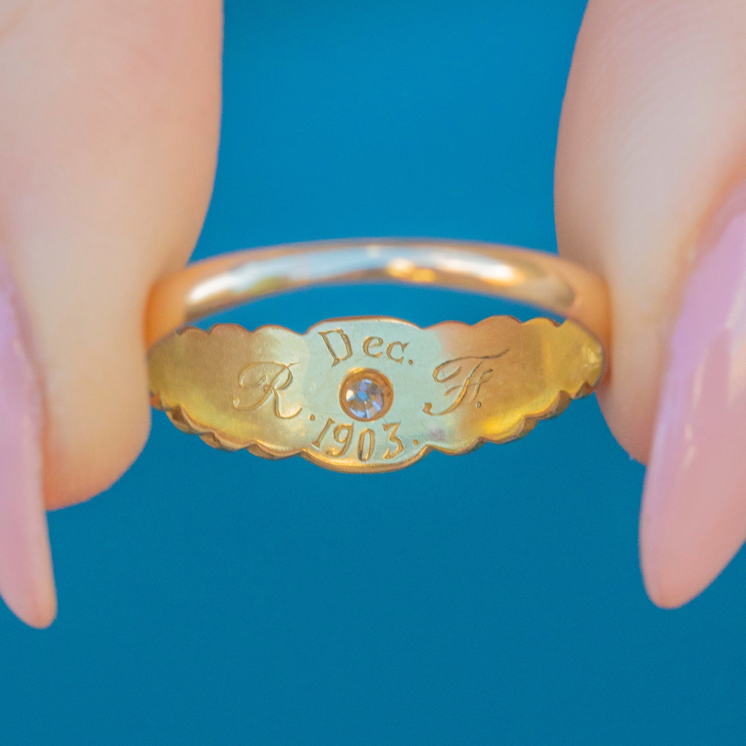 EXCELLENT. This antique 18ct Gold Diamond gypsy ring is in sublime condition. Her 18ct Gold is brightly saturated with no scuffs or dings to note. Her Diamonds are all set securely in their settings, allowing for safe, confident wear. Alongside the hallmarks, there are some artisan engravings that contribute to the interesting history behind this ring. It reads "RJ, Dec, 1903". She's a deeply fascinating piece to be treasured for generations to come!