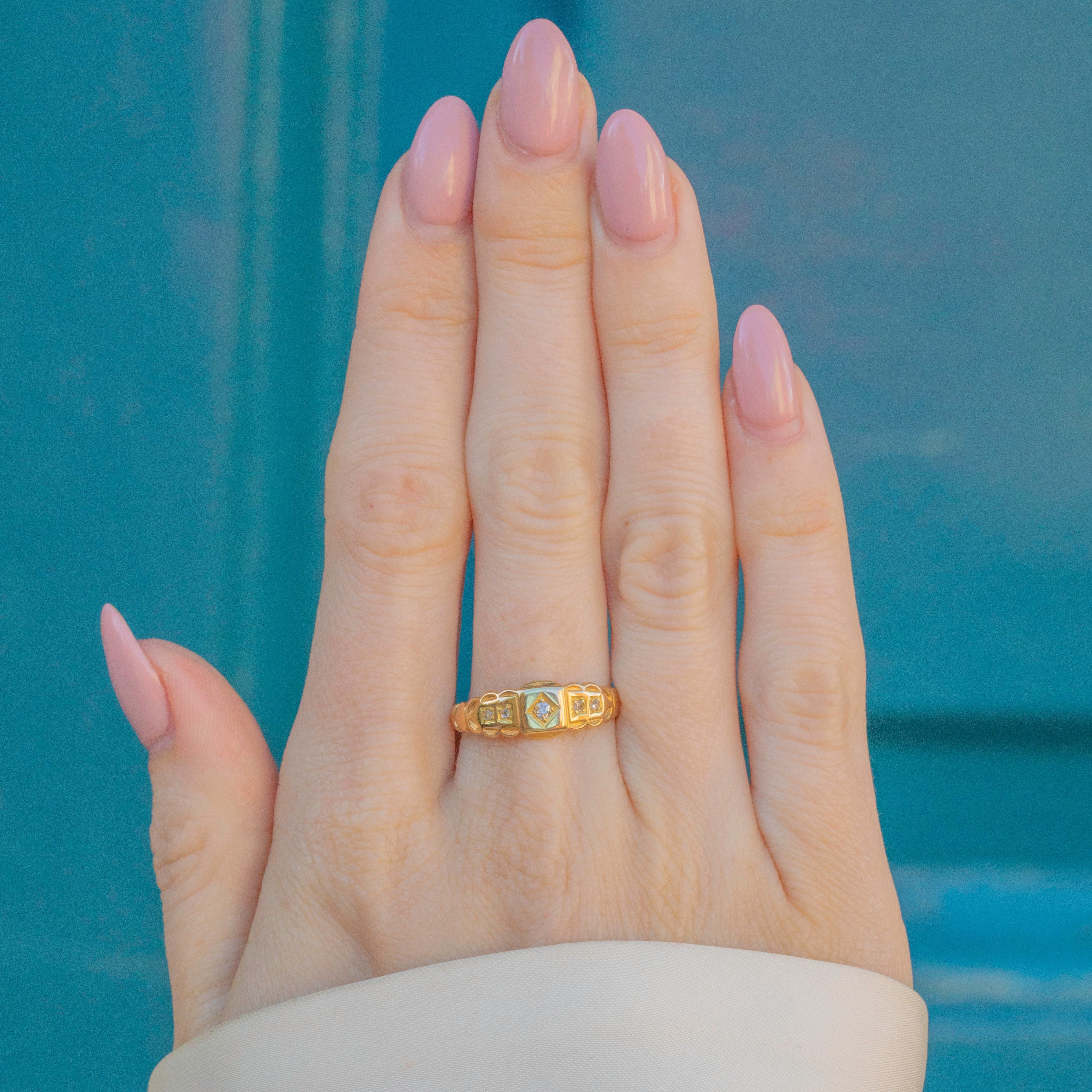 This Victorian Gold gypsy ring features five scintillating diamonds, giving her a celestial ambiance that will add a touch of elegance to any ring stack. With a full set of English hallmarks dating to 1900, this Victorian treasure will make a coveted addition to your collection!