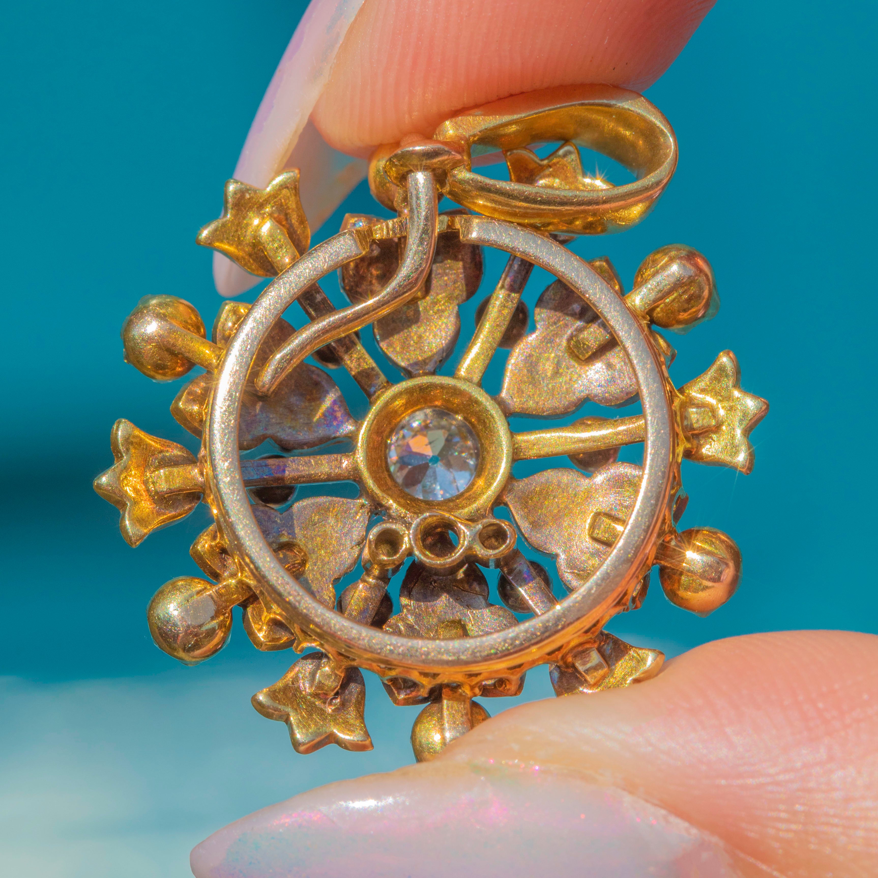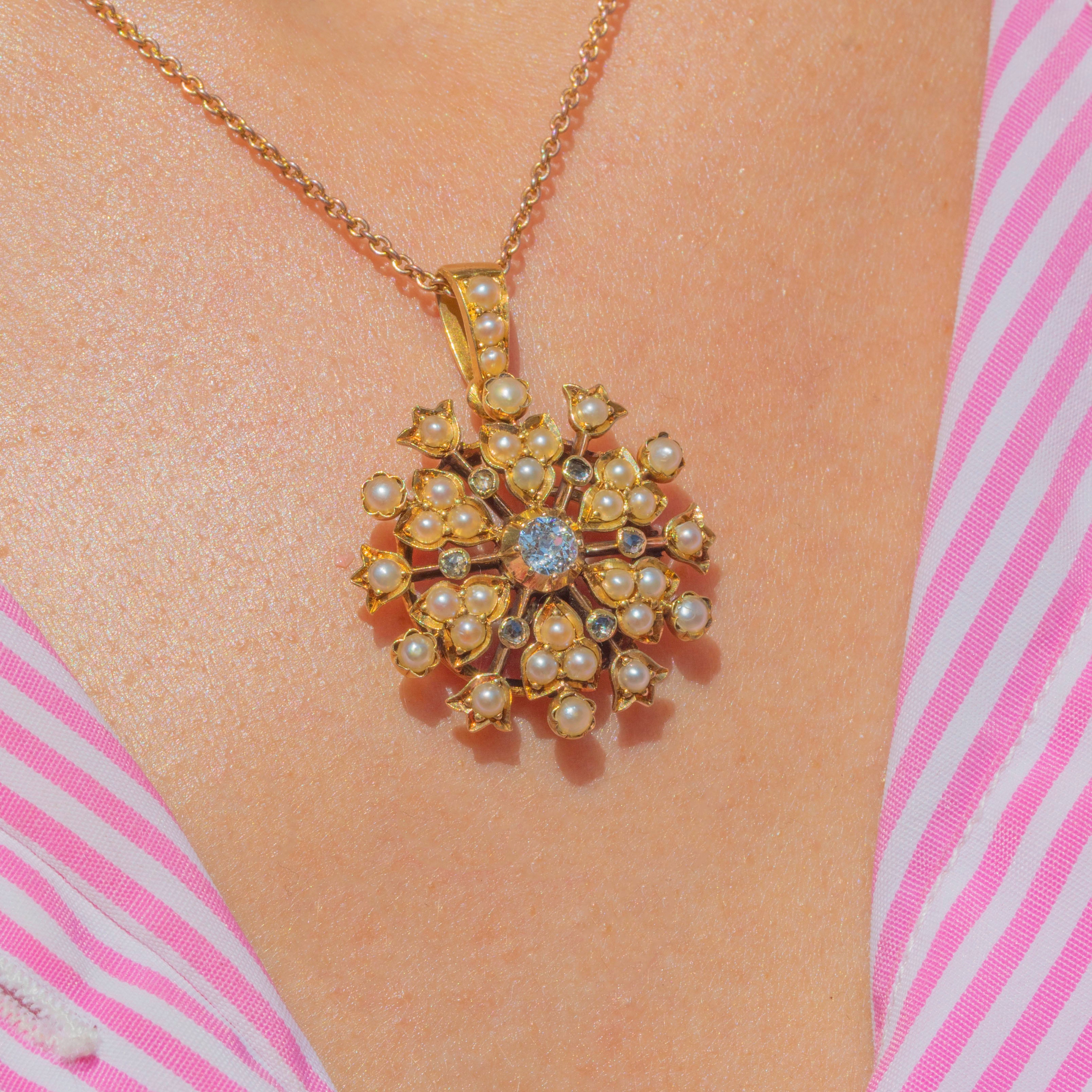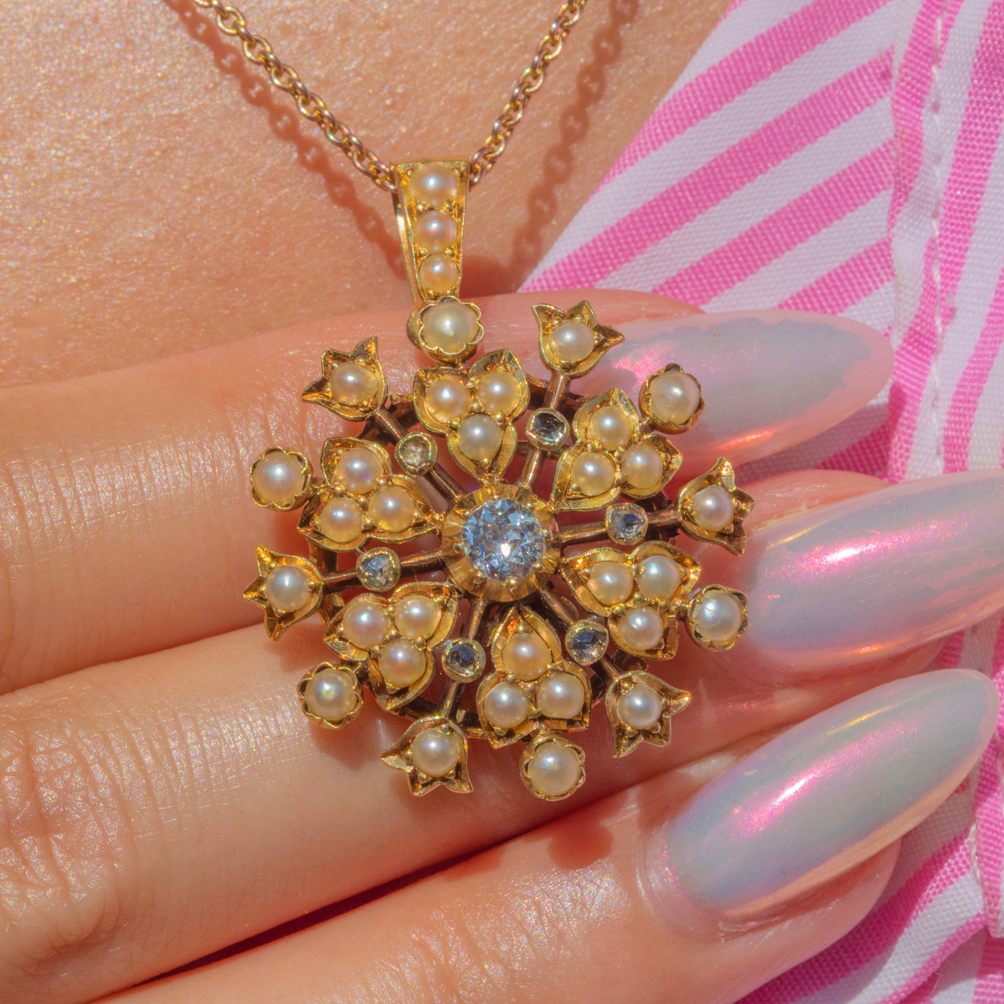Formed from saturated 18ct Gold and bursting with 0.35cts of shimmering Diamonds and iridescent Pearls, this antique flower cluster pendant is a fine example of the intricate designs and exquisite craftsmanship of the Victorian era!