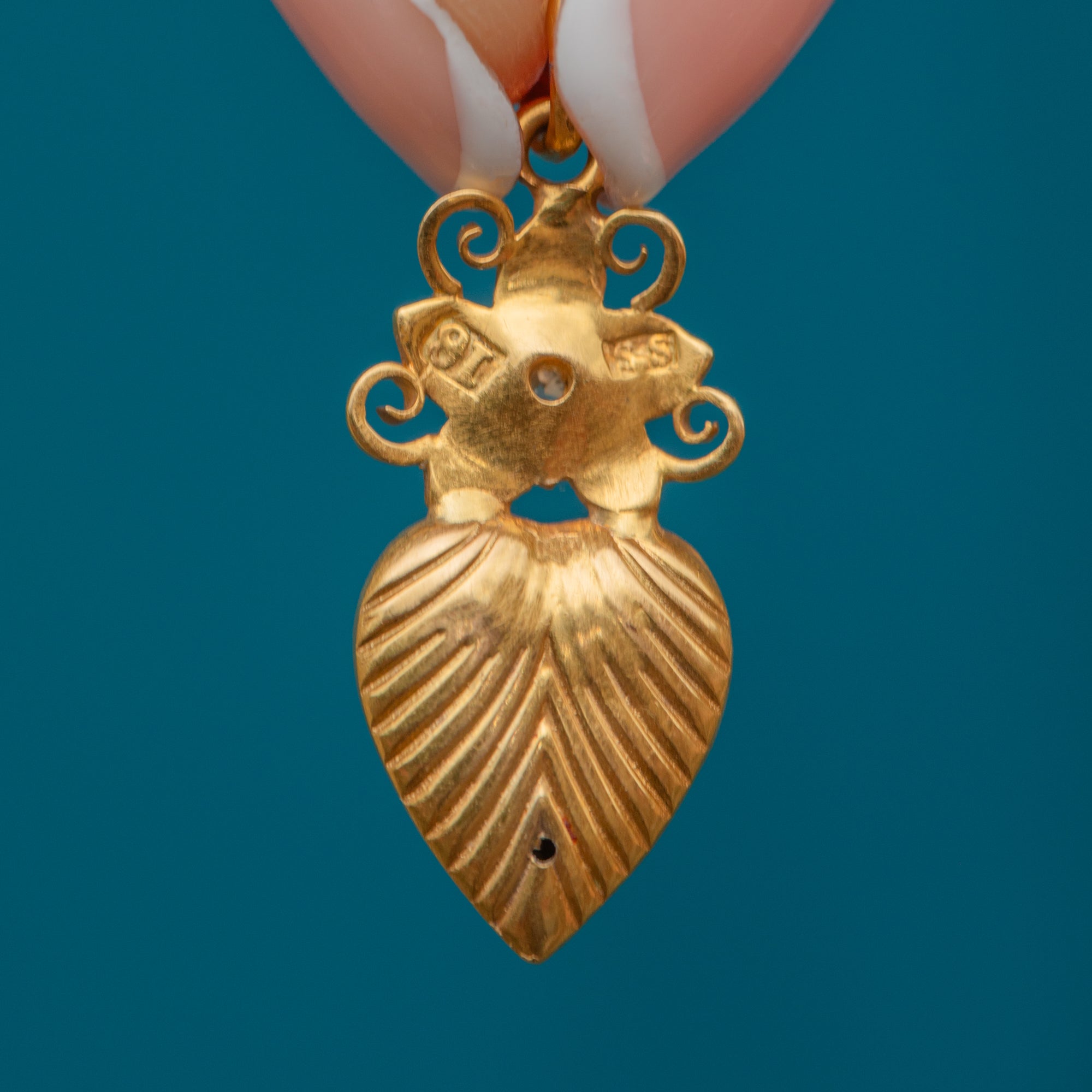The ridged heart charm catches the light spectacularly, crowned by ornate Goldwork with an enchanting display of plump Pearls haloing a sparkling Diamond. This Victorian pendant is a true treasure that will make your collection stand out from the rest!