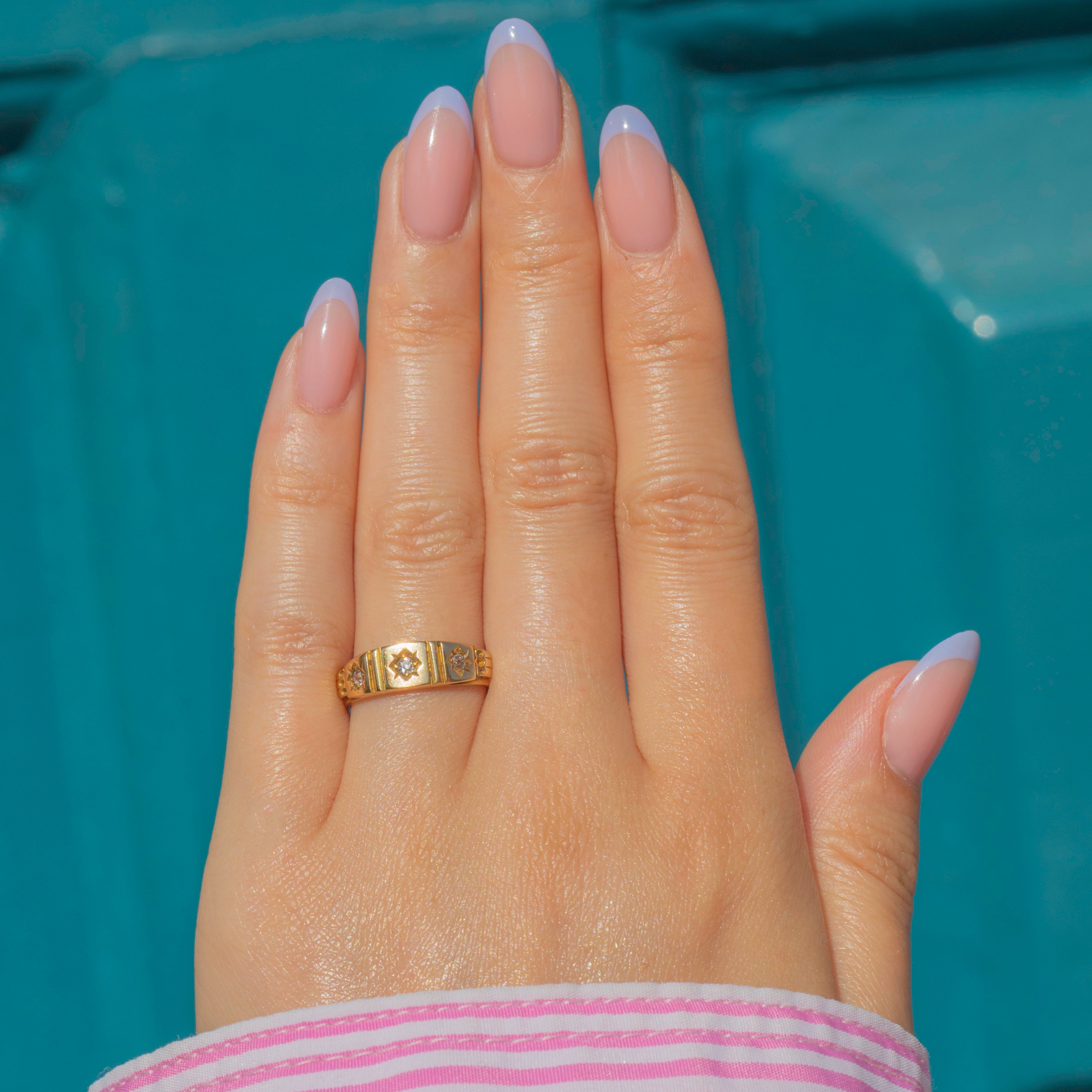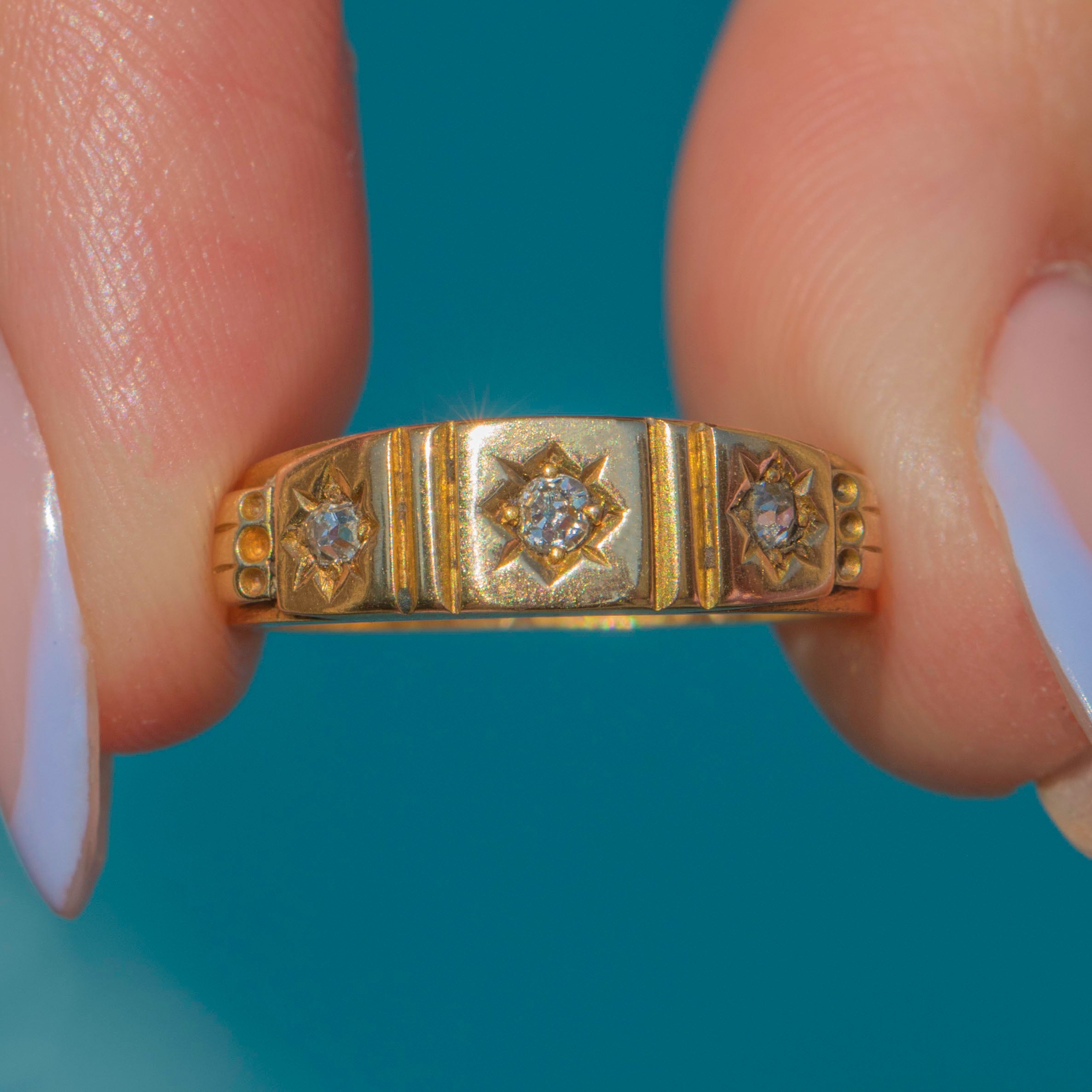 The three flush-set Diamonds add a subtle sparkling accent, displayed within star settings and geometric engraved details, giving this Victorian gypsy ring a bold look. With a low profile, you can easily style this antique Diamond ring as a standalone piece or add it to a curated ring stack!