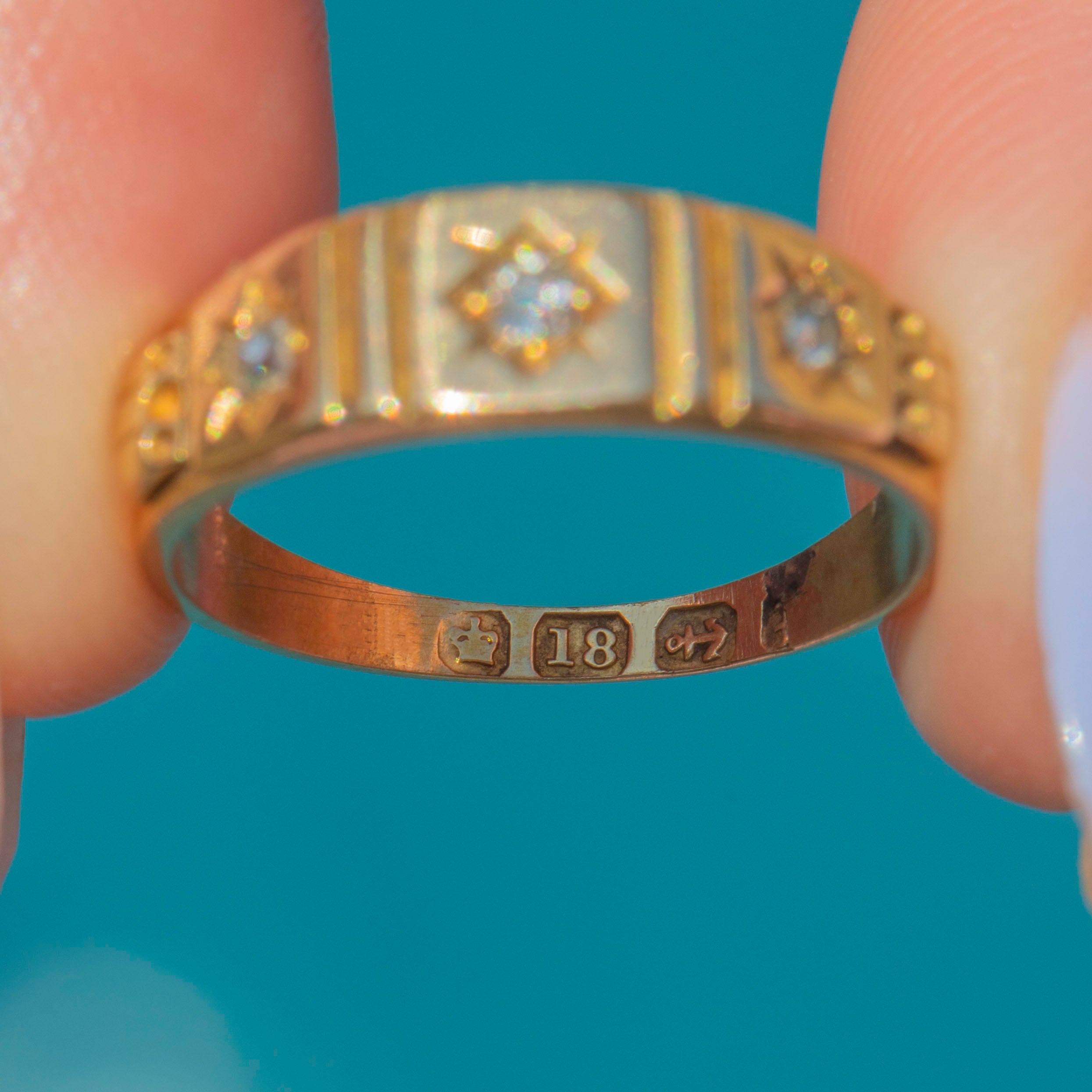 VERY GOOD: This antique 18ct Gold Diamond three stone gypsy ring is in very good condition. The Gold is bright and the engraved details have remained crisp and defined. There is some wear throughout, most notably on the inside of the band, and the date letter has been lost over time, but this does not detract from the overall impact of the piece. The Diamonds are all secure in their settings and free from surface wear. With plenty of life left in her, this Victorian Diamond gypsy ring will soon become a staple in your repertoire!