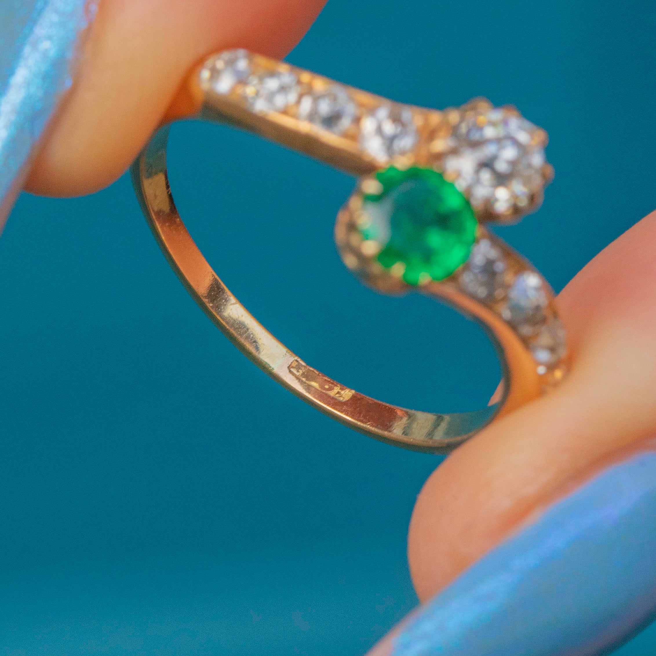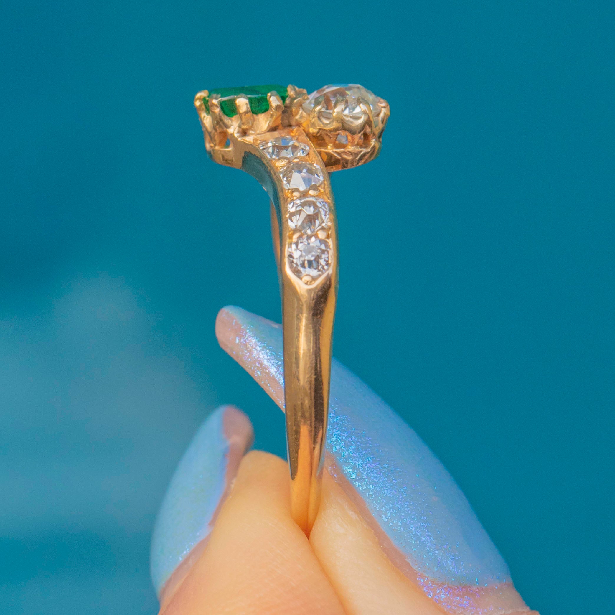 EXCELLENT. This antique 18ct Gold Emerald Diamond toi et moi ring is in excellent condition. Each of her gemstones are faceted wonderfully and sit securely within their settings. With minimal signs of wear, this Edwardian ring is in fabulous condition.
