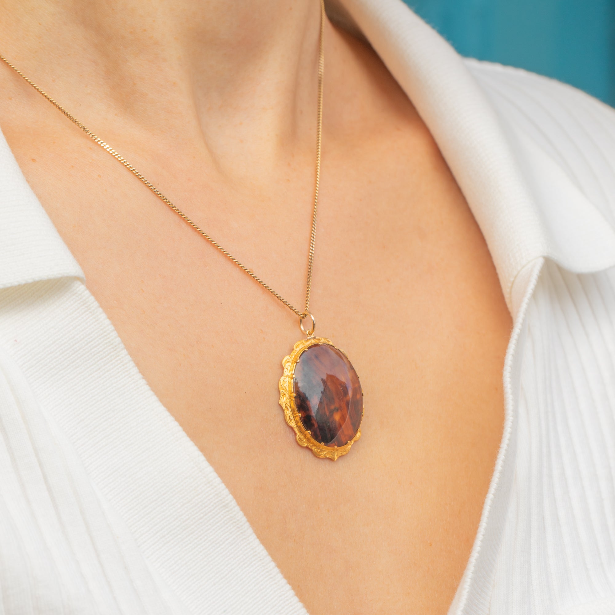 This Victorian pendant showcases a richly coloured Jasper cabochon, polished to a smooth dome and framed in a finely engraved 18ct Gold mount. The Jasper’s natural variations of earthy red and brown tones lend it a dramatic and organic beauty, making each angle unique.