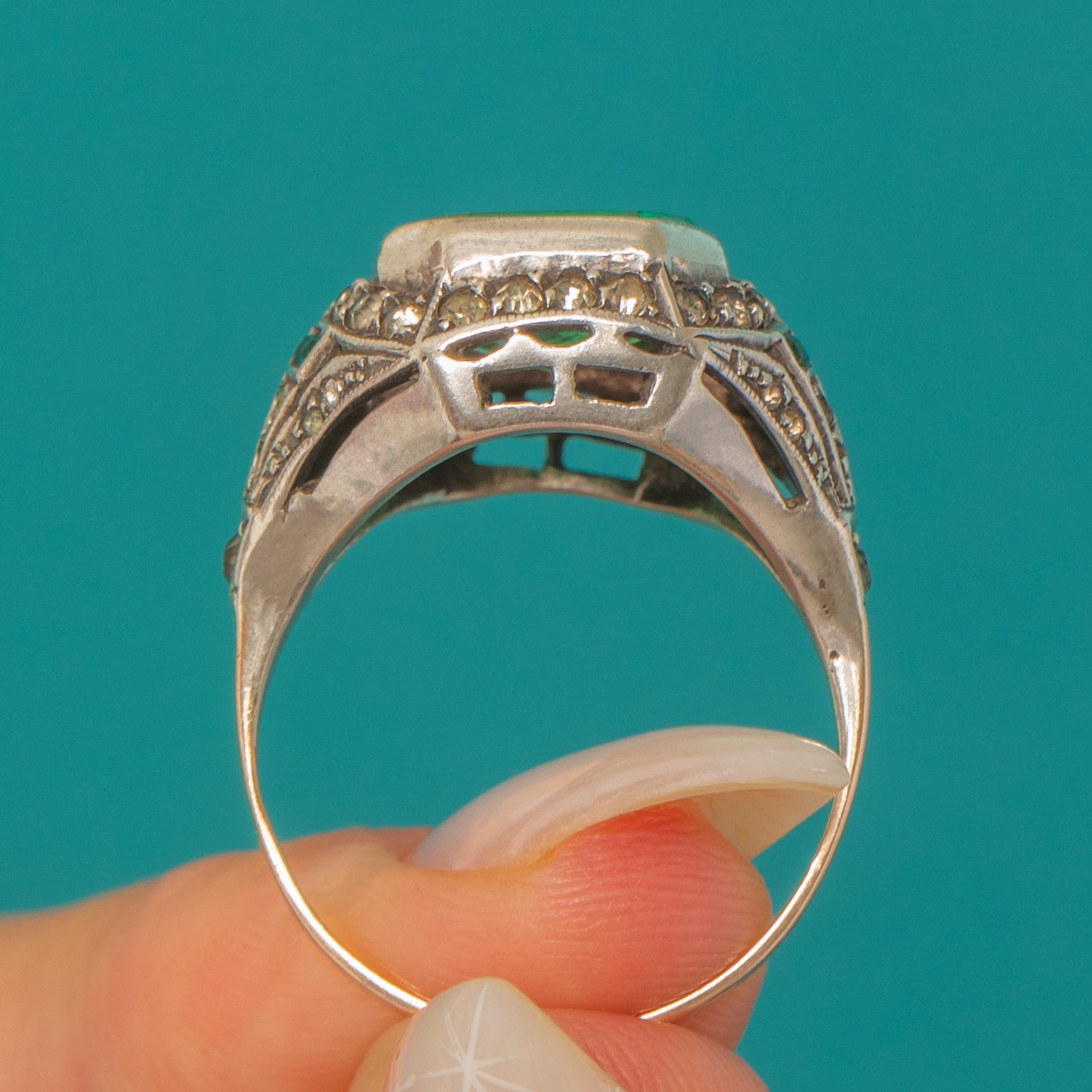 EXCELLENT: The Emerald and Diamonds are bright with no chips or notable abrasions visible under close inspection. The Silver settings are secure and the milgrain and pierced details remain crisp, with only light surface wear to the shank commensurate with age. The ring presents beautifully and has been well cared for.