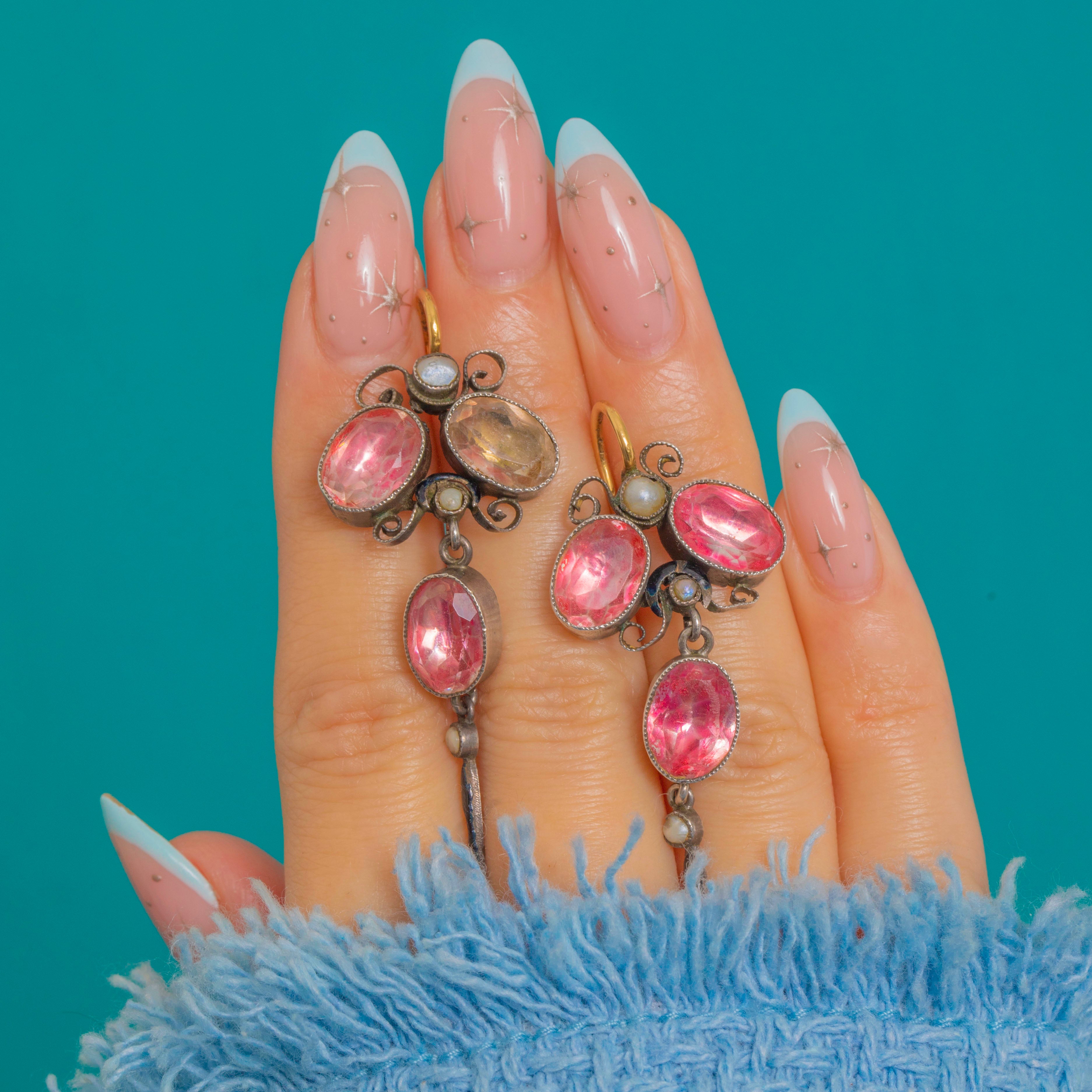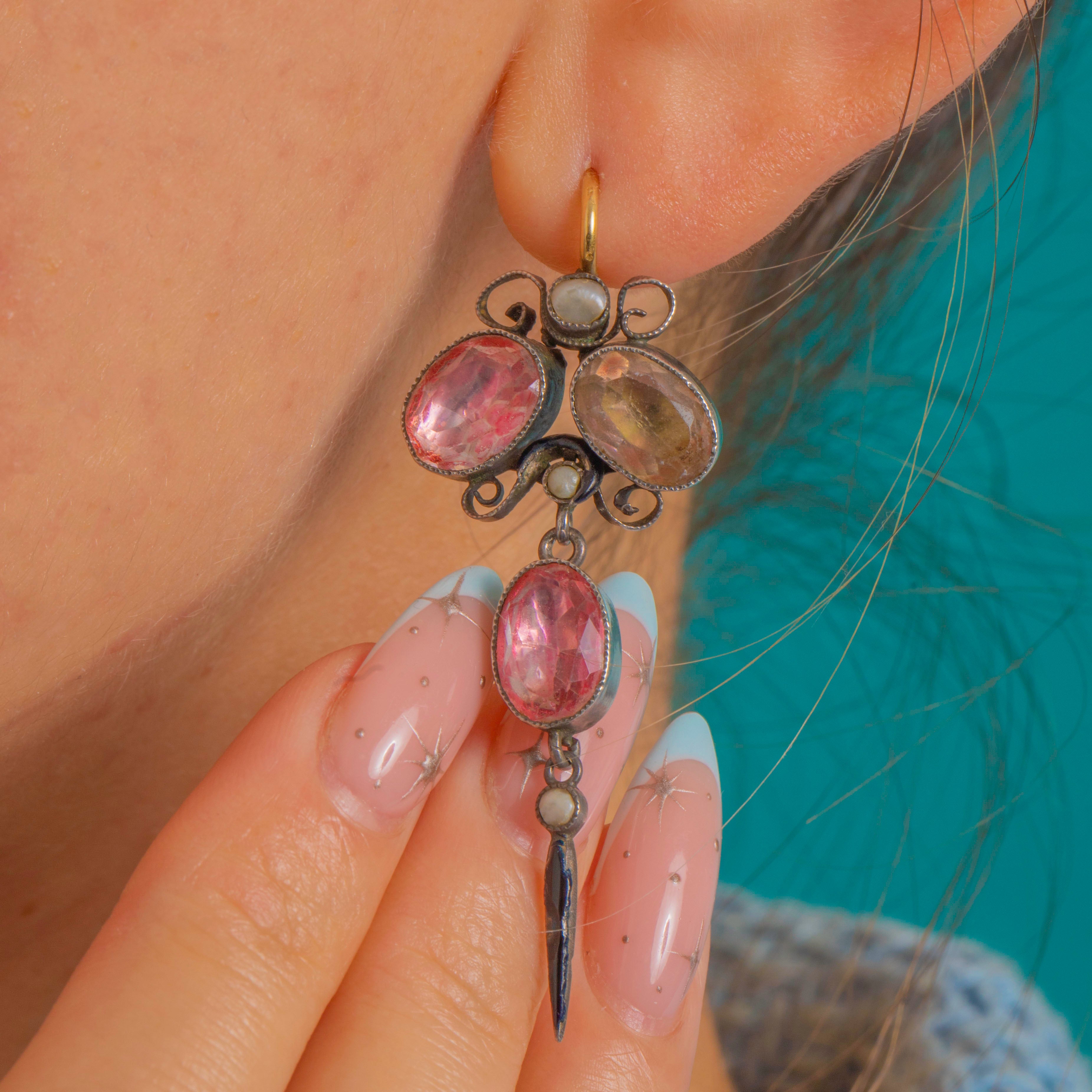 Antique 18ct Gold French Foiled Pink Paste, Pearl & Black Enamel Drop Earrings