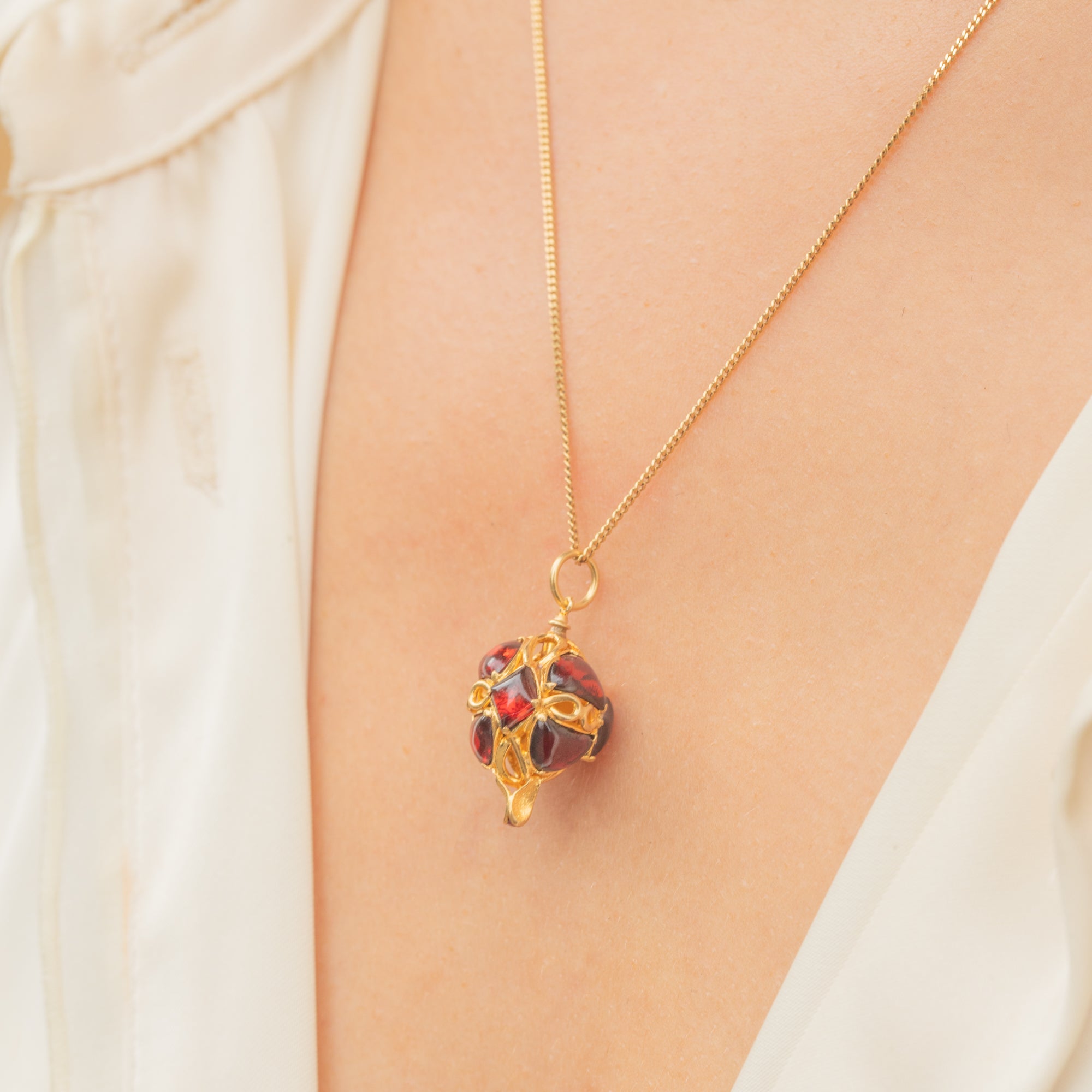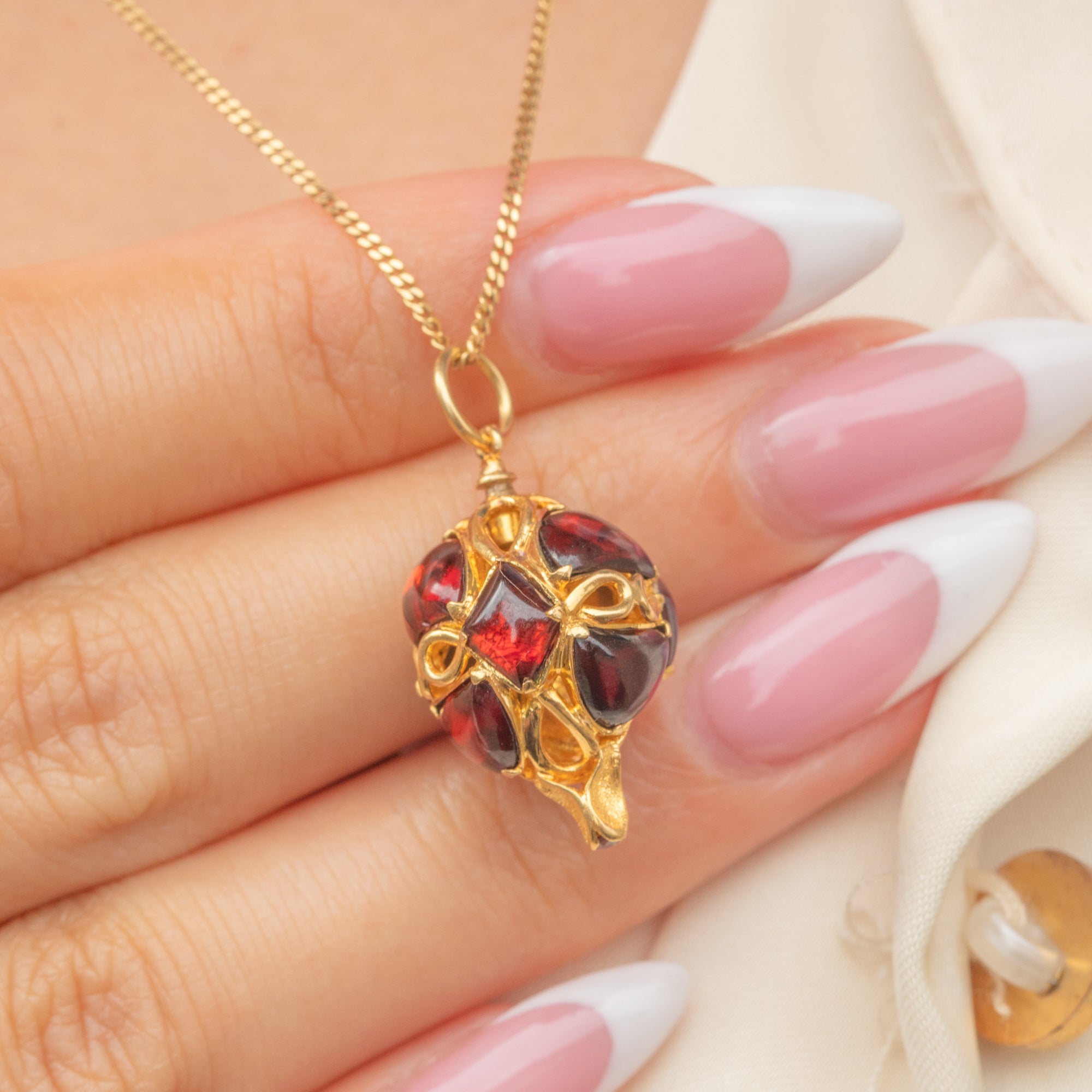 An antique 18ct Gold charm inspired by the pomegranate motif, set with vibrant Garnets arranged to evoke the fruit’s natural form.