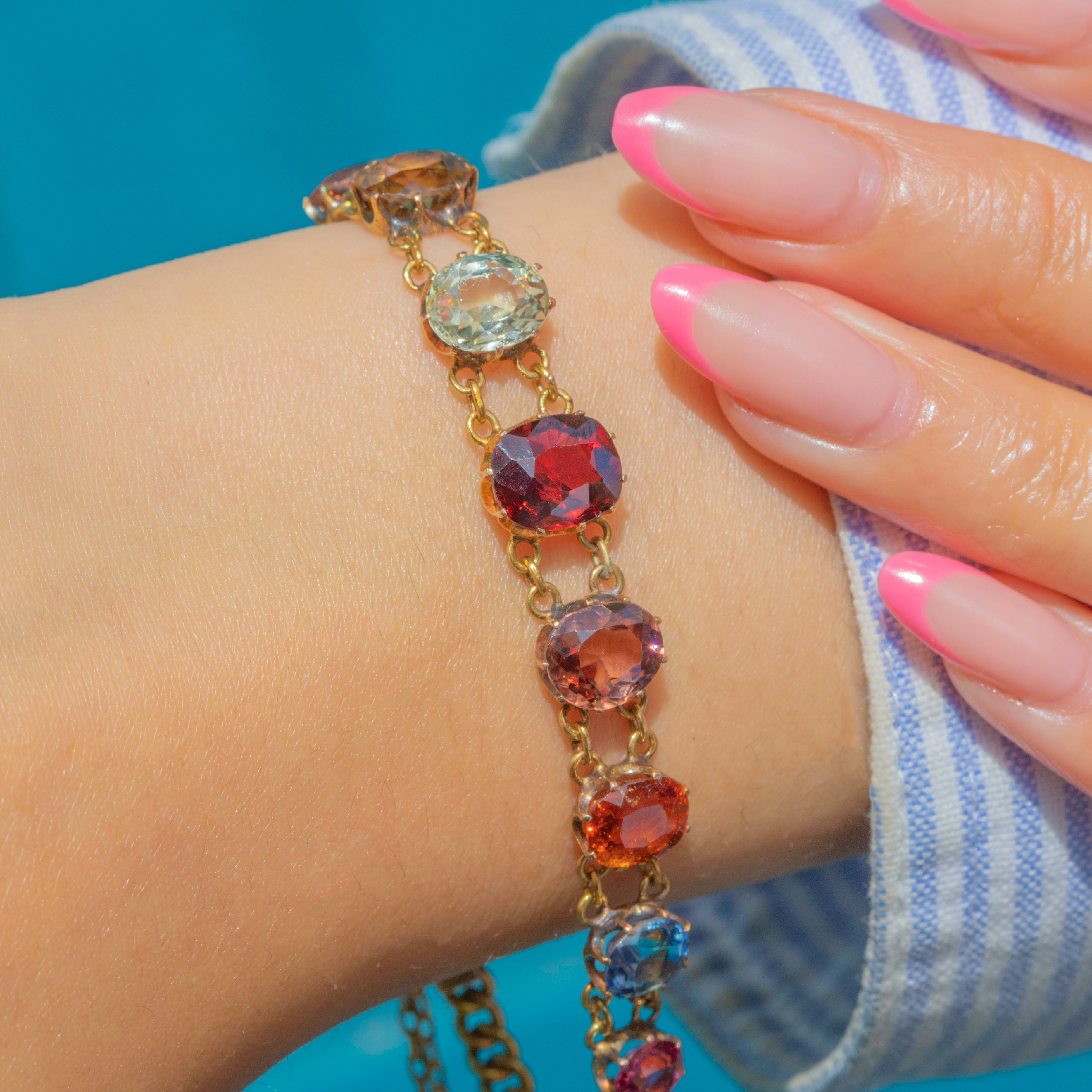 Each of her gemstones has a distinct hue, from cool-toned dusty Tourmalines to brighter royal blue Sapphires - a distinctly charming feature for which antique Harlequin bracelets are so revered.