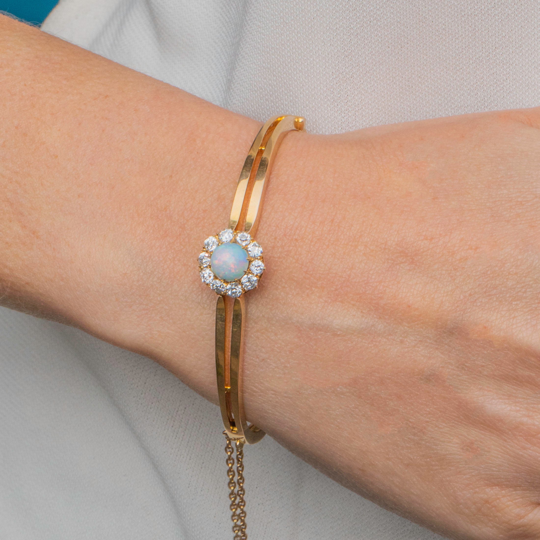 EXCELLENT. This antique 18ct Gold Opal Diamond bangle is offered in excellent condition. The Opal is secured within its setting and is free from nibbles or chips. The Diamonds are sparkly, securely set and free from fleabites. The 18ct & 15ct Gold is lustrously shiny and has remained unscathed over the years. The bangle features a subtle clasp providing you with a secure and comfortable closure, with added protection from the safety chain. The brooch fitting is in perfect working condition allowing you to wear this superb piece of Edwardian jewellery however you please!