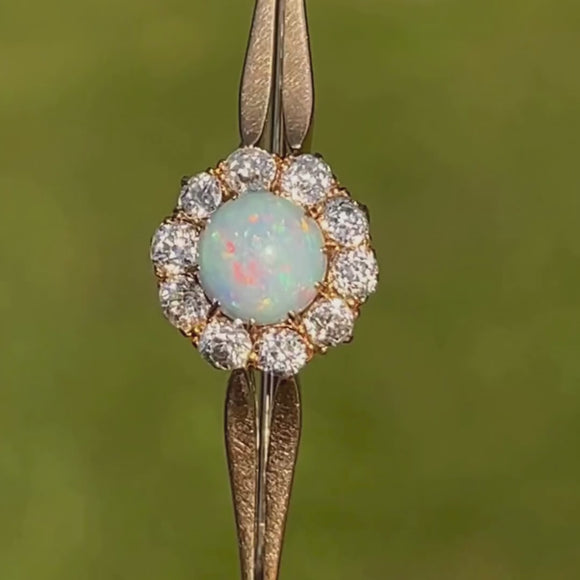 This antique 18ct Gold Opal Diamond bangle is an exquisite find. You will instantly become captivated by the 0.83ct natural solid Opal cabochon infused with zingy greens and flashes of fiery orange, haloed by scintillating old-mine cut Diamonds creating a truly show-stopping cluster!