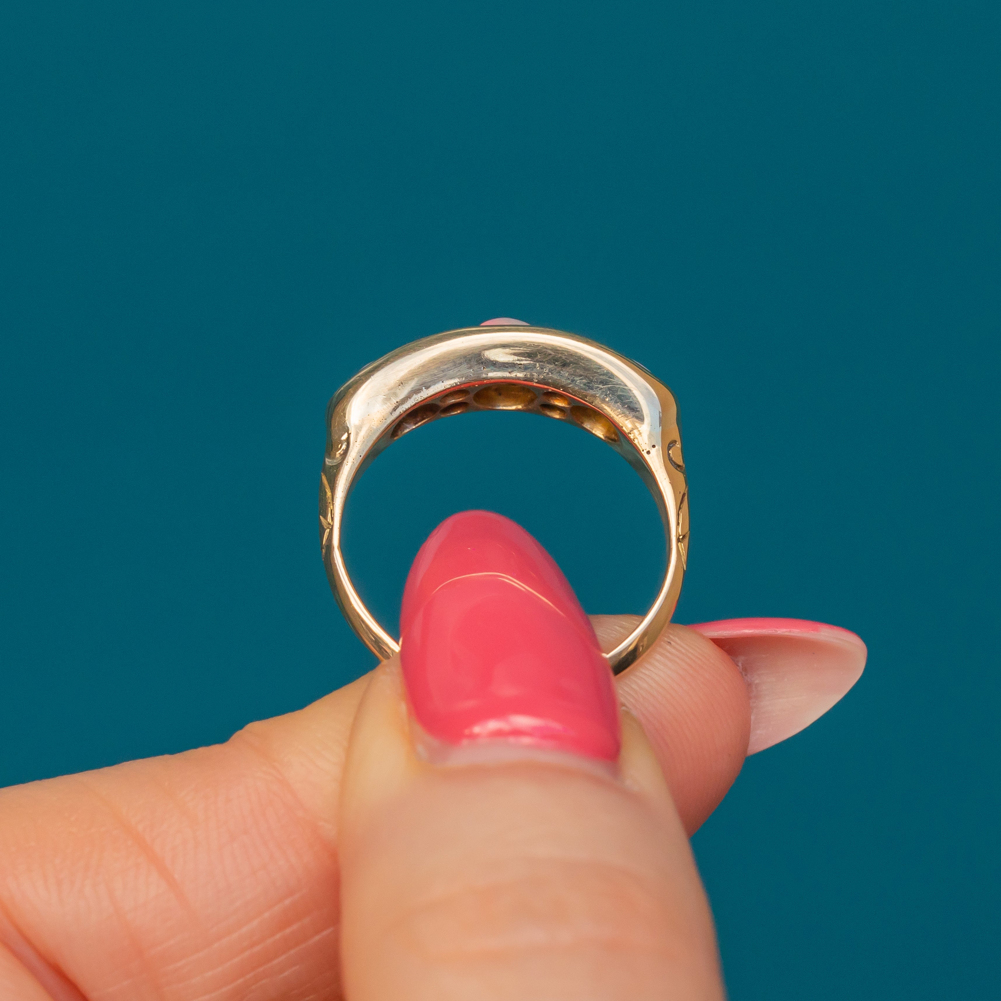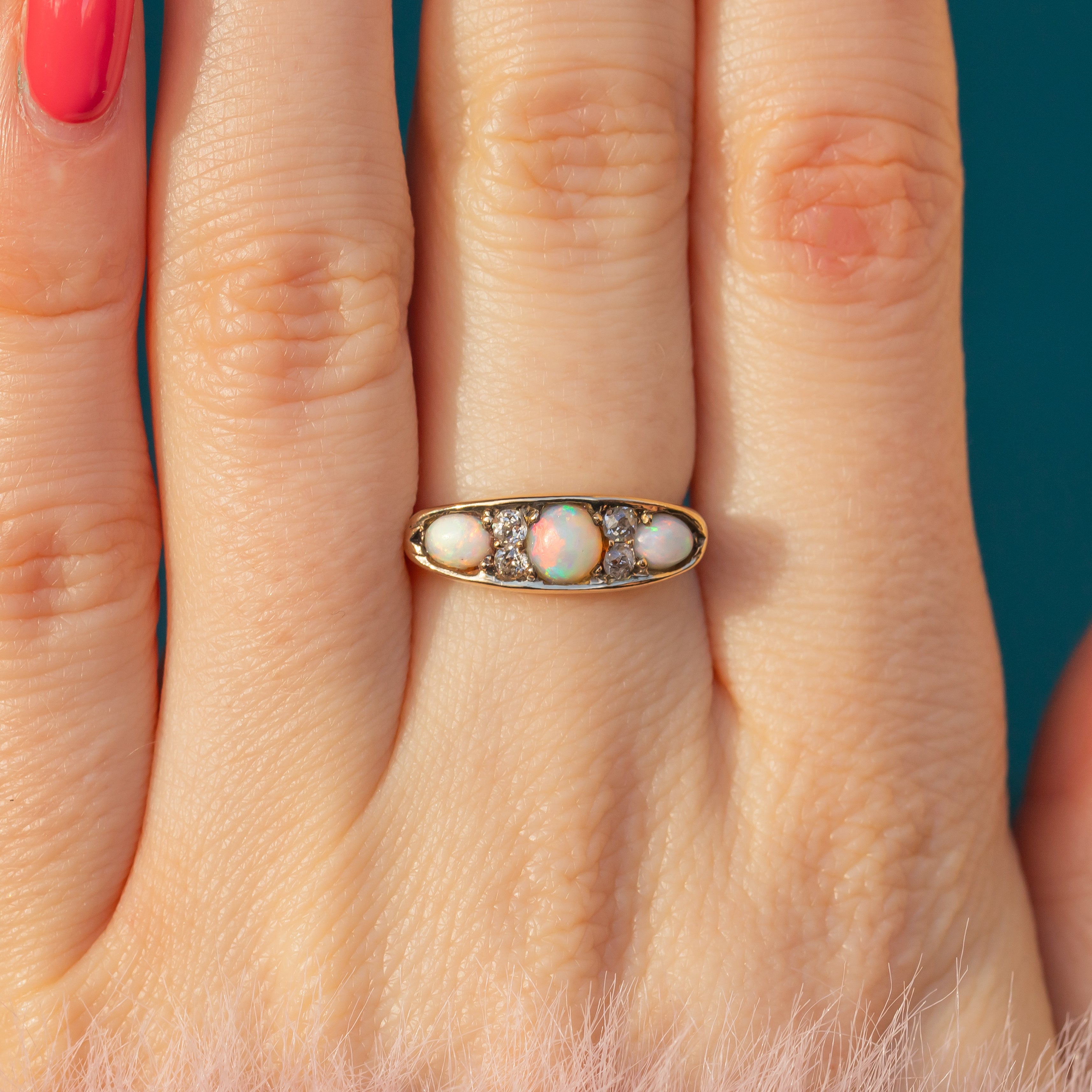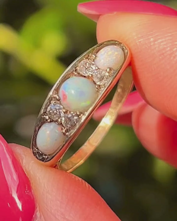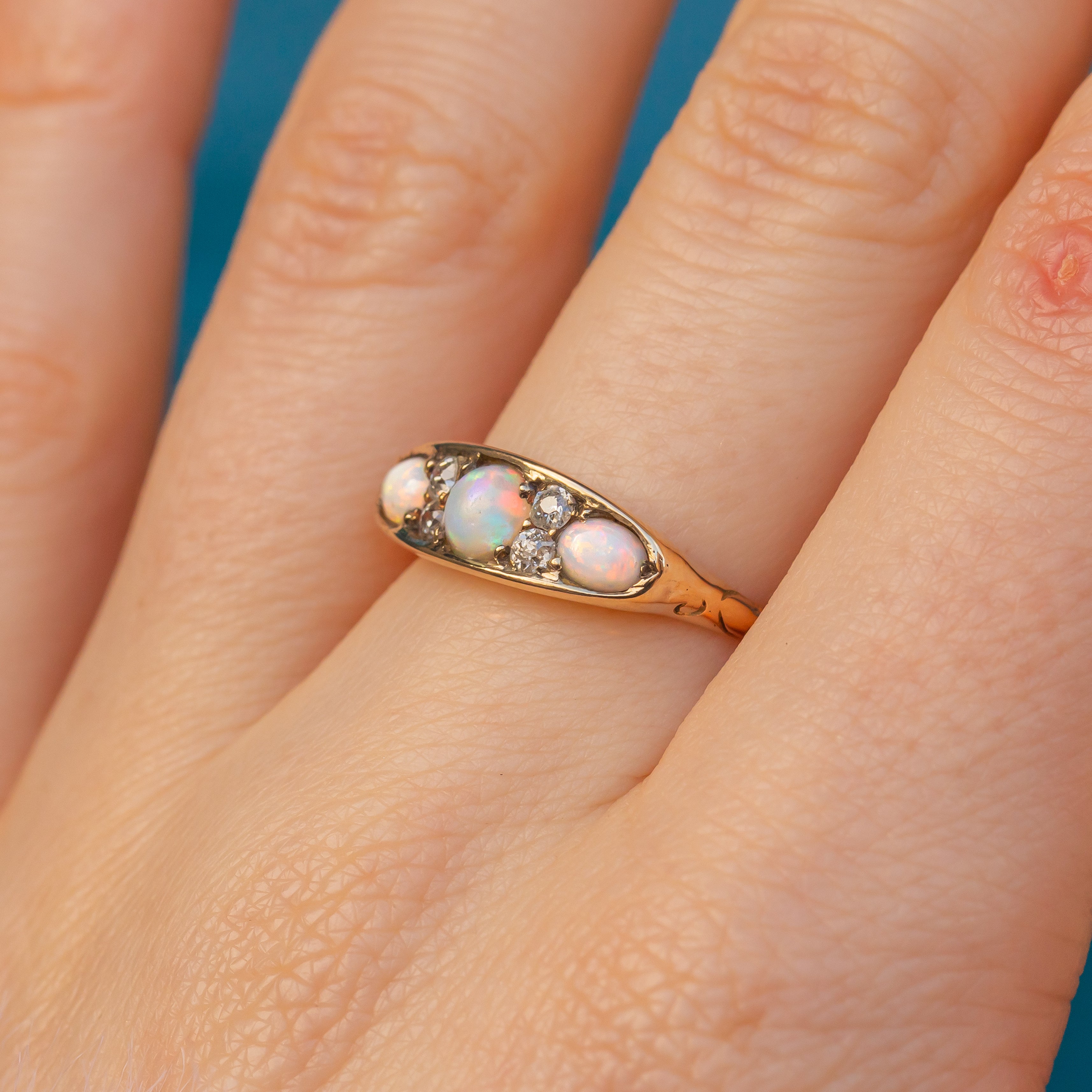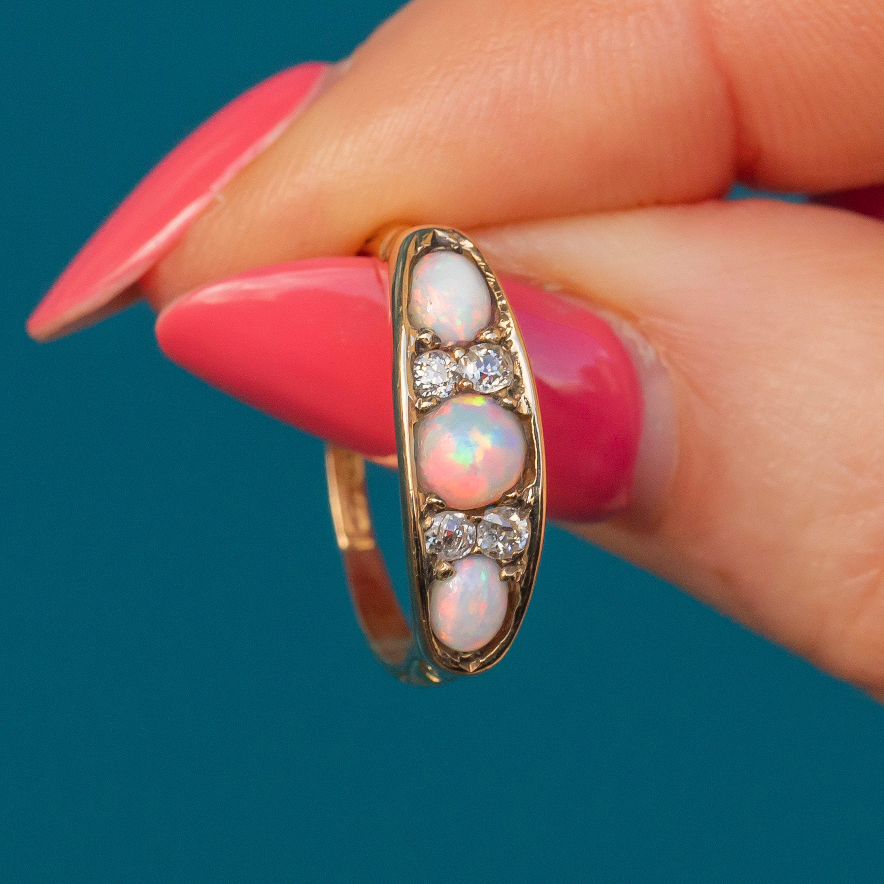 Discover a piece of history with this antique 18ct Gold Opal Diamond boat ring! A timeless piece of Victorian jewellery, this ring features exquisite Opal cabochons set in 18ct gold, radiating a spectrum of colours that dance beneath the light.