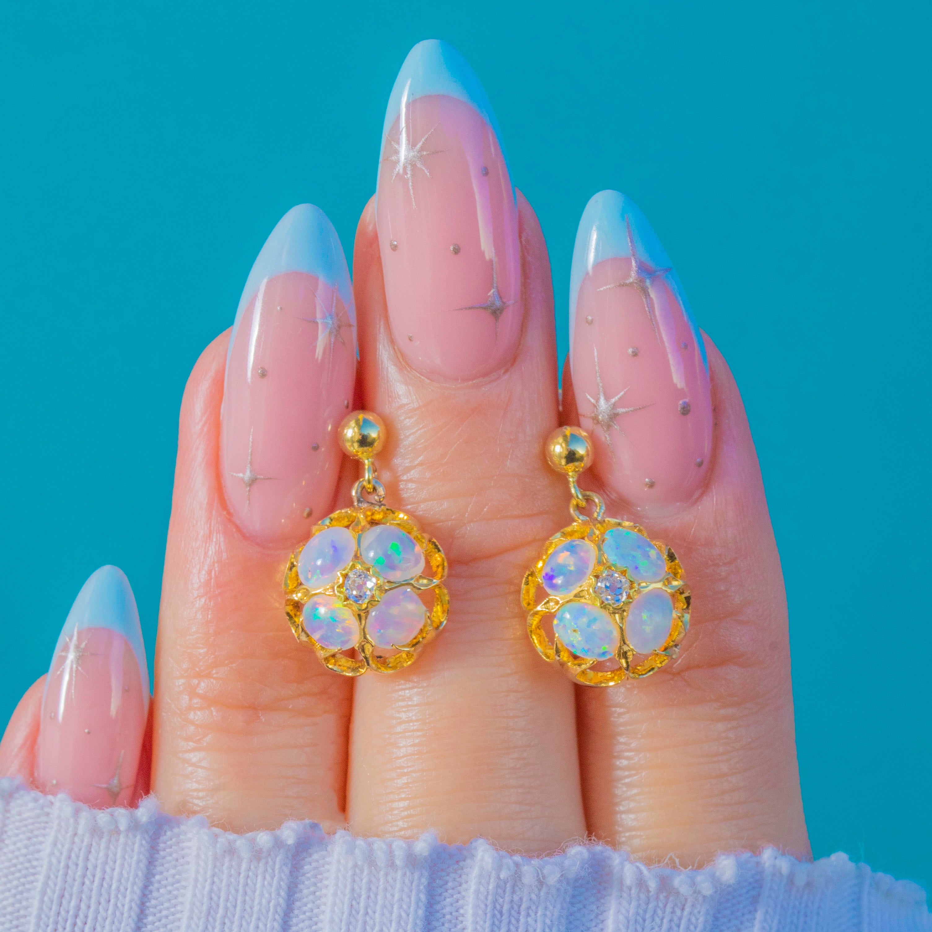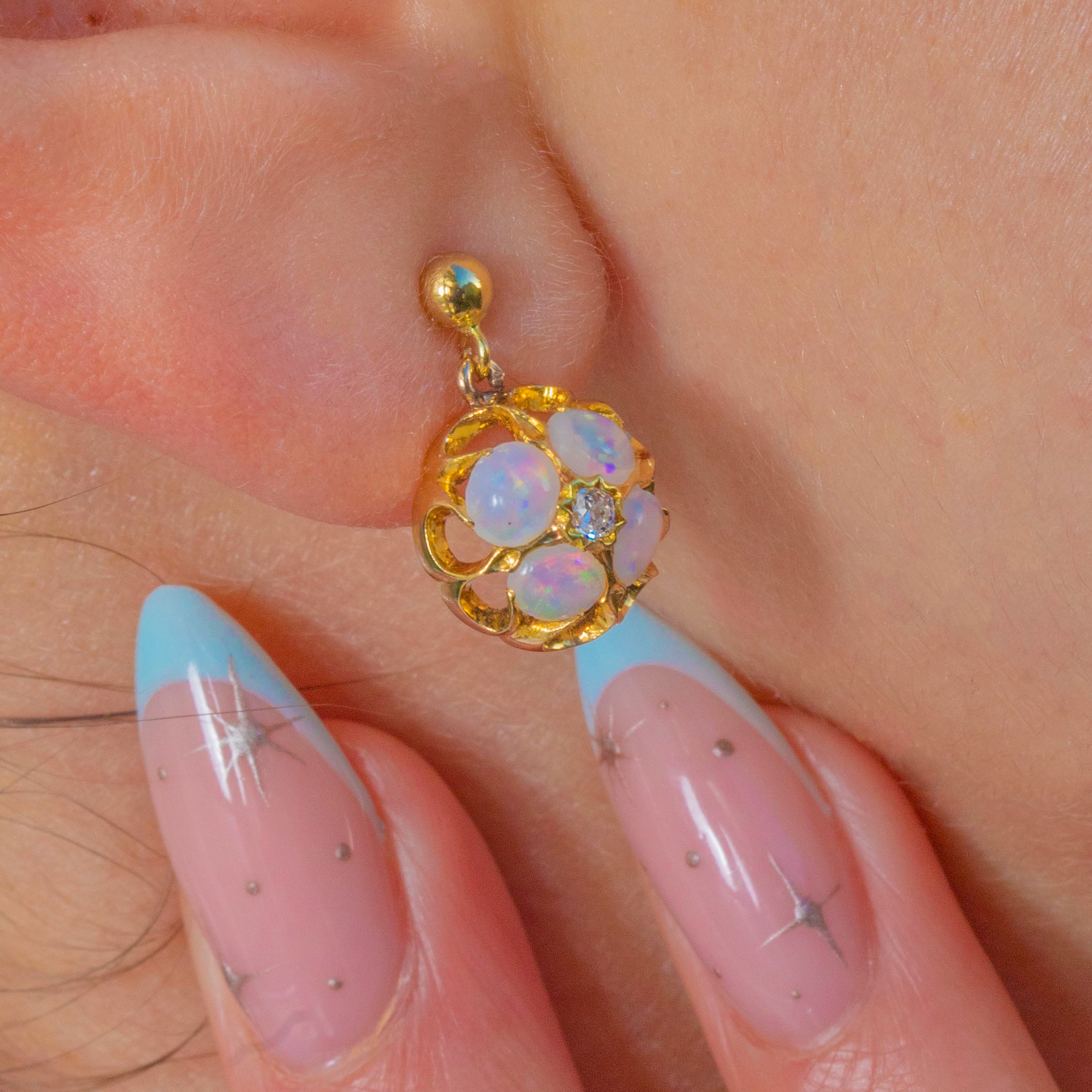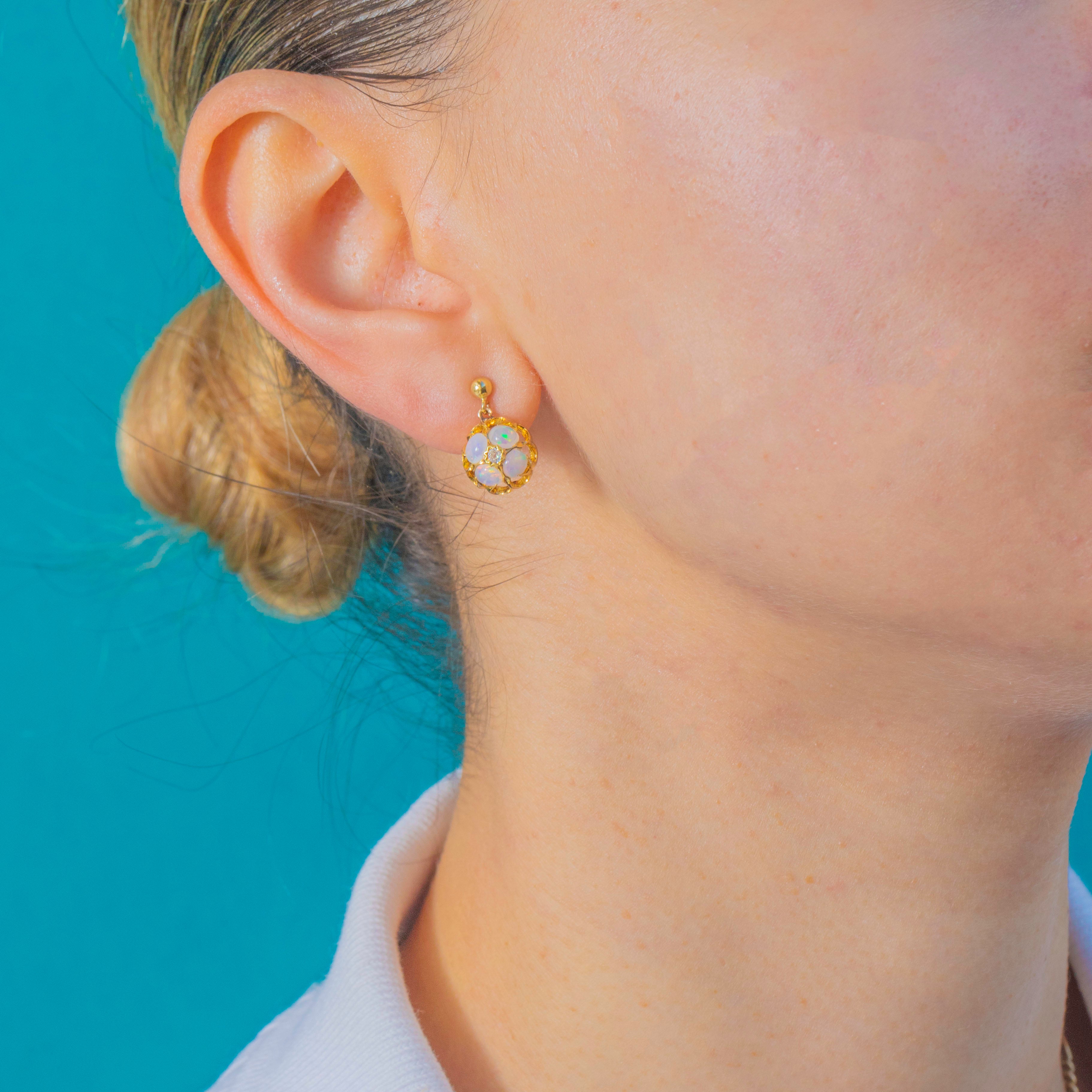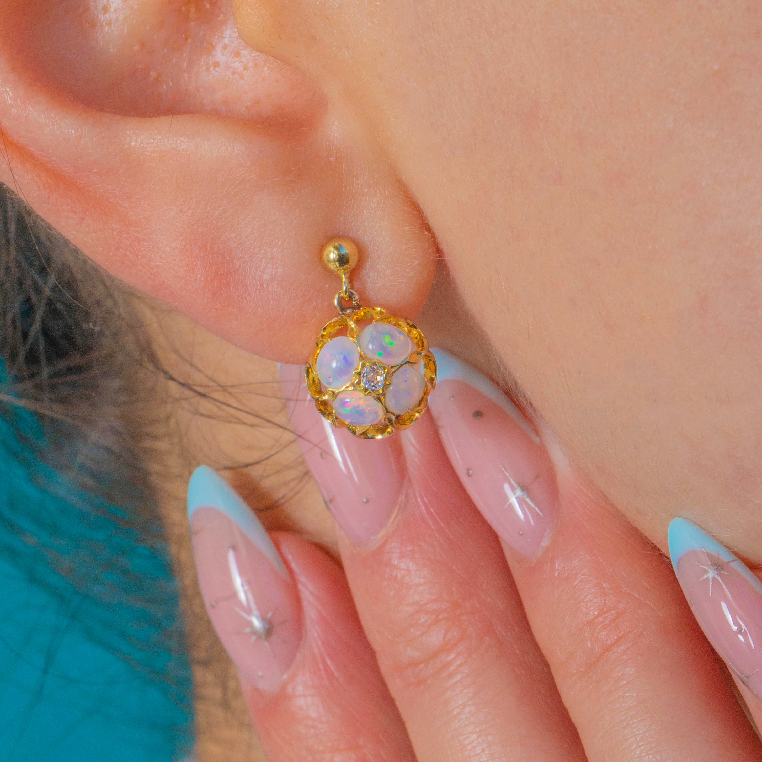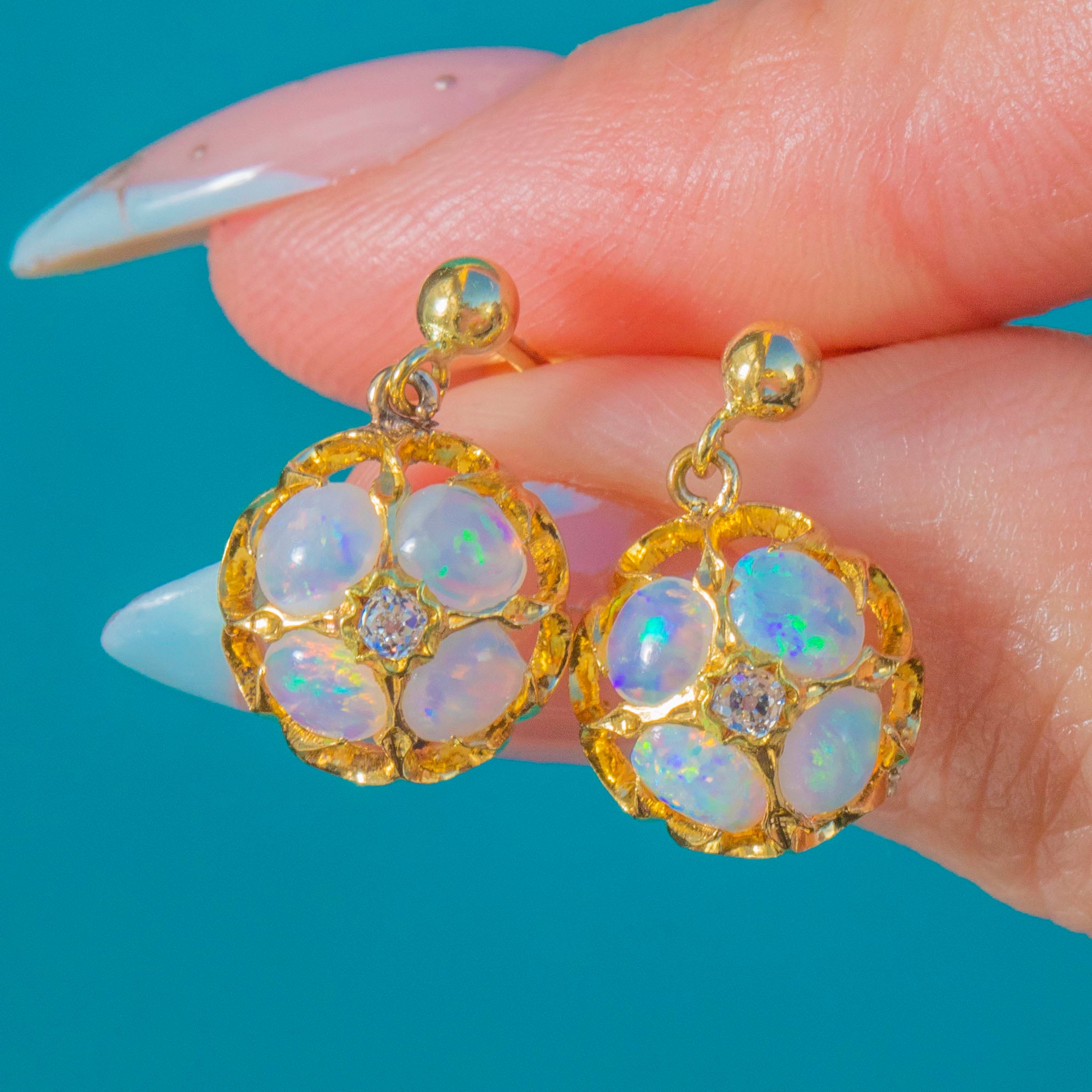 A dainty flourish of Edwardian elegance, these 18ct Gold cluster drops shimmer with natural solid Opals and sparkling Diamond centres. Each petite rosette showcases four Opal cabochons alive with blue, green and soft orange play-of-colour, encircling an old mine cut Diamond and framed by a scalloped border for timeless charm.
