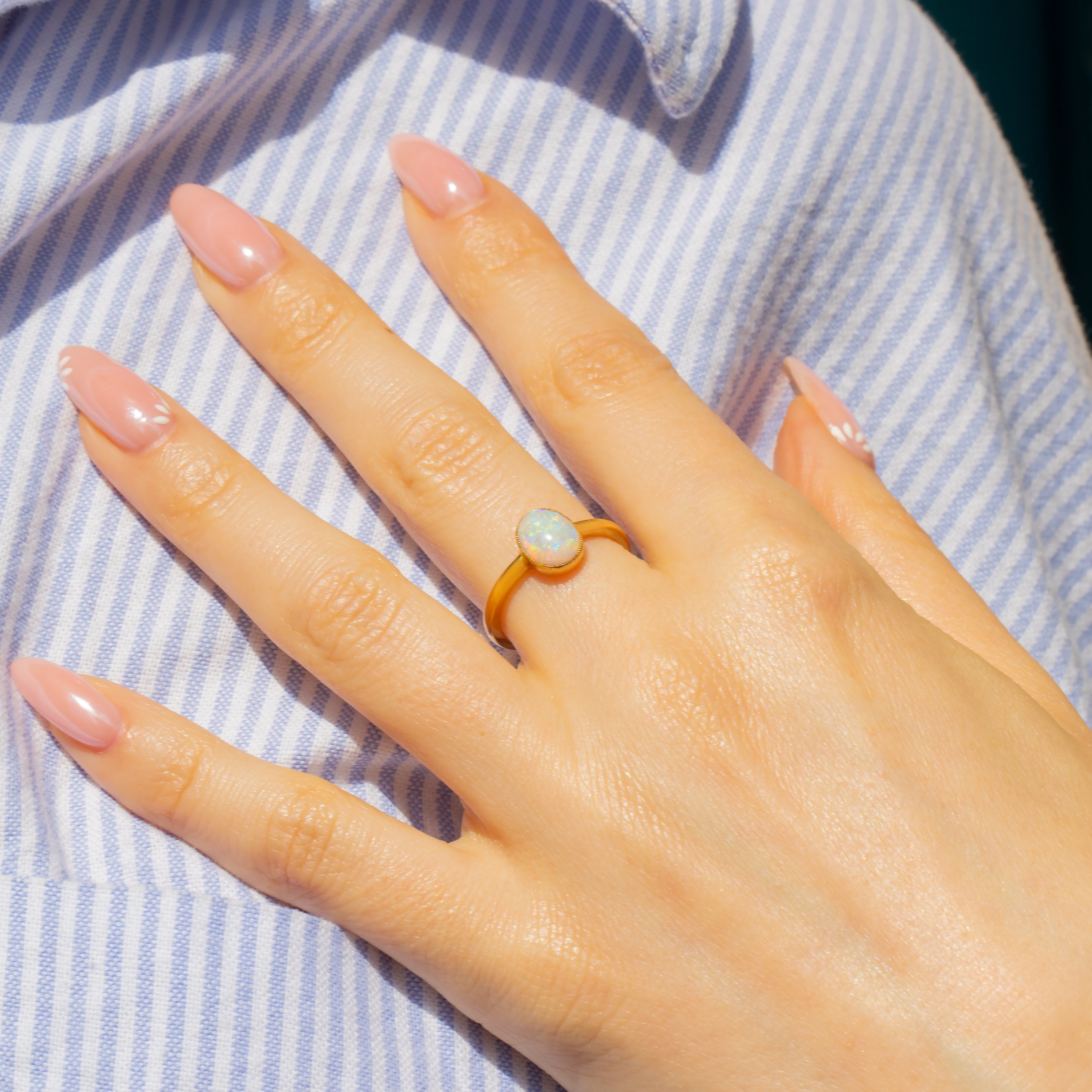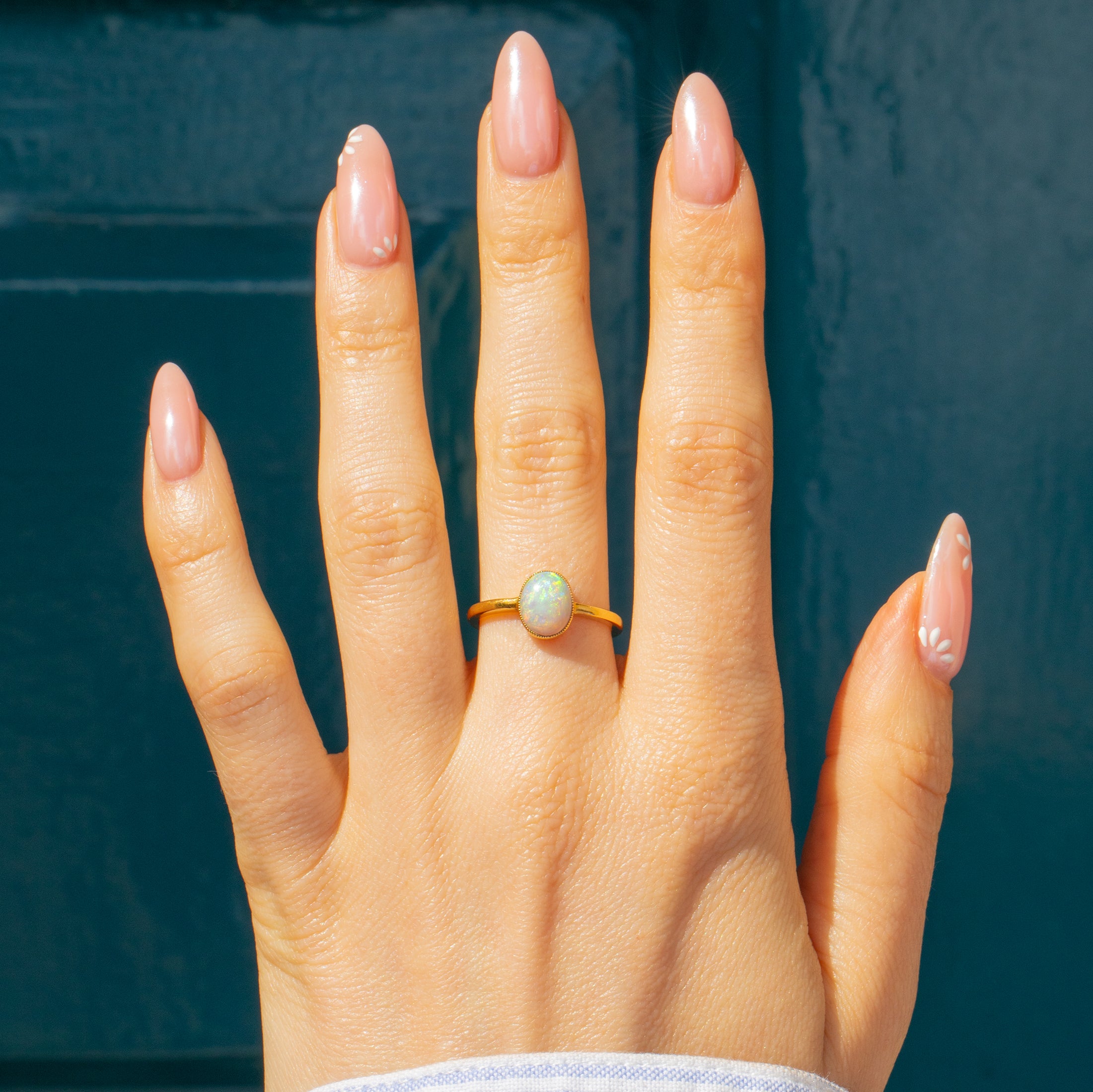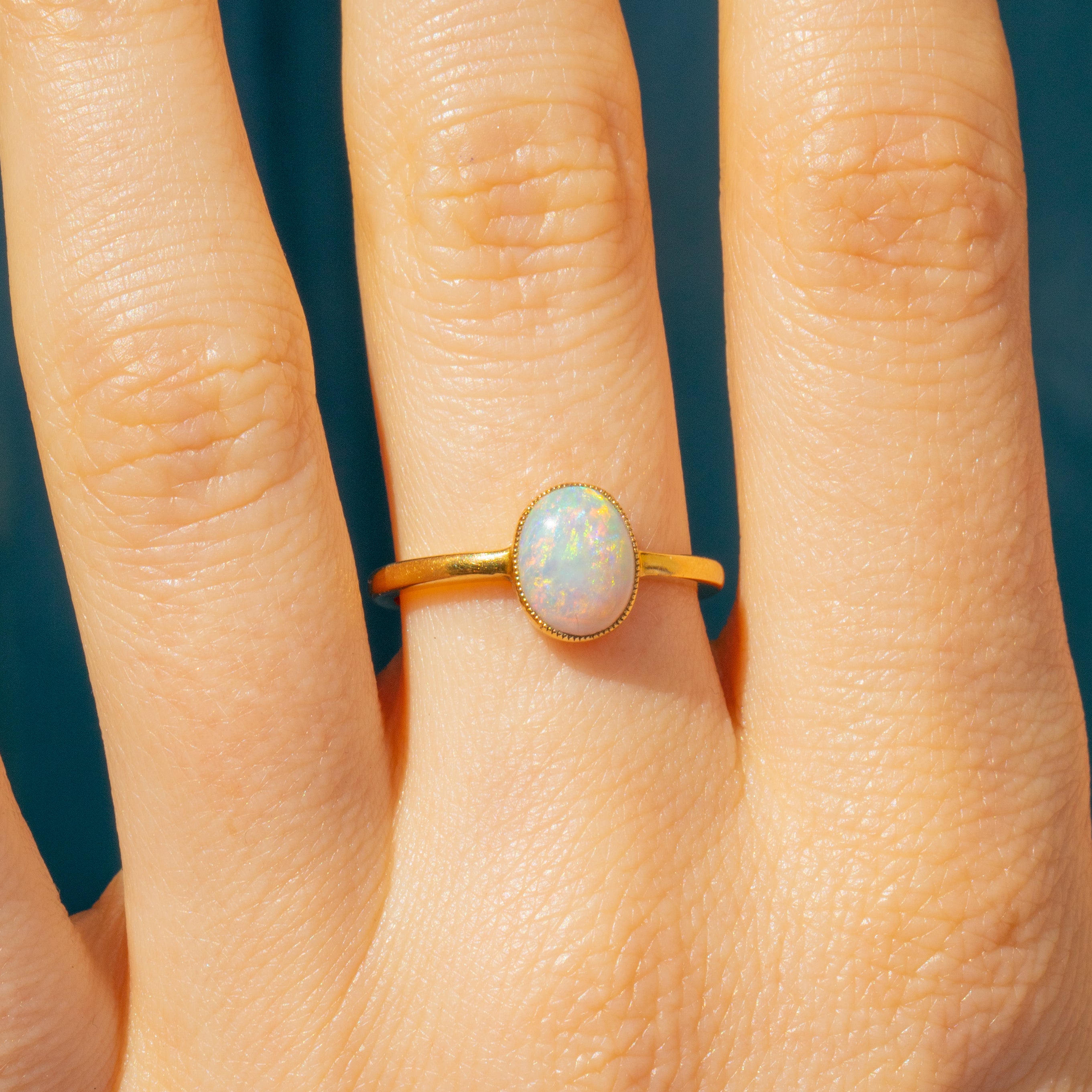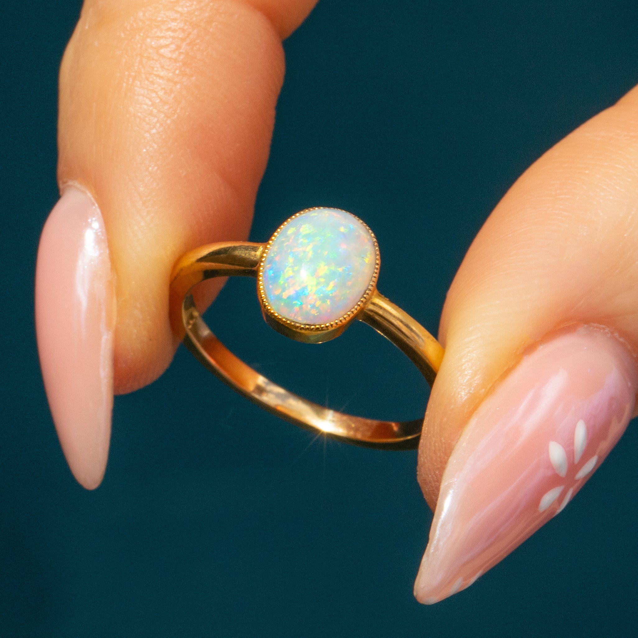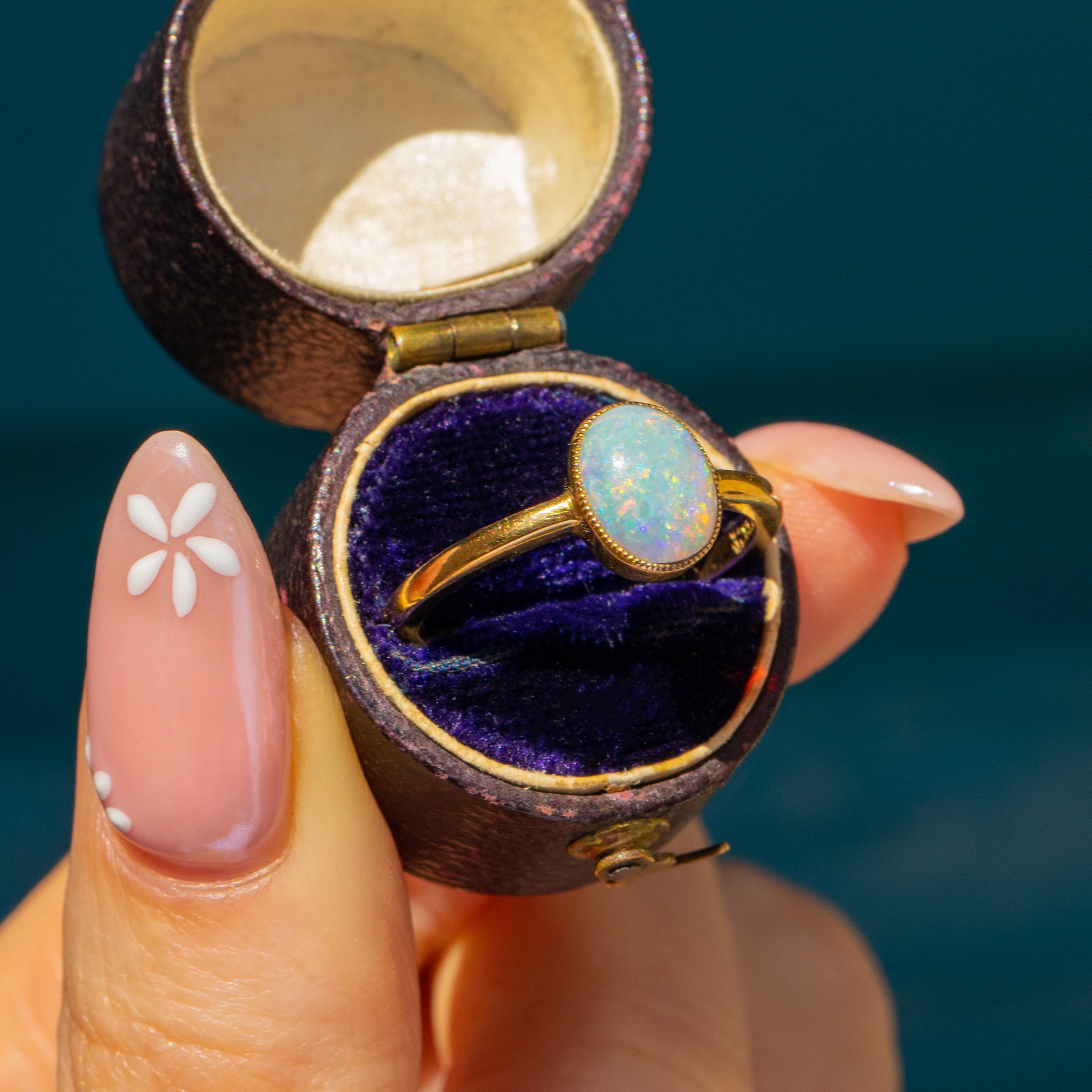 The 0.70ct Opal rests within a petite bezel setting, giving the piece a sleek and sophisticated finish. This pretty piece will go a long way in adding intrigue and beauty to your antique jewellery collection!