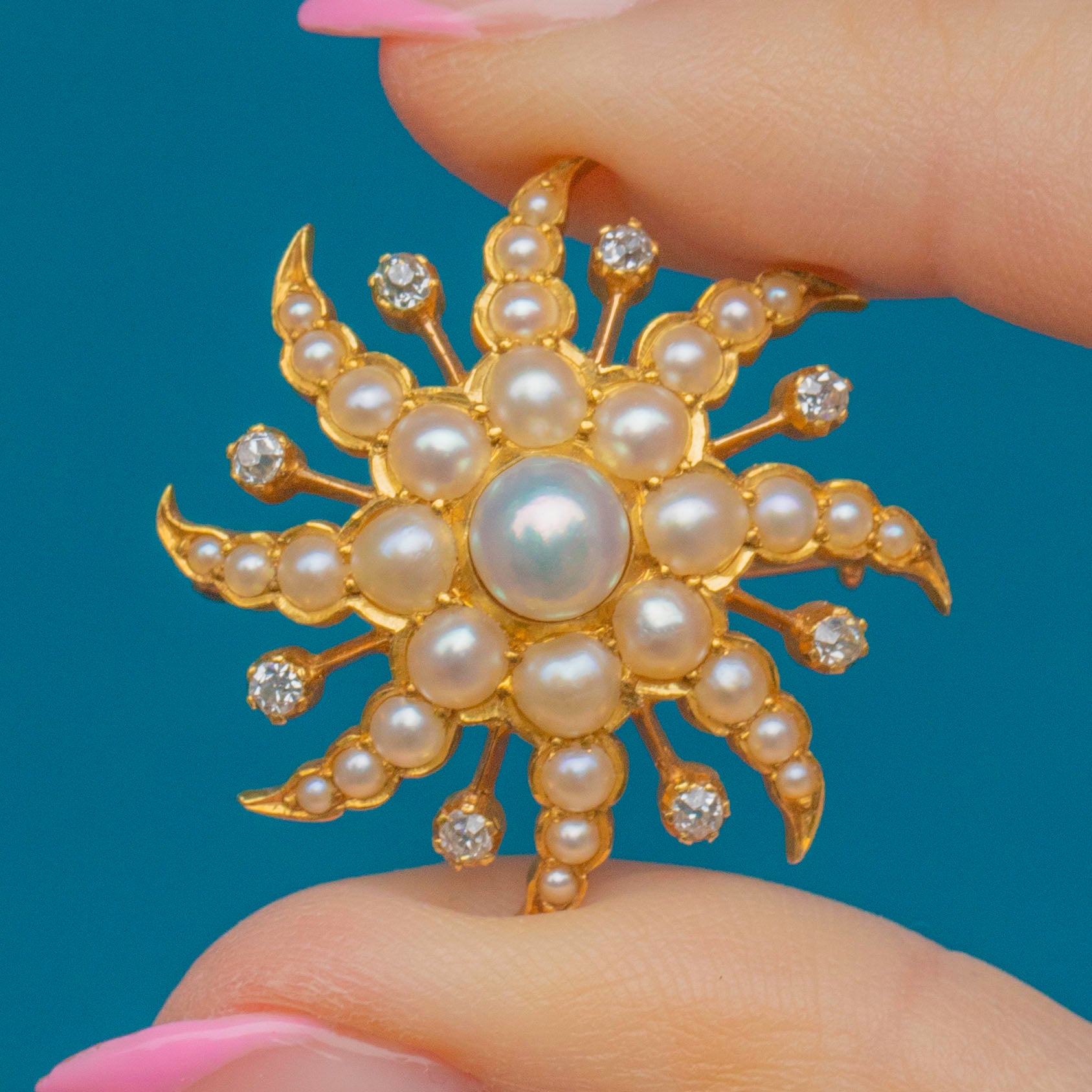 EXCELLENT. This antique 15ct Gold Pearl starburst pendant is in excellent condition. Each Pearl is secure and present, with a myriad of shimmering hues throughout. The Diamonds are all present and free from fleabites, providing a twinkling accent. The structural integrity of the piece has withheld the test of time and has retained its superb starburst form effortlessly. On the back, her detachable brooch fittings are in perfect working condition!