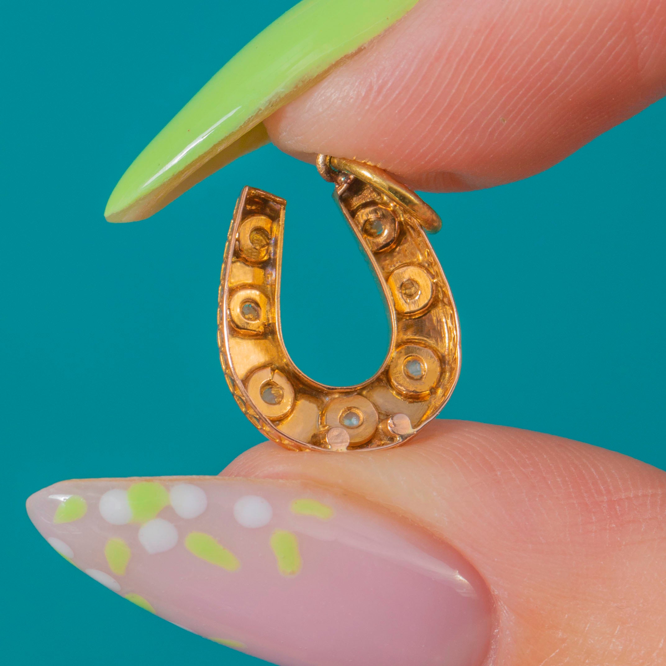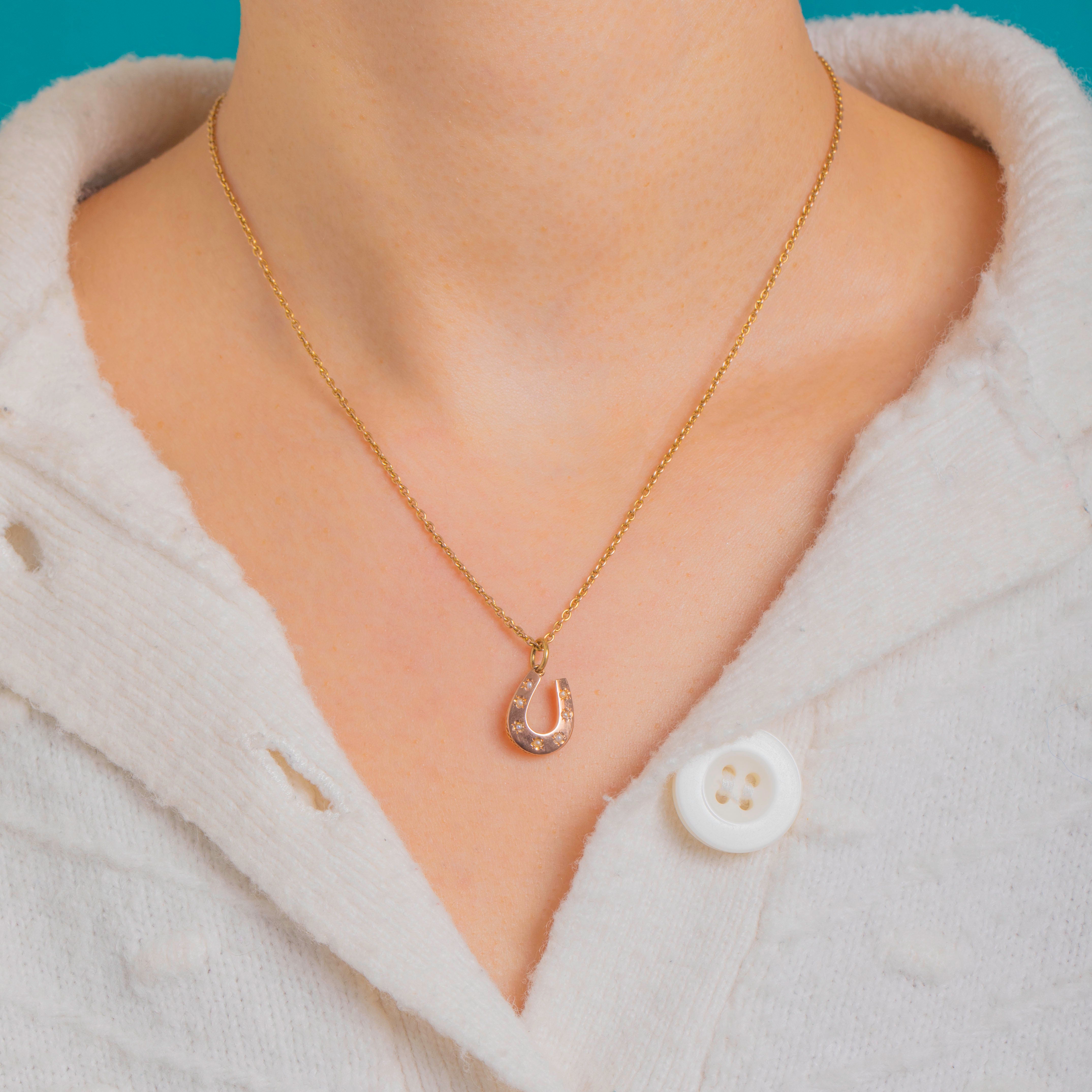A dainty Victorian lucky horseshoe charm crafted in glowing 18ct Gold, set with six tiny Pearls nestled into crisp starburst-engraved settings. The luminous Pearls lend a soft glow against the warm Gold, while the classic motif brings an elegant whisper of sentiment and good fortune.