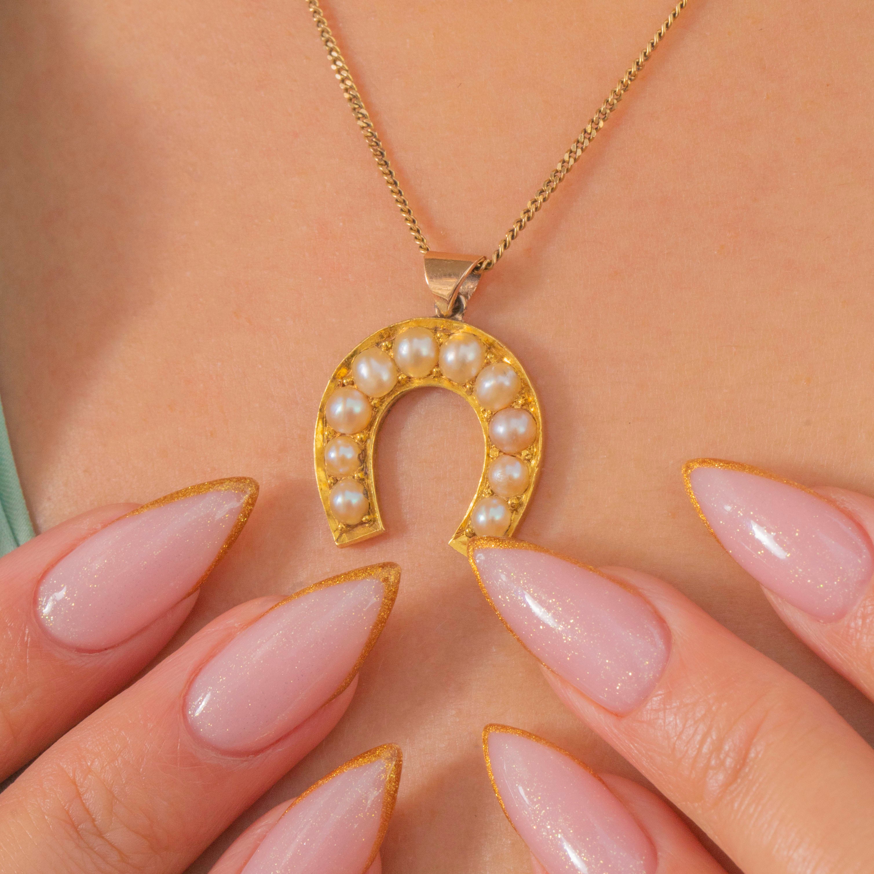A charming Victorian Pearl horseshoe pendant, crafted in rich 18ct Yellow Gold. Each creamy Pearl is individually set and beautifully matched, their soft ivory tones shimmering with subtle blush and champagne overtones.