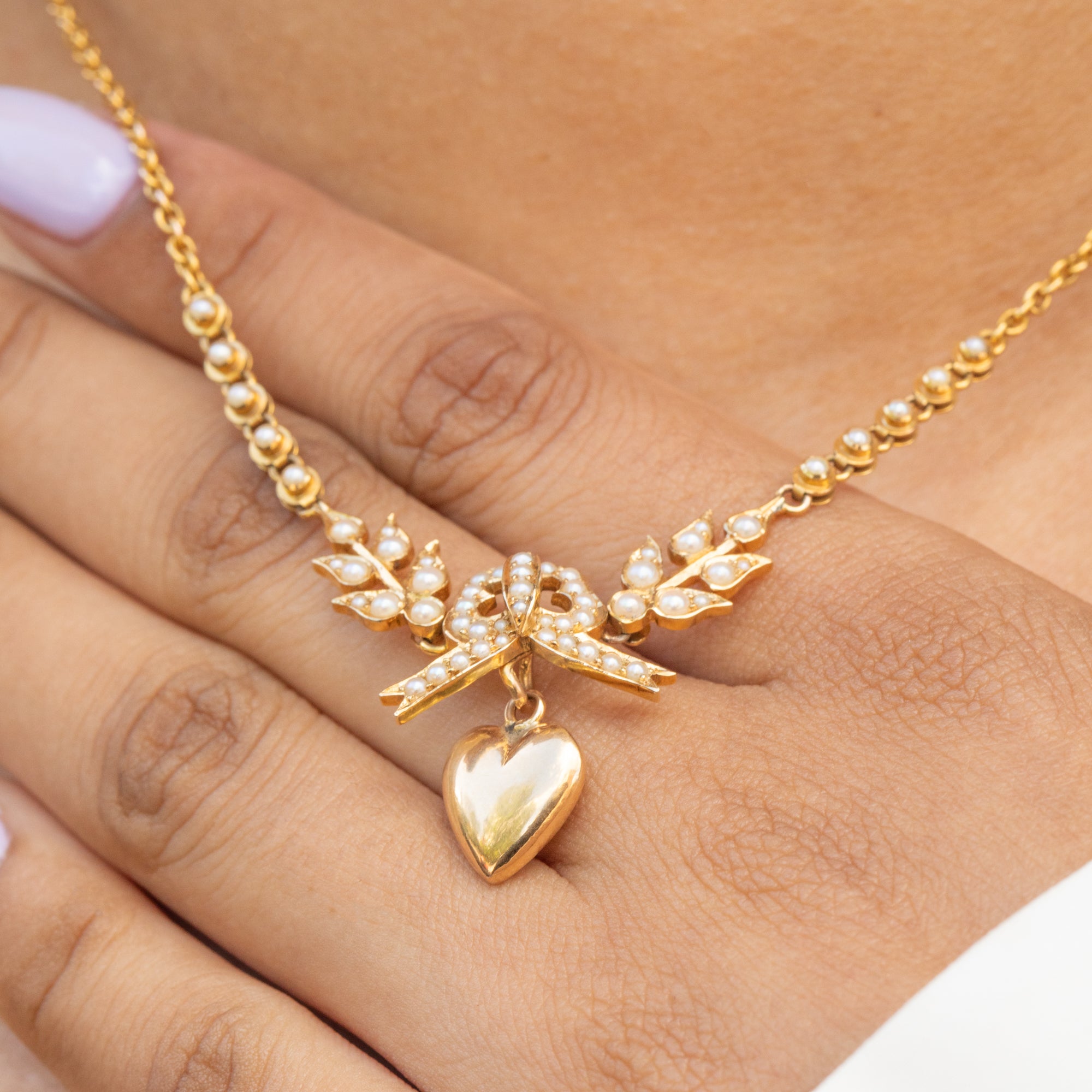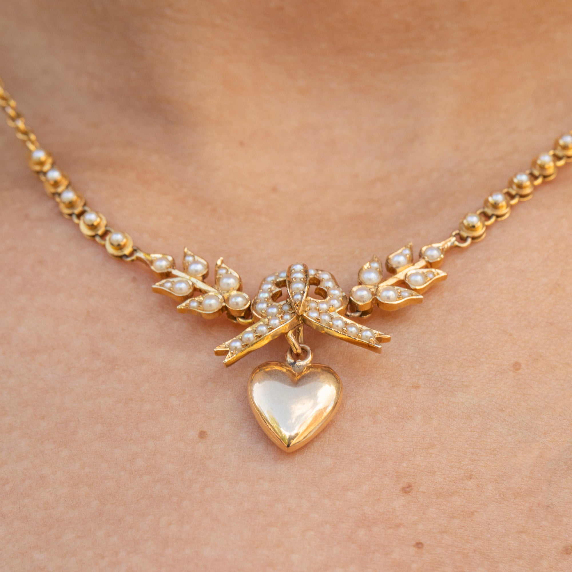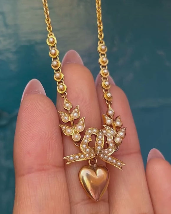 EXCELLENT. This antique 18ct Gold Pearl necklace is in excellent condition! Each Pearl is present and secure, with a plump form and no damage to the nacre. All of the components are securely affixed providing a fluid movement as she adorns your neck. The 18ct Gold is saturated with a wonderful lustre with no damage to note, and the chain is in top nick. The hook suspending the heart securely holds it in place but allows for easy removal. With a barrel clasp that shuts with a satisfying 'click', wear this antique bow necklace with the utmost confidence!