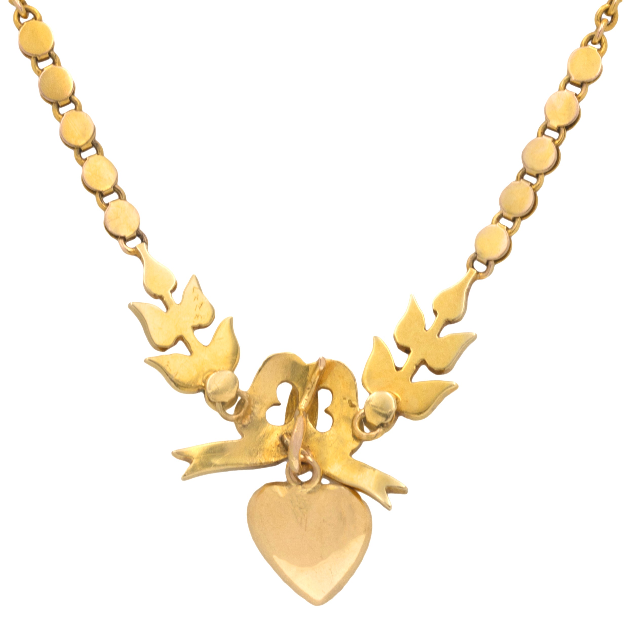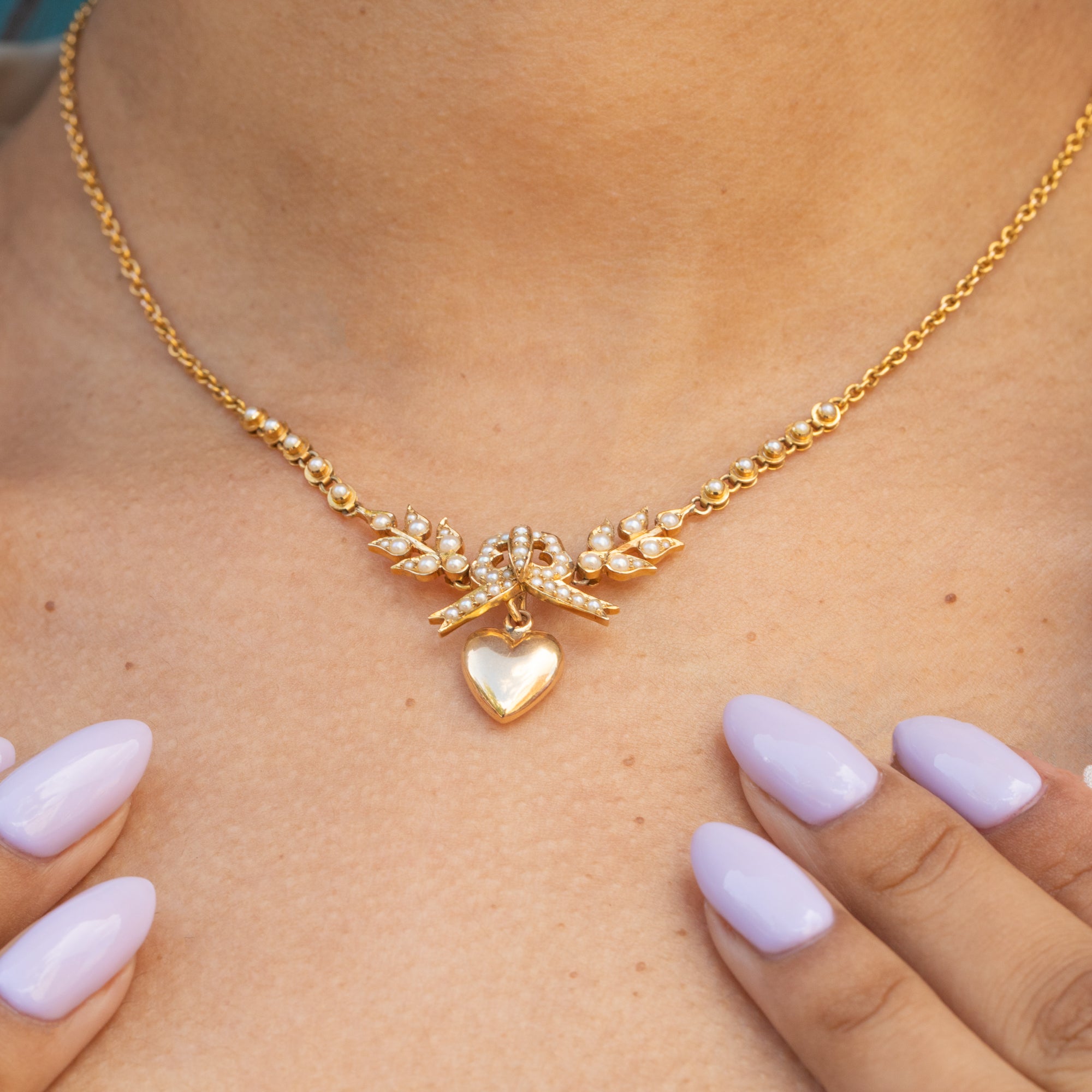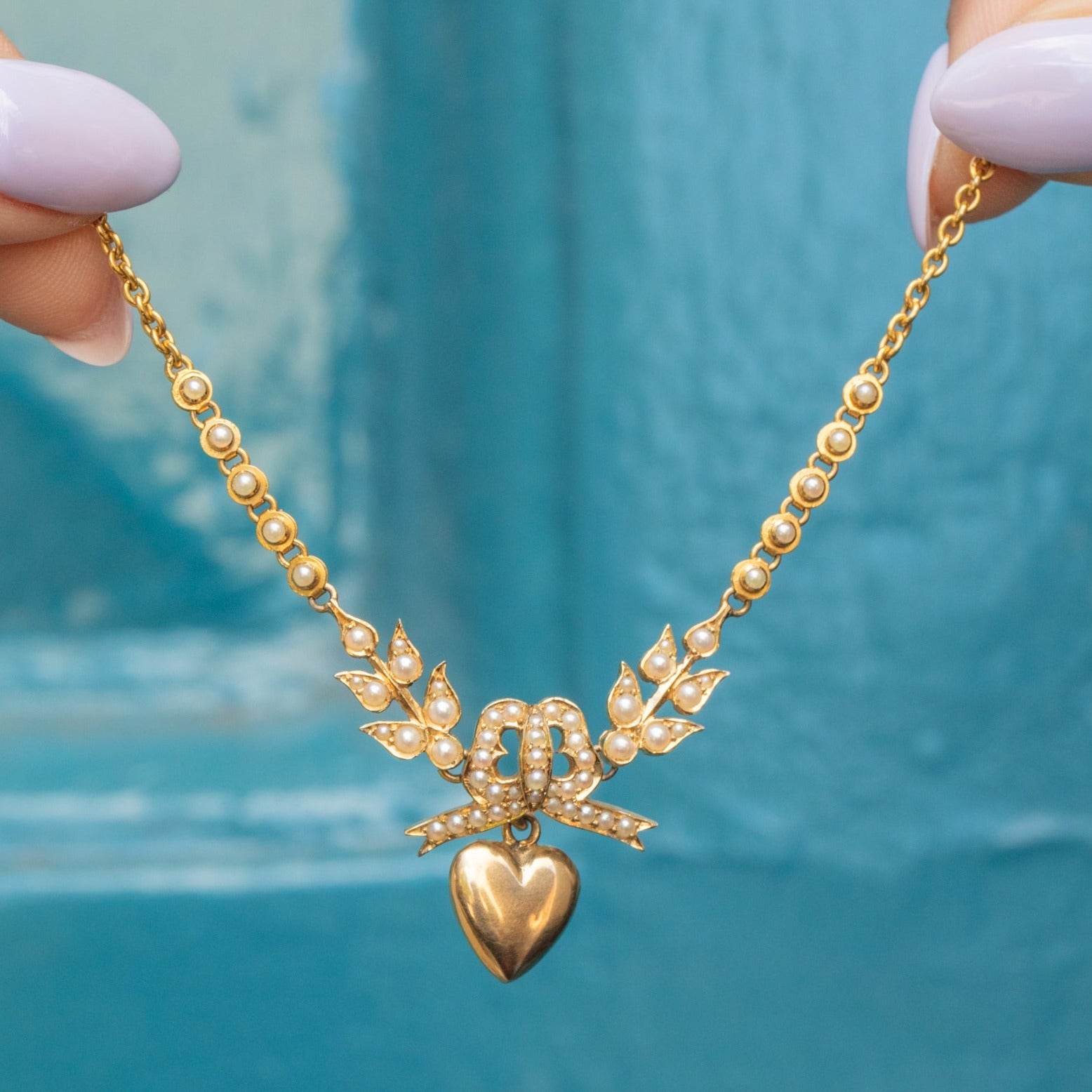 EXCELLENT. This antique 18ct Gold Pearl necklace is in excellent condition! Each Pearl is present and secure, with a plump form and no damage to the nacre. All of the components are securely affixed providing a fluid movement as she adorns your neck. The 18ct Gold is saturated with a wonderful lustre with no damage to note, and the chain is in top nick. The hook suspending the heart securely holds it in place but allows for easy removal. With a barrel clasp that shuts with a satisfying 'click', wear this antique bow necklace with the utmost confidence!