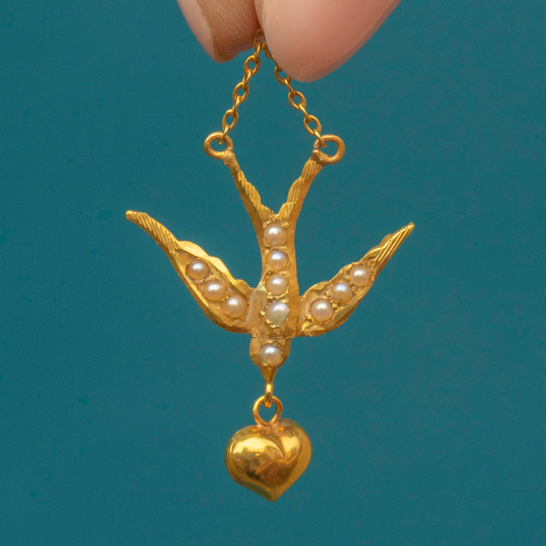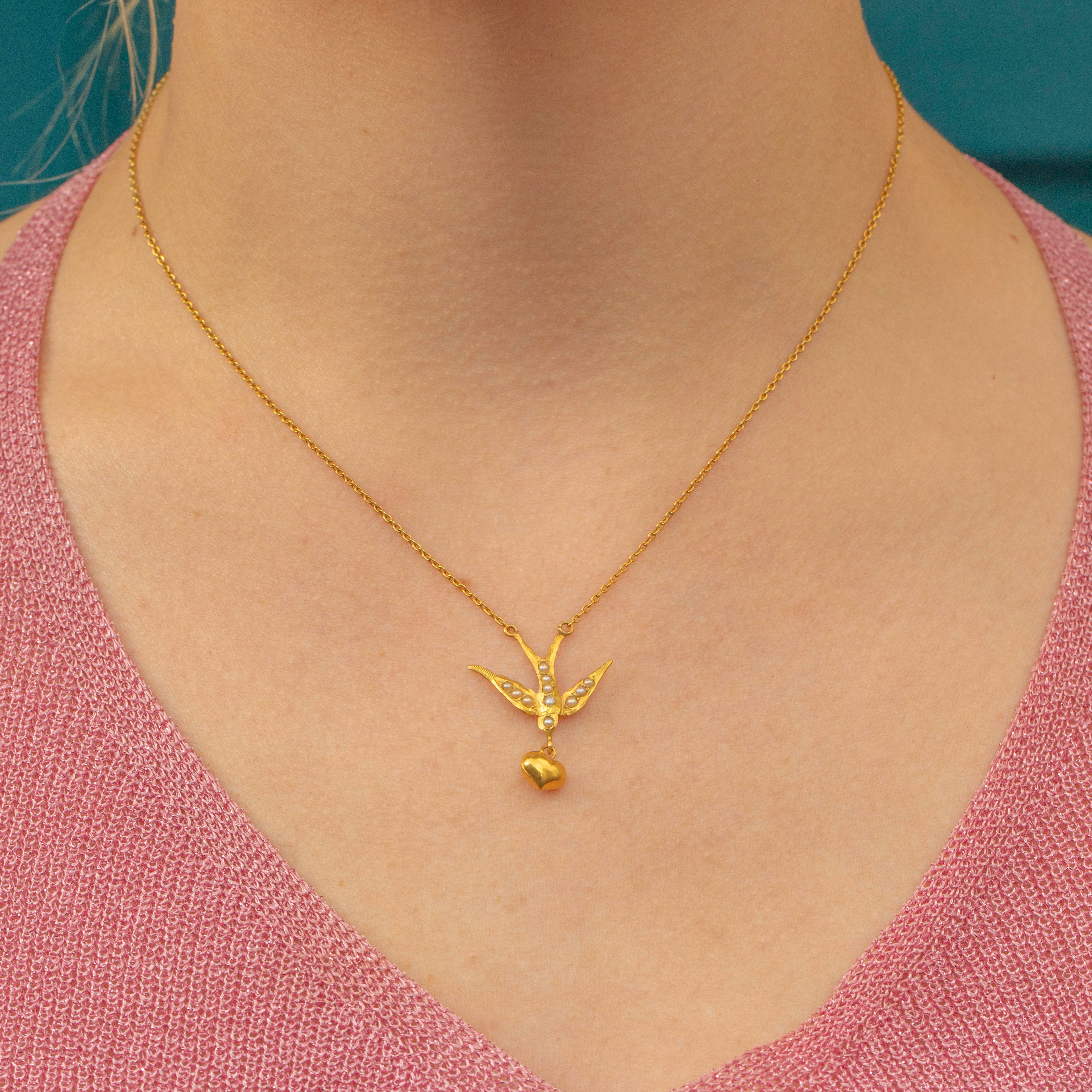 Let this antique 18ct Gold Pearl swallow drop necklace fly into your jewellery collection! Poised between two chains sits a sweeping swallow, formed of glossy 15ct Gold studded with shimmering Pearls across her curvaceous form.