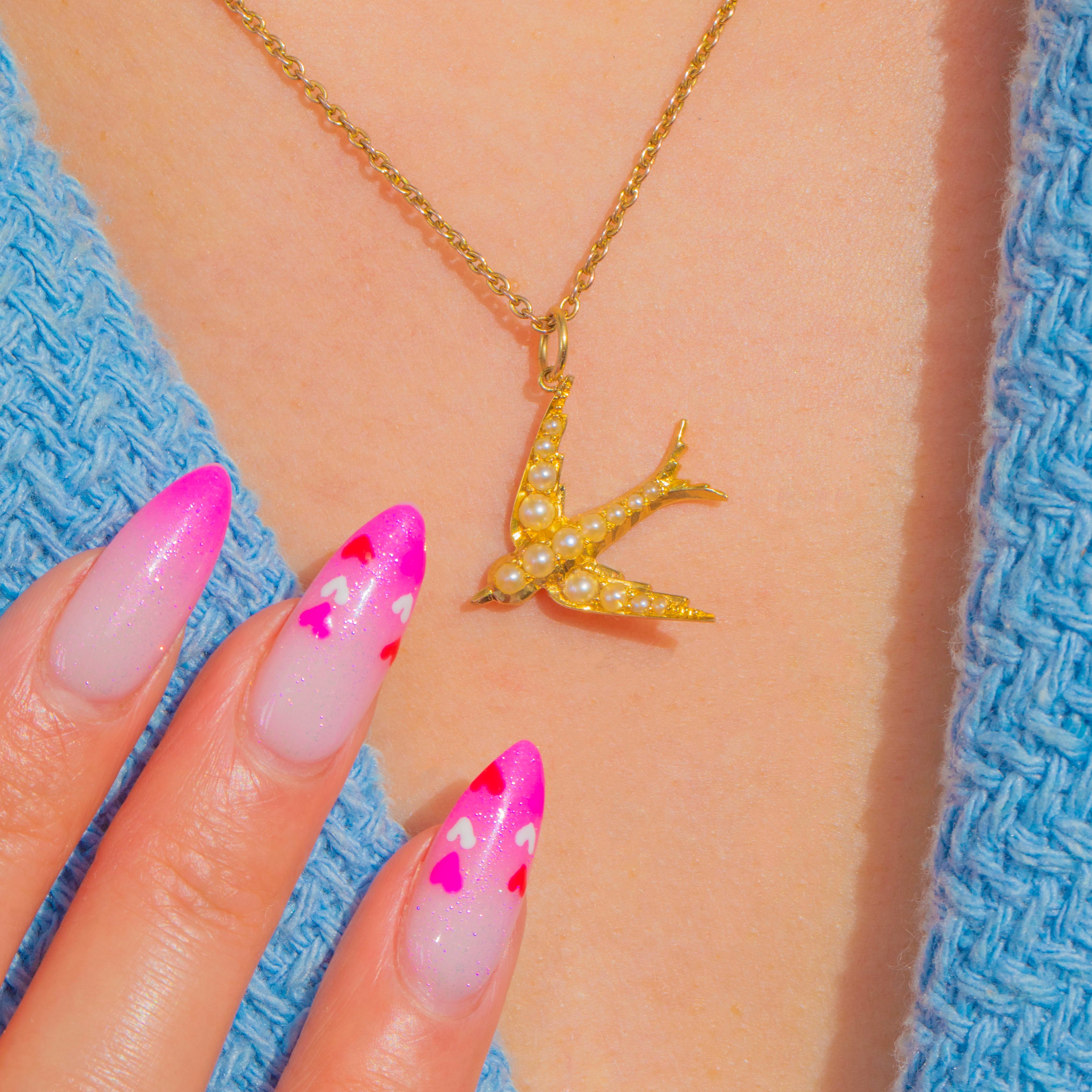 A charming Victorian swallow pendant crafted in rich 18ct Gold and set with softly lustrous Seed Pearls. Symbolic of love, loyalty and safe return, the swallow is a beloved motif of the era, here realised in a graceful, streamlined silhouette that feels timeless and romantic.