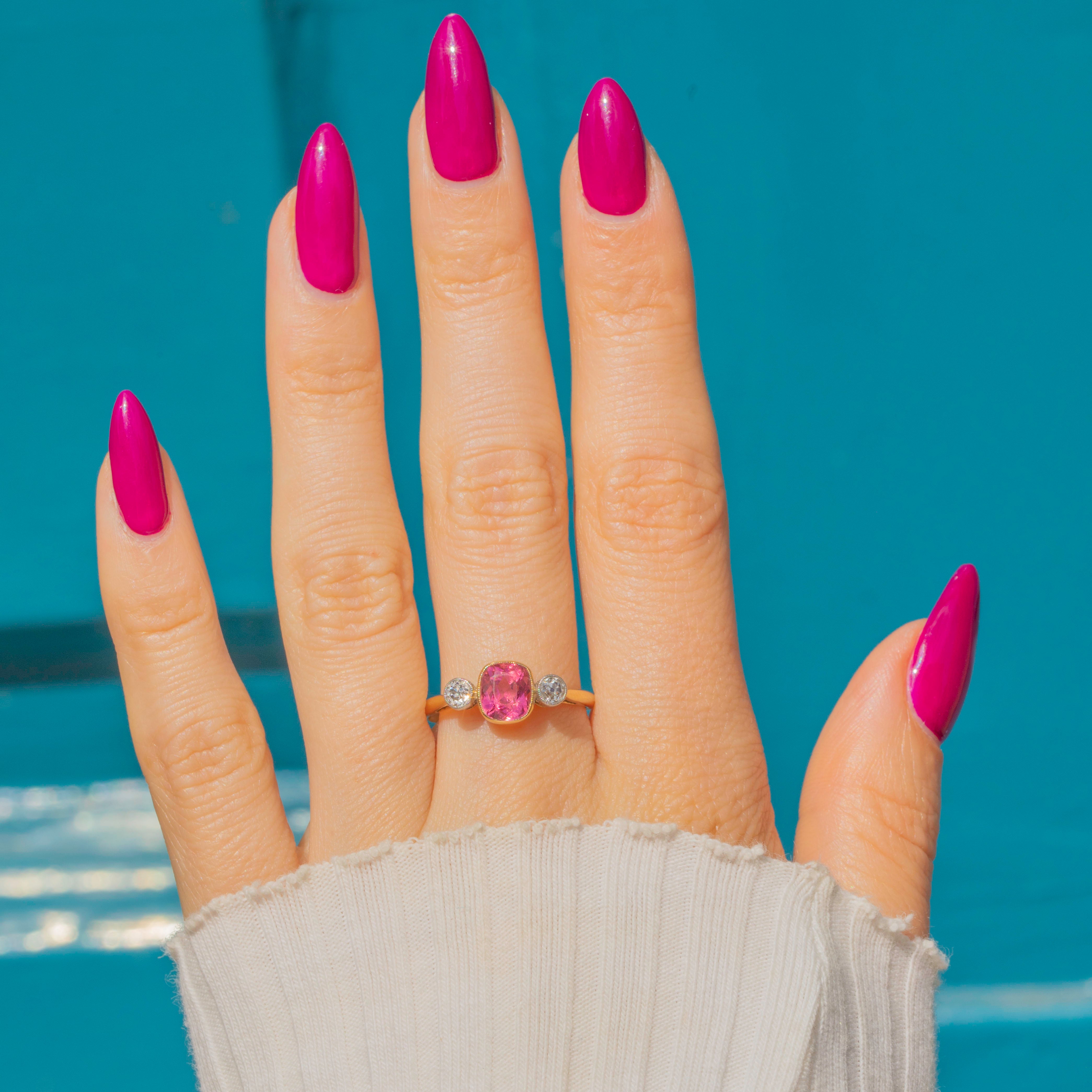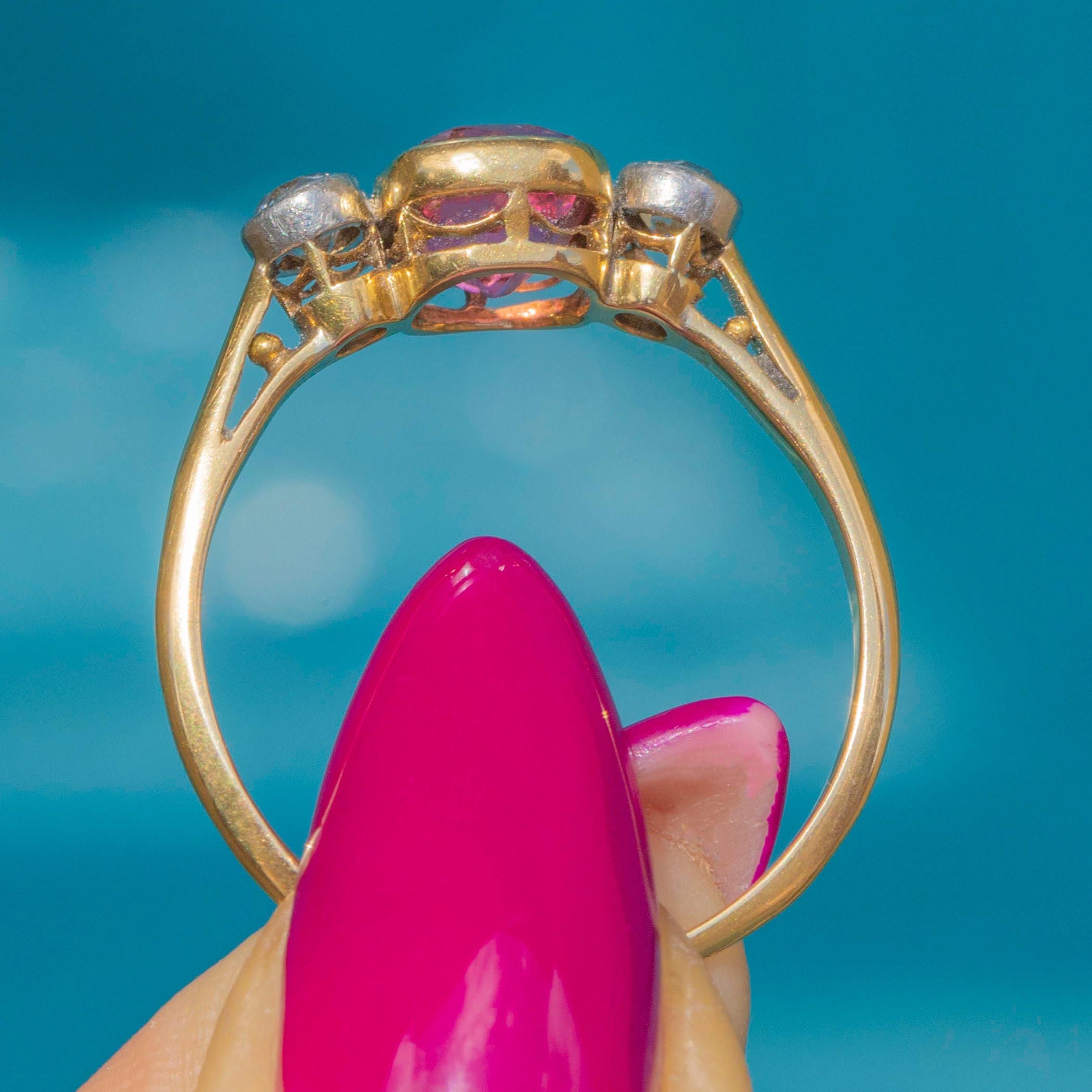 This Art Deco ring is centred by a resplendent 0.90ct pink Tourmaline, faceted beautifully and radiating saturated fuchsia tones as it catches the light. The Tourmaline is flanked by scintillating Diamonds, each set in buttery 18ct Gold bezels.