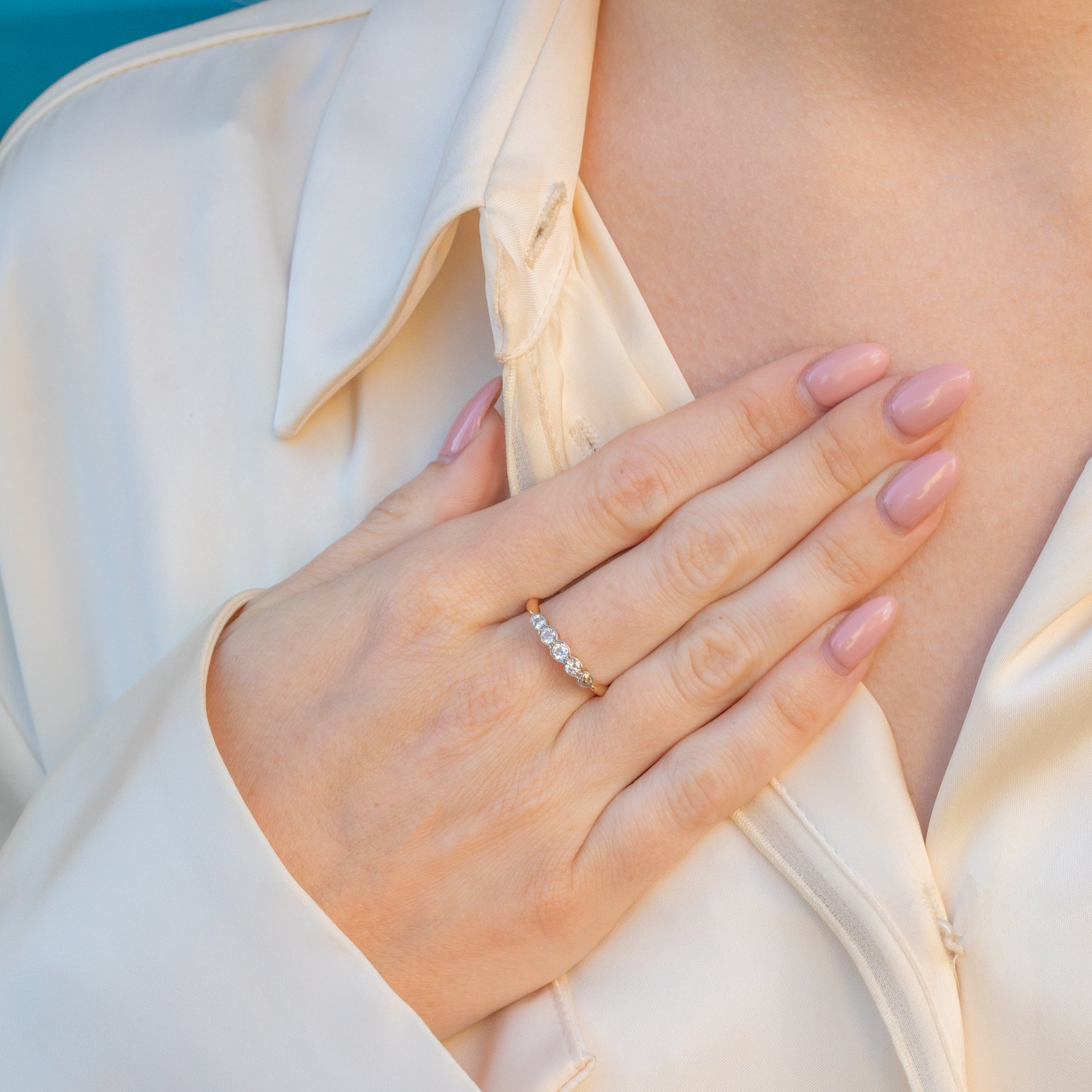 How delightful is this antique 18ct Gold & Platinum Diamond five stone ring?! This delicate beauty boasts five scintillating Diamonds, each with a lovely sparkle, nestled in brilliant Platinum settings.