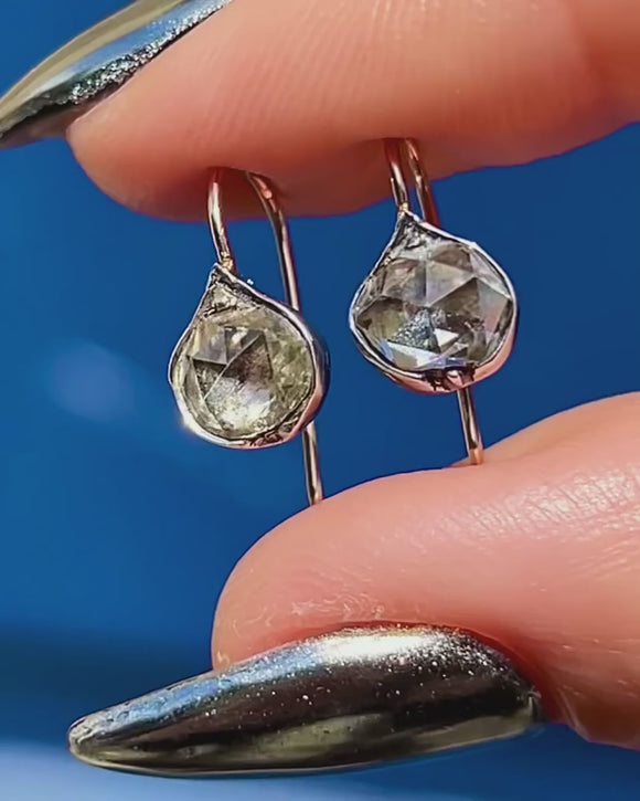 These antique 18ct Gold rose-cut Diamond earrings are an exquisite pair! Each earring drop boasts a fabulous 0.60ct rose-cut Diamond, with a high profile and perfectly geometric facets that will provide your lobes with endless sparkle.
