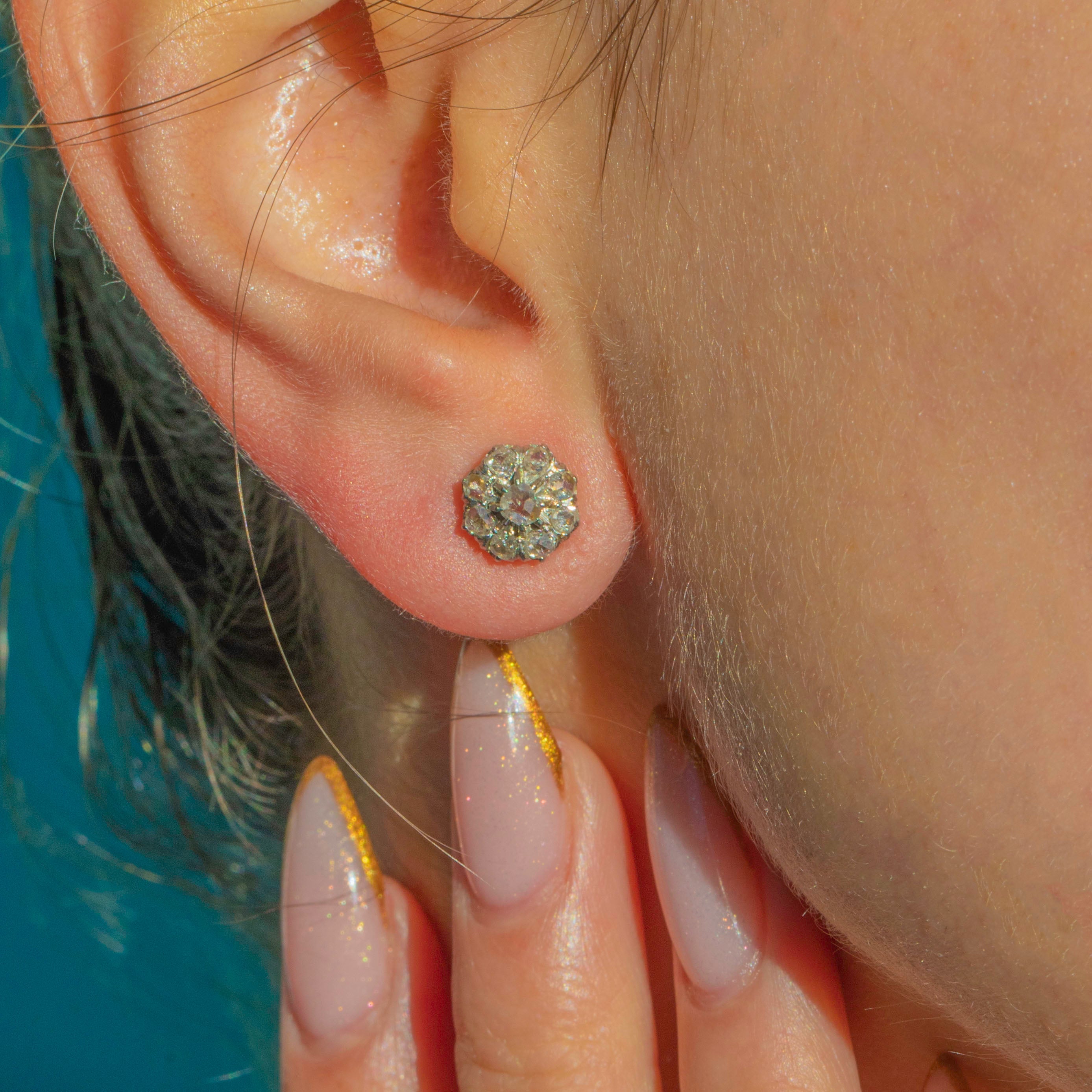 These charming Victorian cluster studs are everything we love about antique Diamonds in an easy, everyday silhouette. Each earring is formed as a pretty floral cluster, centring a slightly larger rose-cut Diamond in a halo of six smaller stones, all set in rich 18ct Gold. The result is a sparkling cushion of light that sits perfectly on the lobe.
