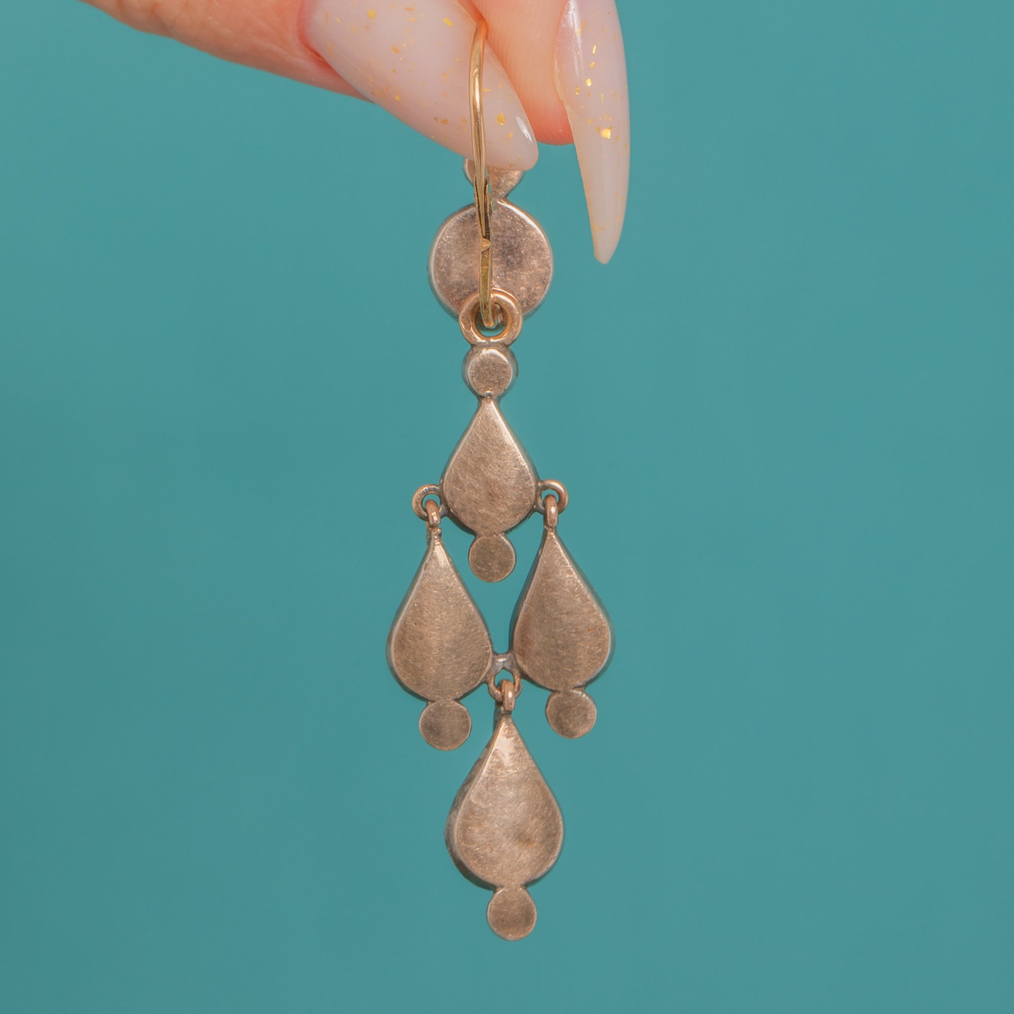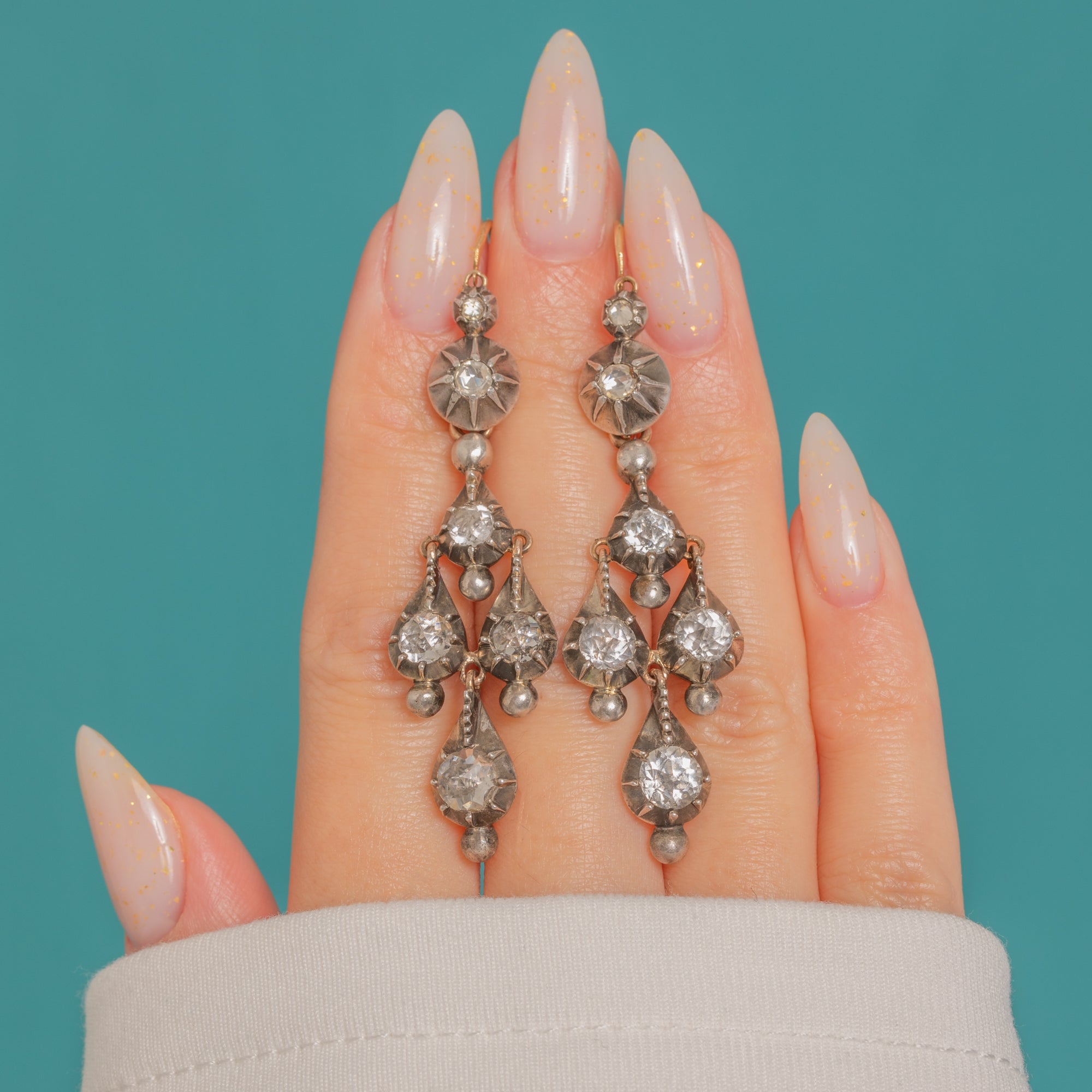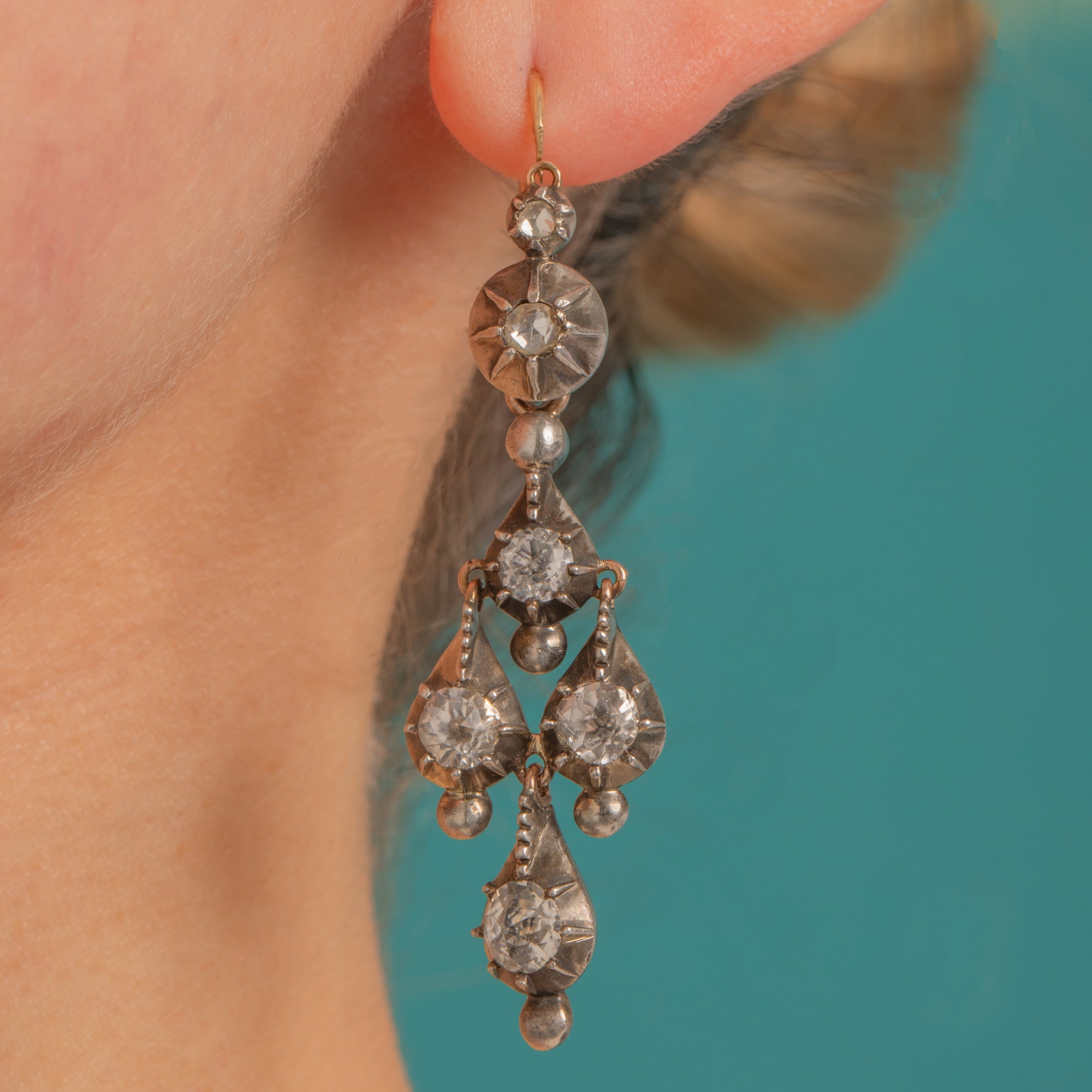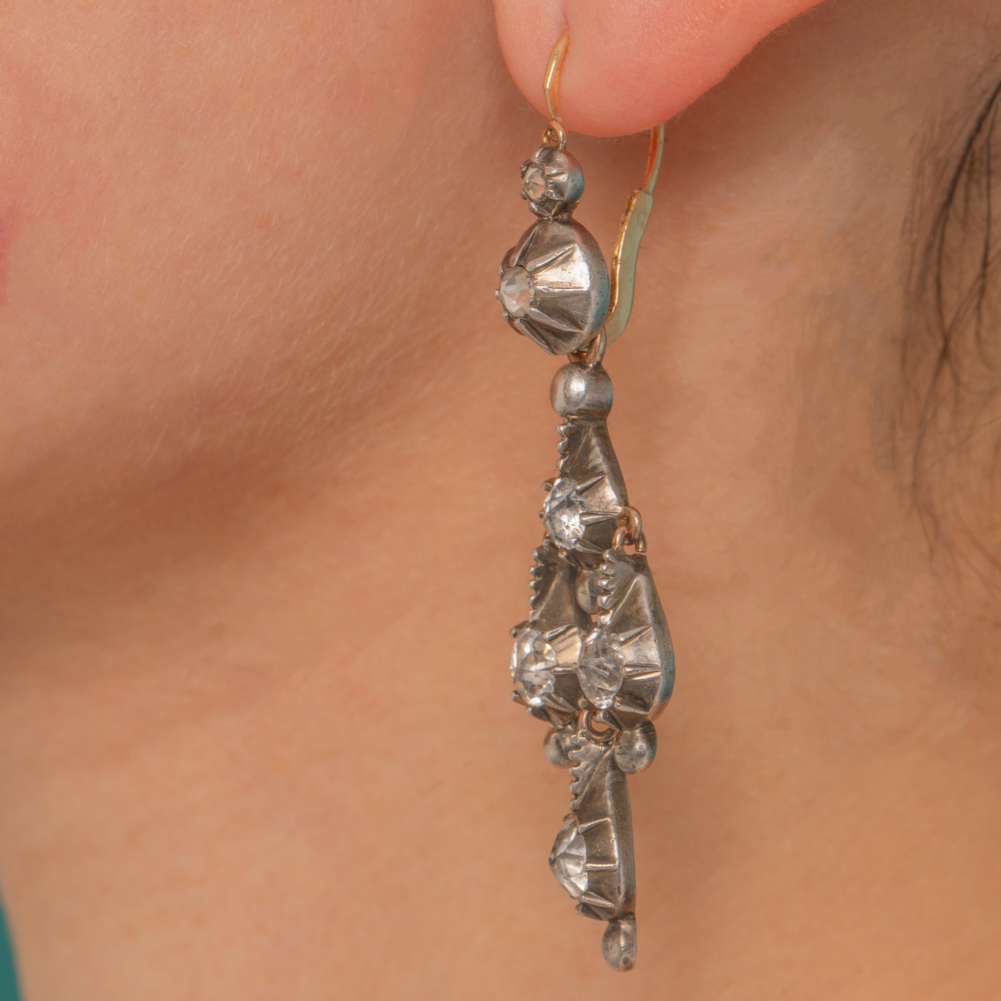 Wear the refined “day” tops alone for a delicate sparkle, then attach the cascading “night” drops for a dramatic, pendeloque silhouette that shimmers with movement. The Rock Crystals are rose-cut in style, catching the light with a soft, antique brilliance, and the mellow patina across the metalwork only heightens their historic charm.