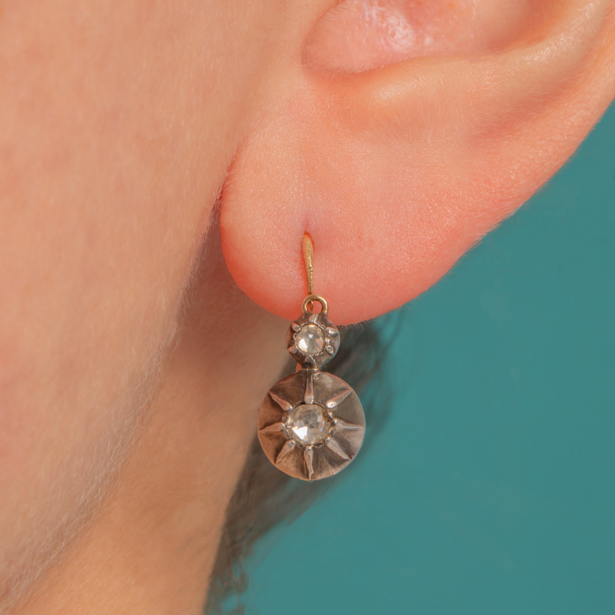 Breathing romance from the Victorian era, these day & night earrings marry luminous Rock Crystal with twinkling Paste (Jargoon) in a beautifully articulated girandole design. The fronts are Silver-set with cut-down collets and starburst-engraved plaques, while the backs and hooks glow with rich 18ct Gold, creating that coveted two-tone allure.