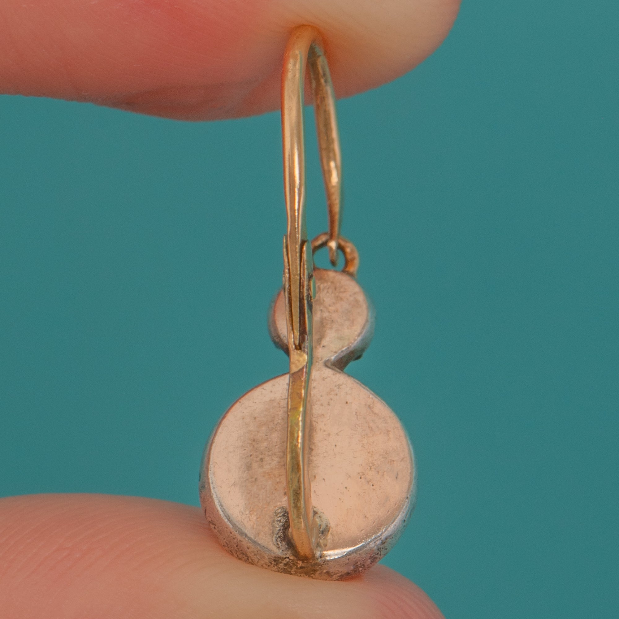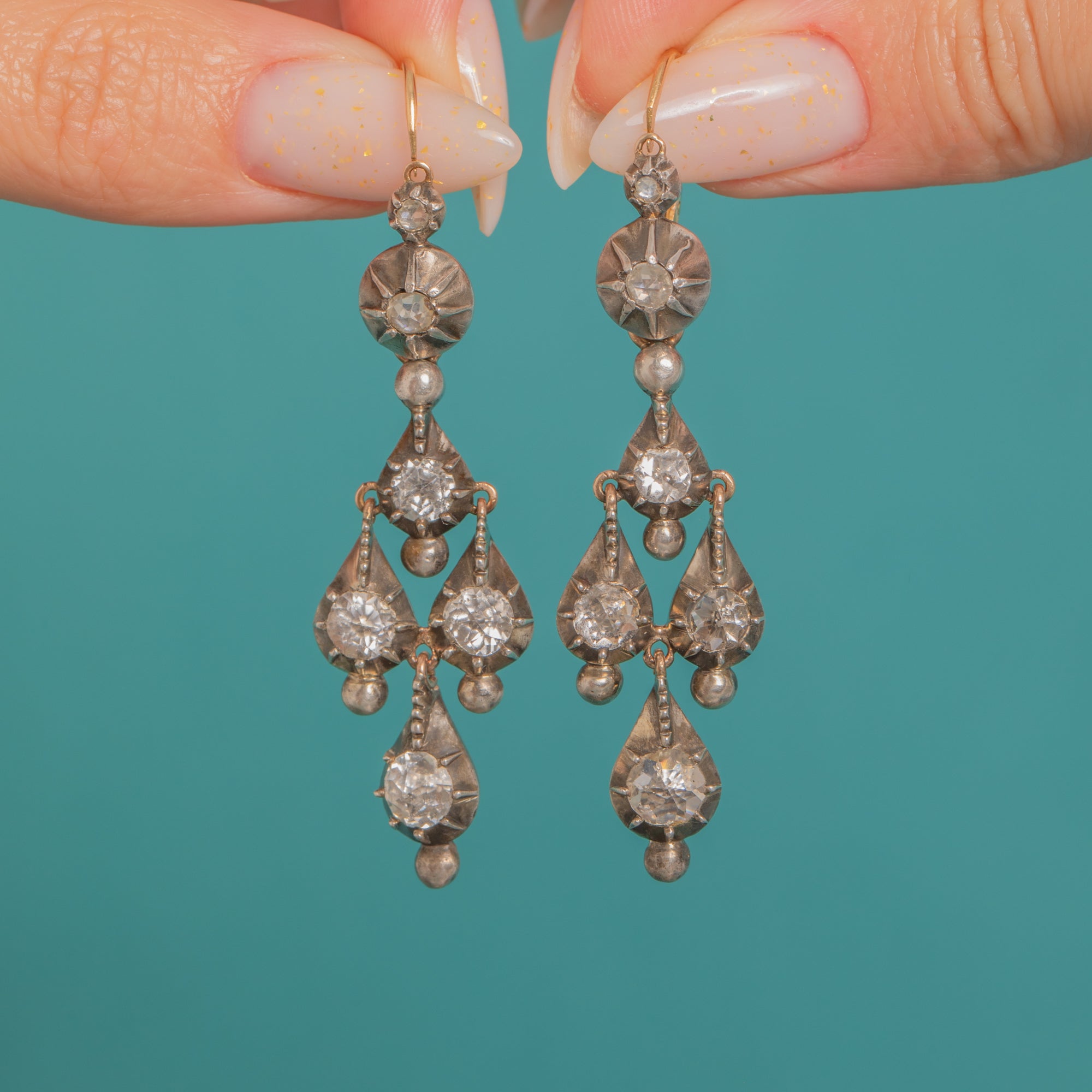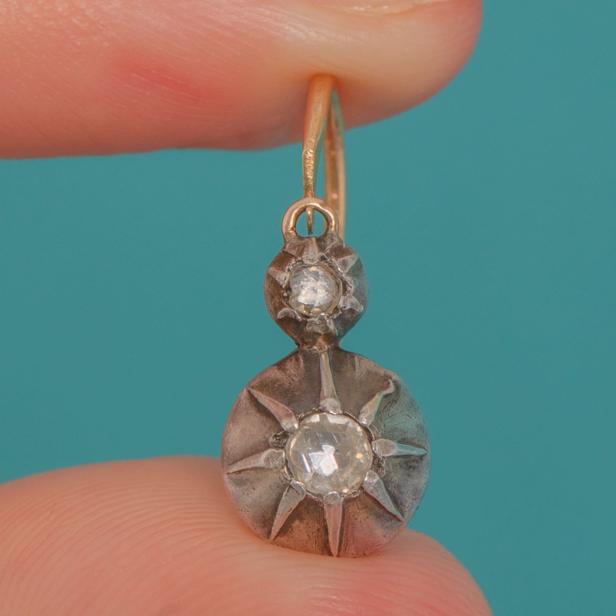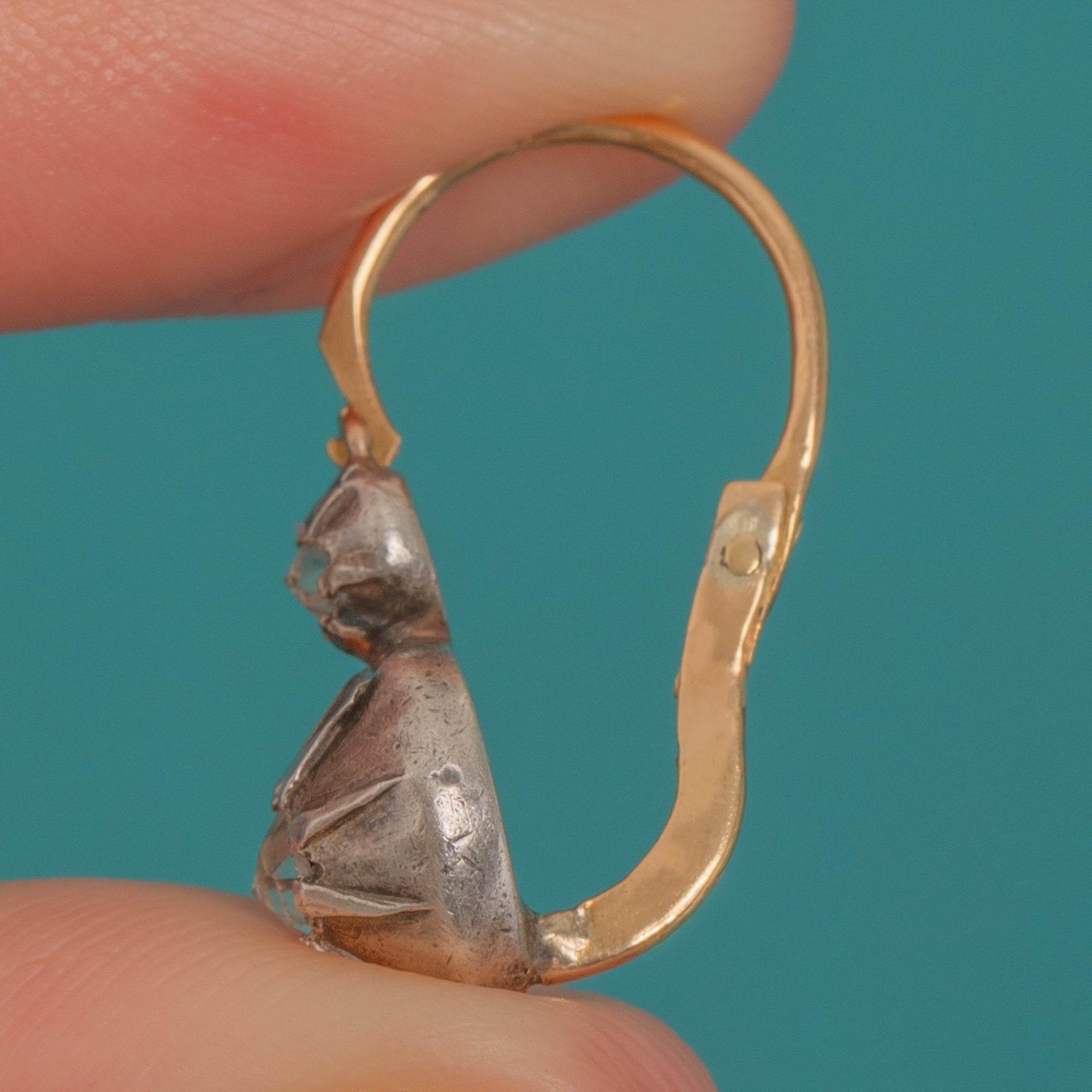 EXCELLENT: Bright stones with light surface wear commensurate with age; no notable chips seen to the eye. The Silver settings and 18ct Gold backs show gentle, even patina with minor high-point wear to the Gold on the reverse. Articulation and fittings are secure, and the earrings have been well cared for.