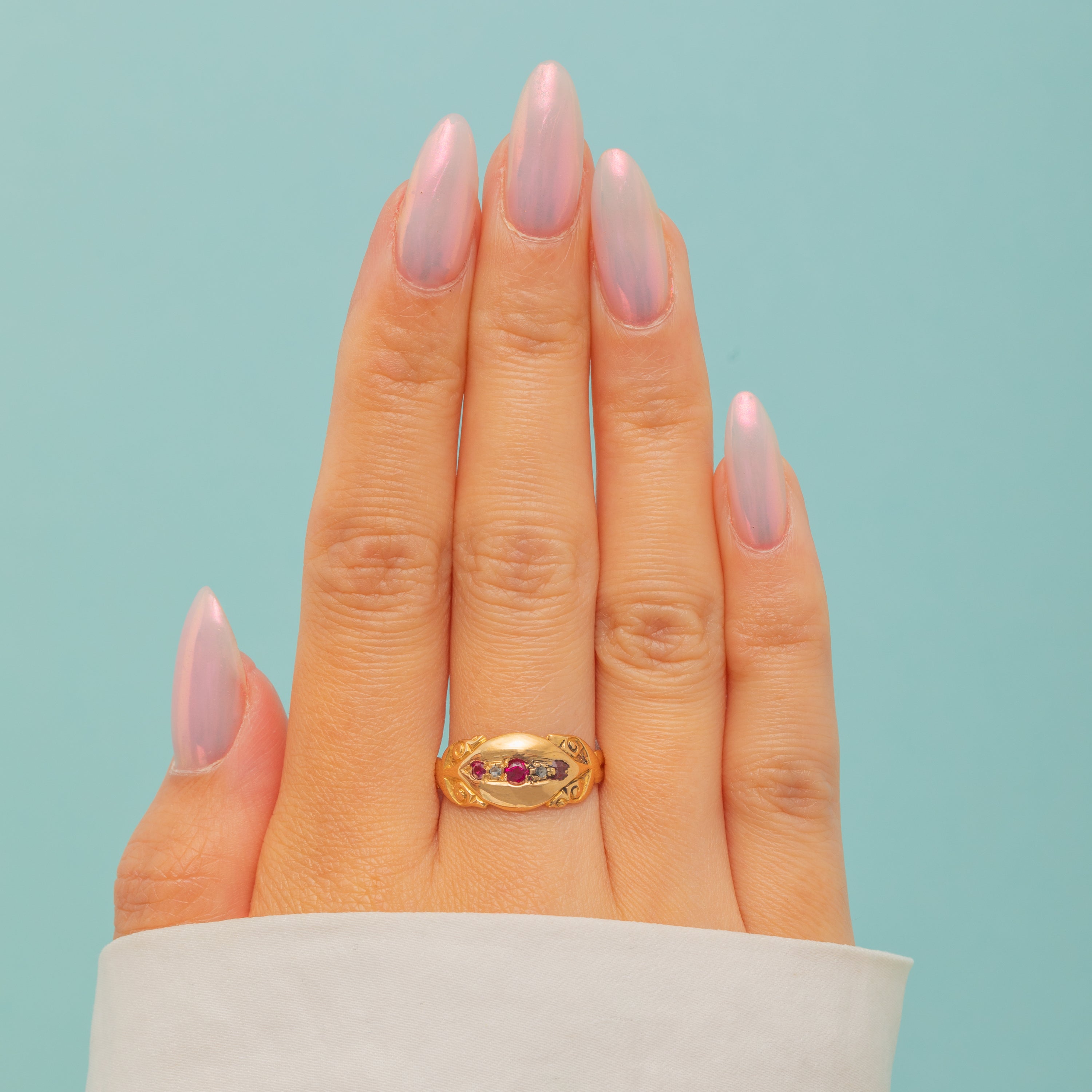 VERY GOOD-EXCELLENT: Each gemstone is radiant and secure in its setting. The Gold is bright and buttery, and the band is sturdy. There are some signs of wear to the ring, including minor dings and some scratches inside the band, which will not be visible while the ring is worn. Fully hallmarked to 1913 and comfortable to wear, this antique ring is a must-have!