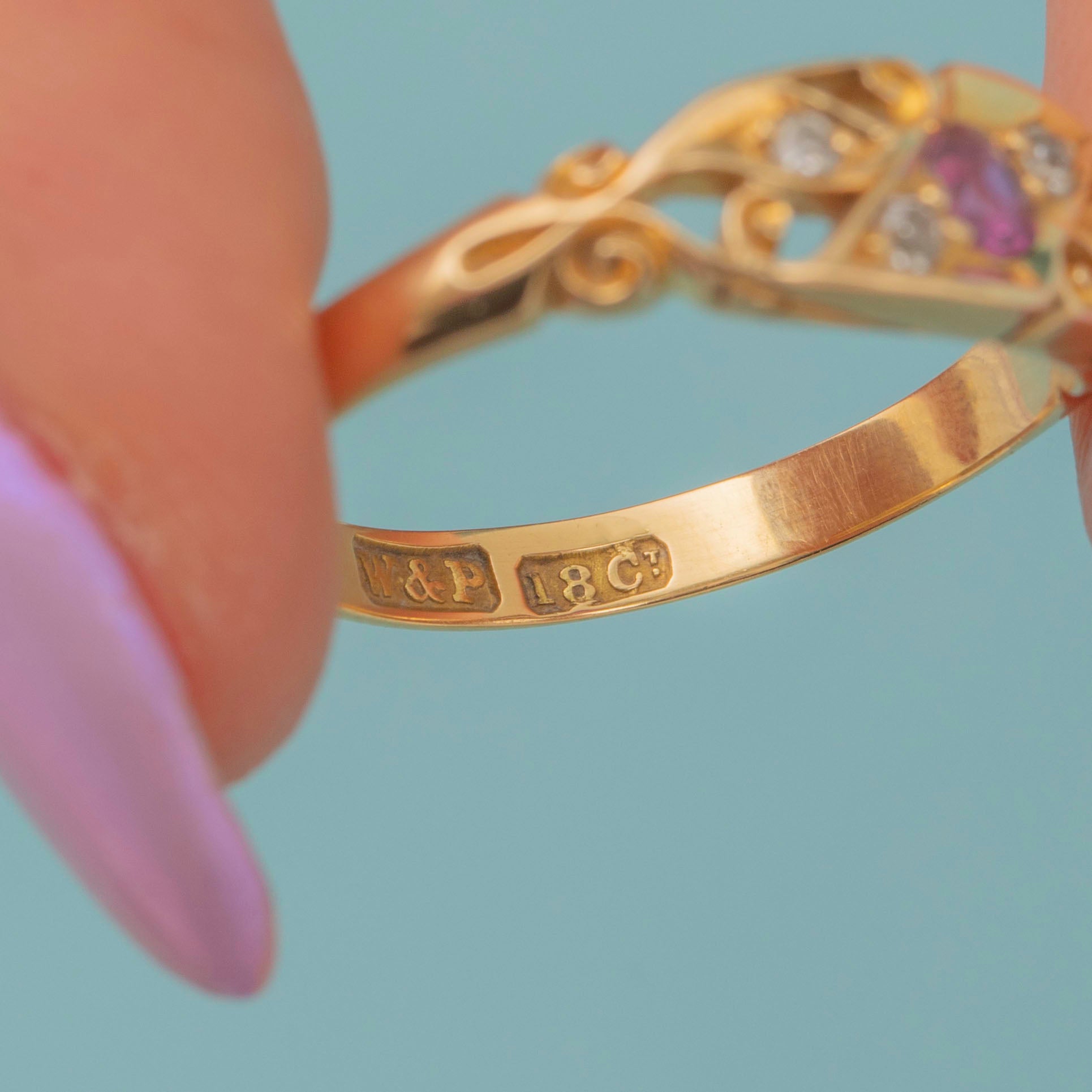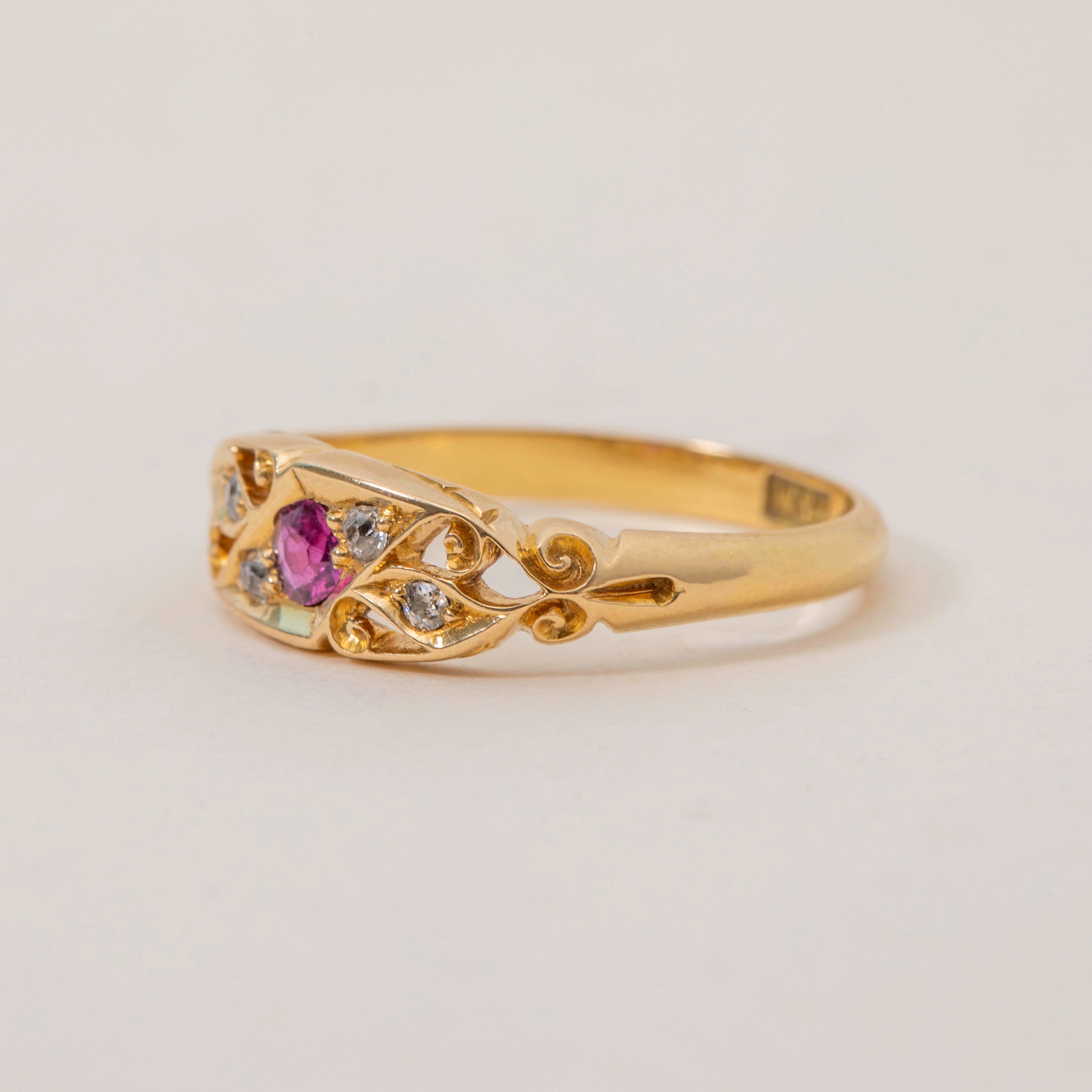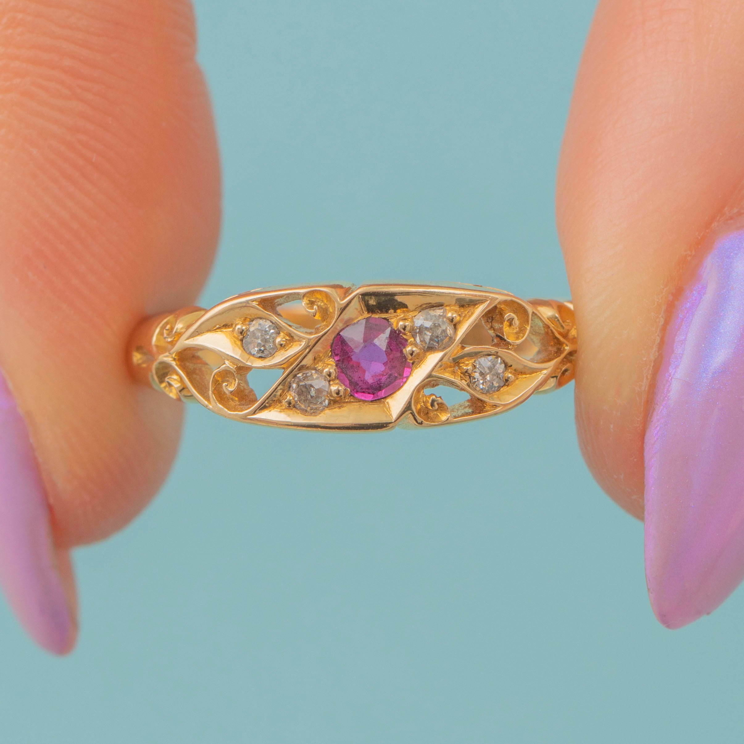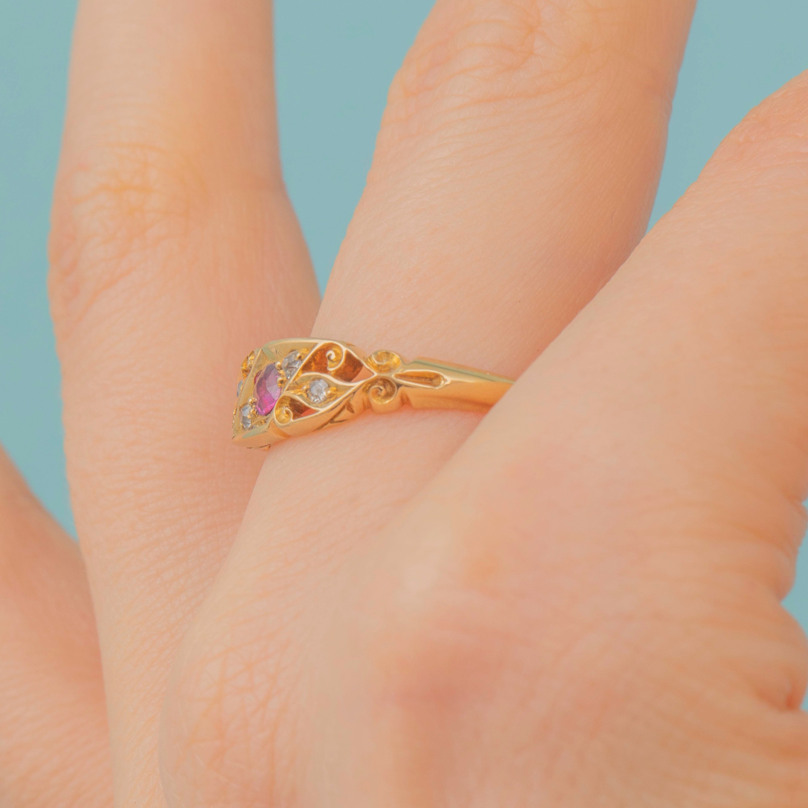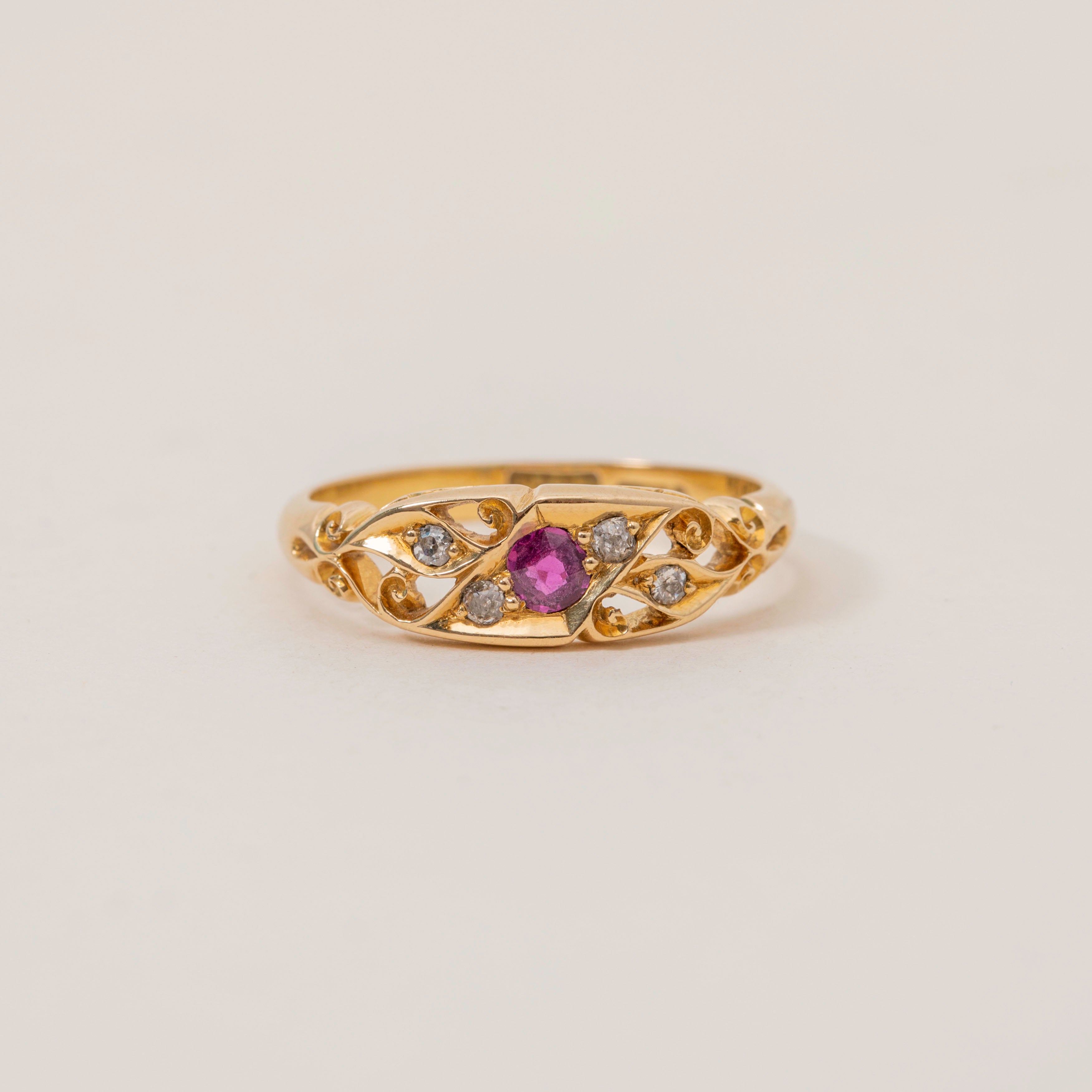 A sublime antique 18ct Gold Ruby Diamond openwork gypsy ring! This Victorian beauty is inlaid with a juicy 0.11ct Ruby, boasting a delectable fuchsia hue, flanked by four twinkling Diamonds.