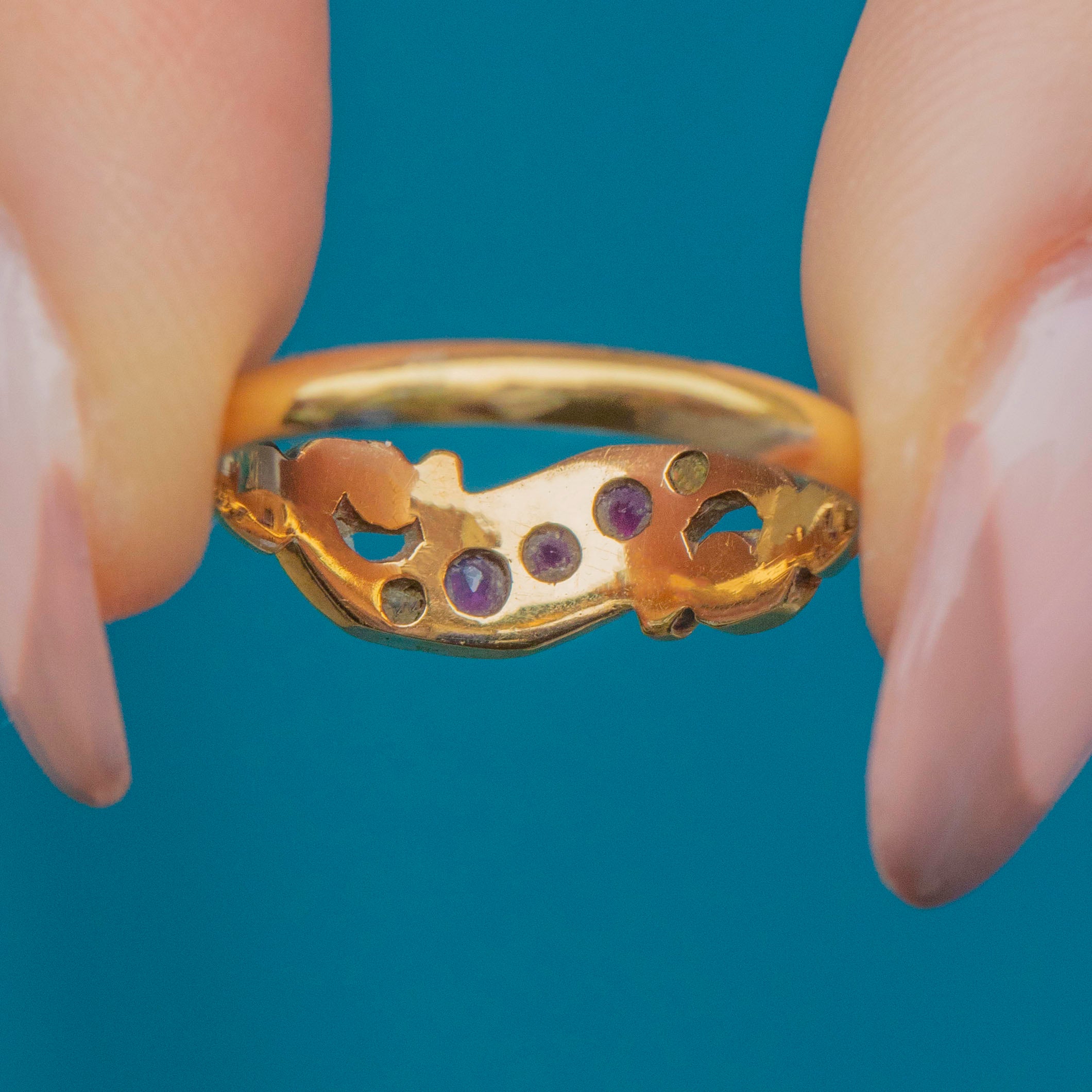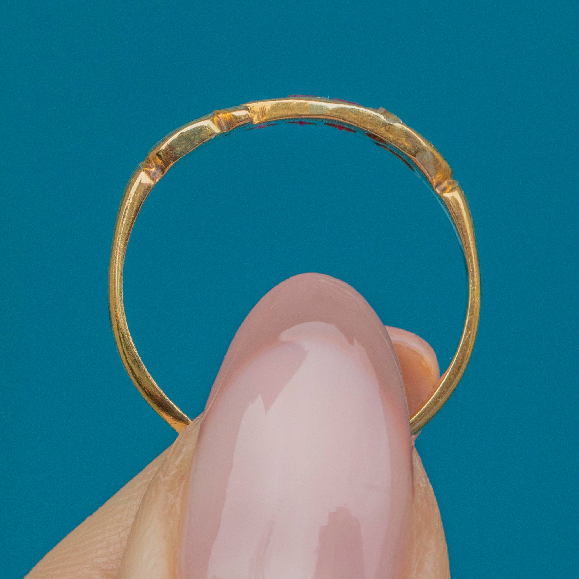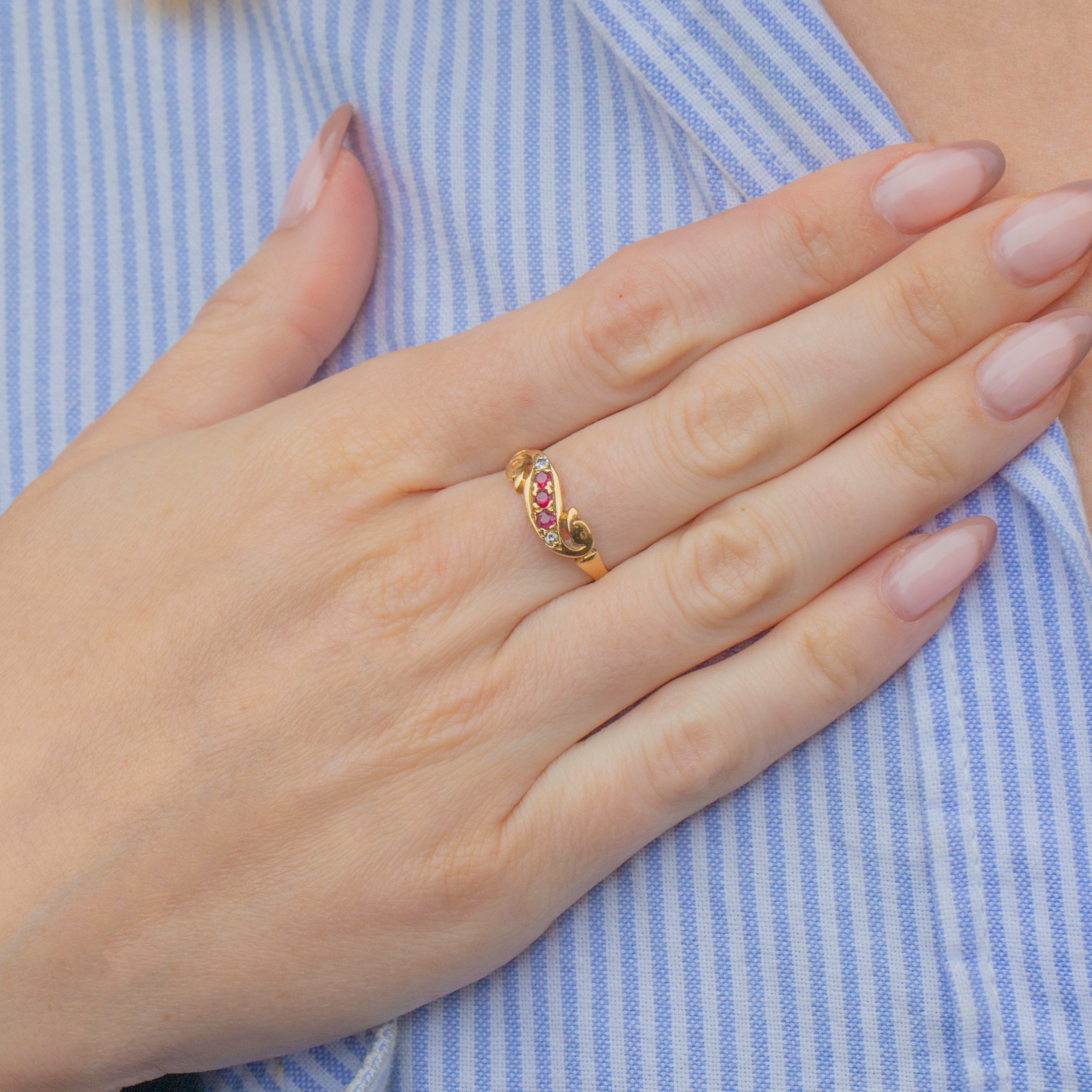 EXCELLENT. This antique 18ct Gold Ruby Diamond ring is in exemplary condition. The Gold is brightly saturated and the details have all remained defined. The gemstones are securely set and free from fleabites or abrasions. This lovely Victorian ring promises decades more of wear and enjoyment!