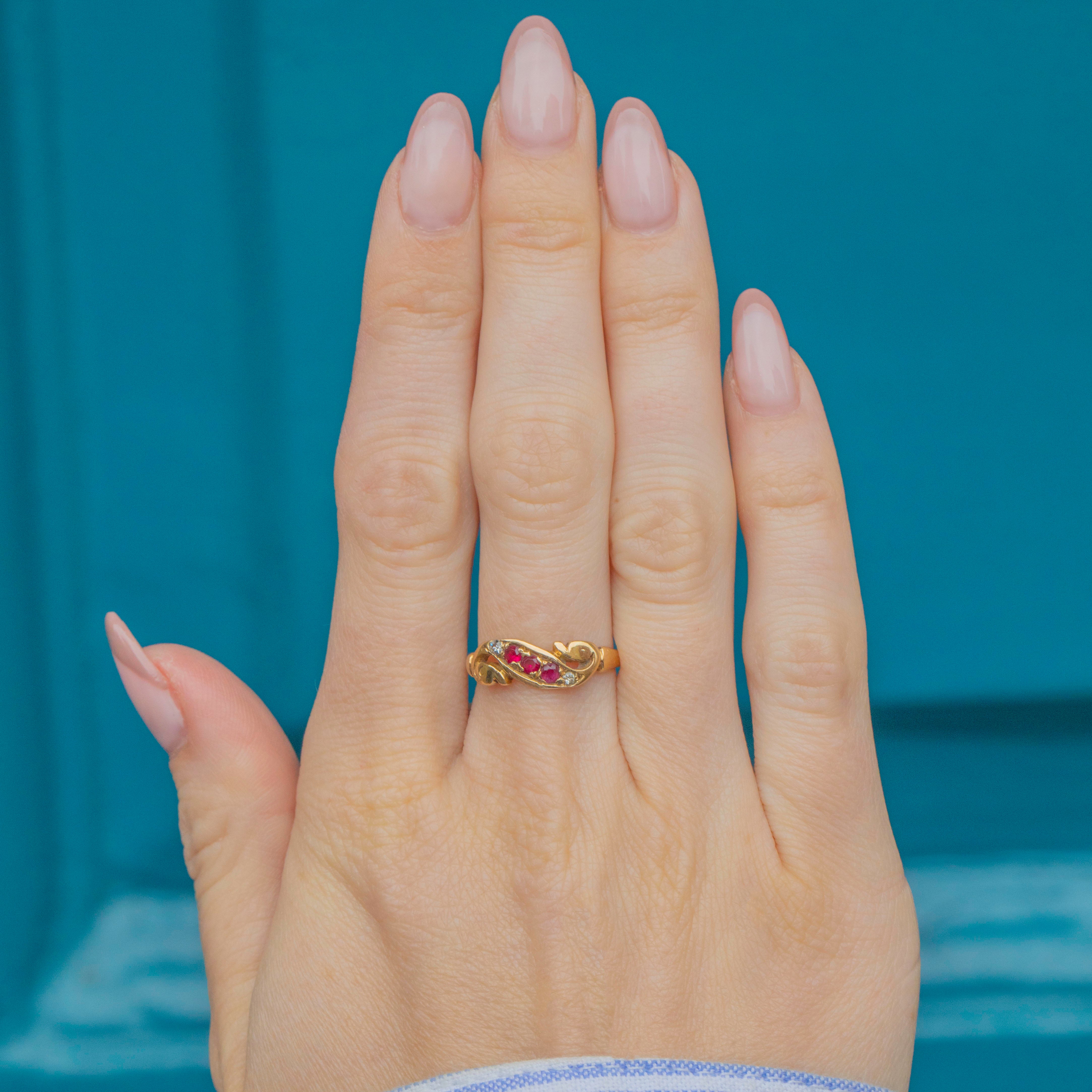 With sweeping curved lines embellished with dainty scarlett Rubies and crisp white Diamonds, this decorative antique 18ct Gold Ruby Diamond ring has a captivating regal appeal!