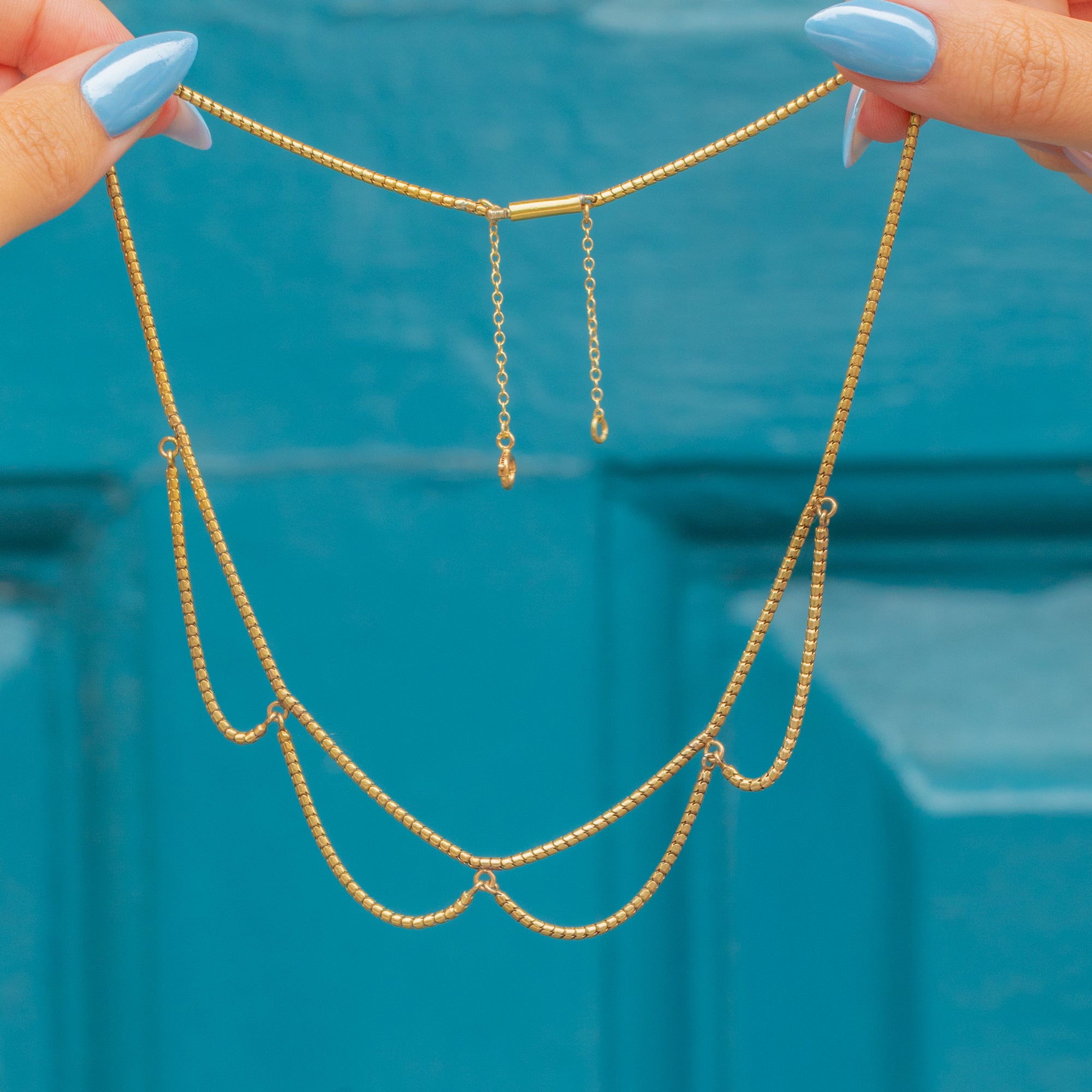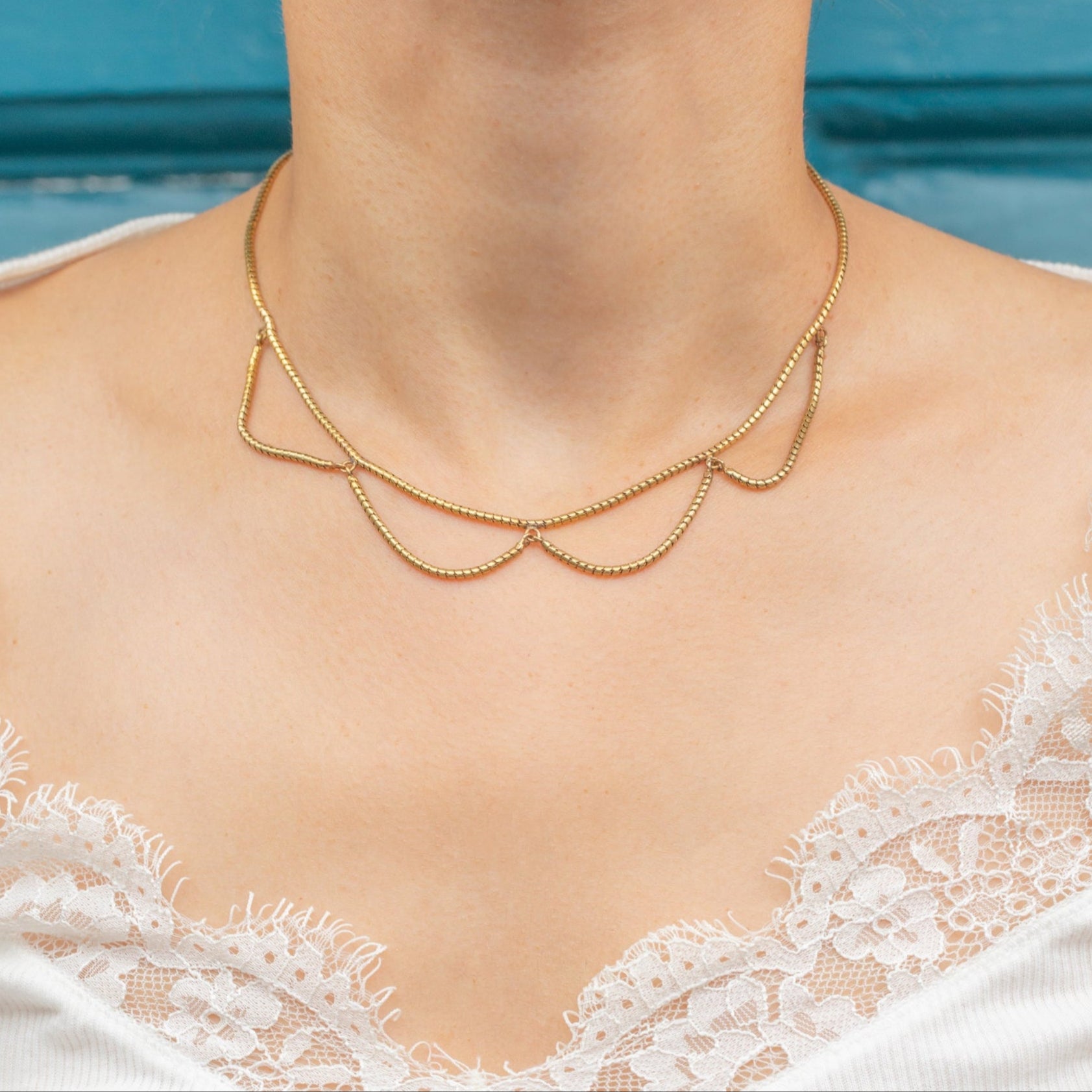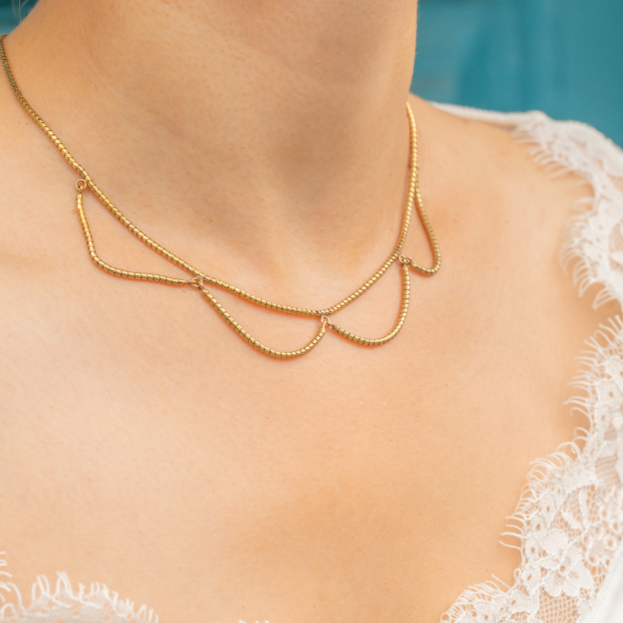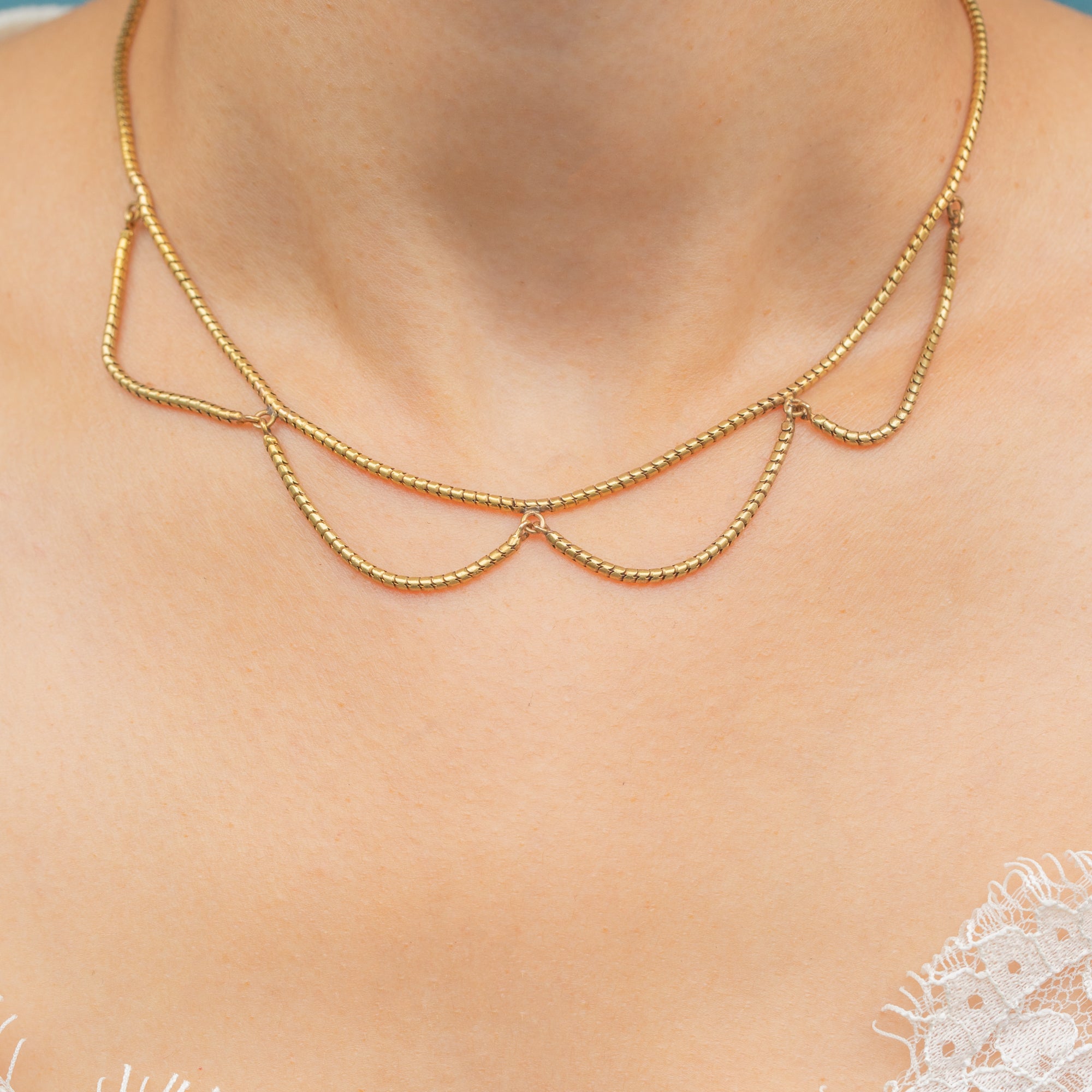 Crafted entirely from bright and buttery solid 18ct Gold, this chic Victorian snake chain has been formed into a charming swag design, curving gracefully as it adorns your décolletage.